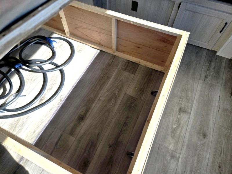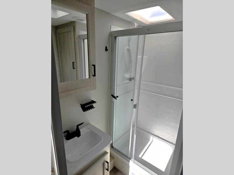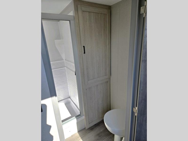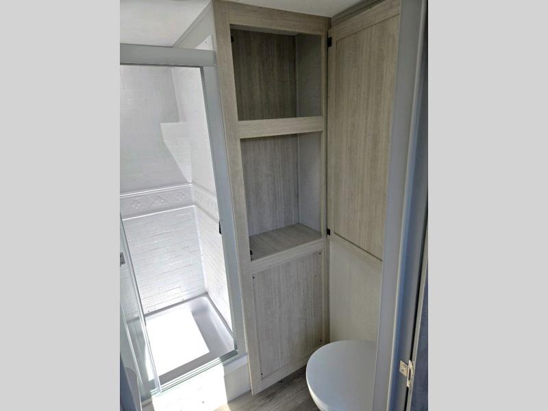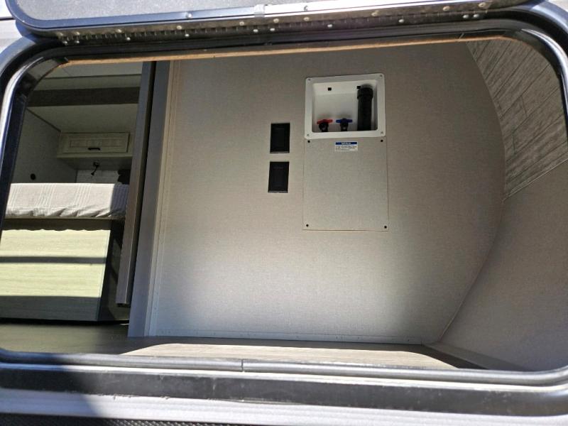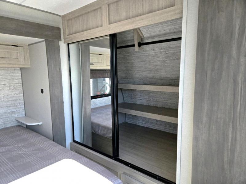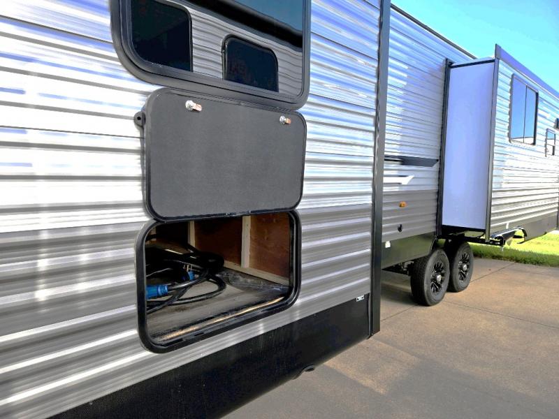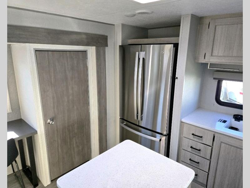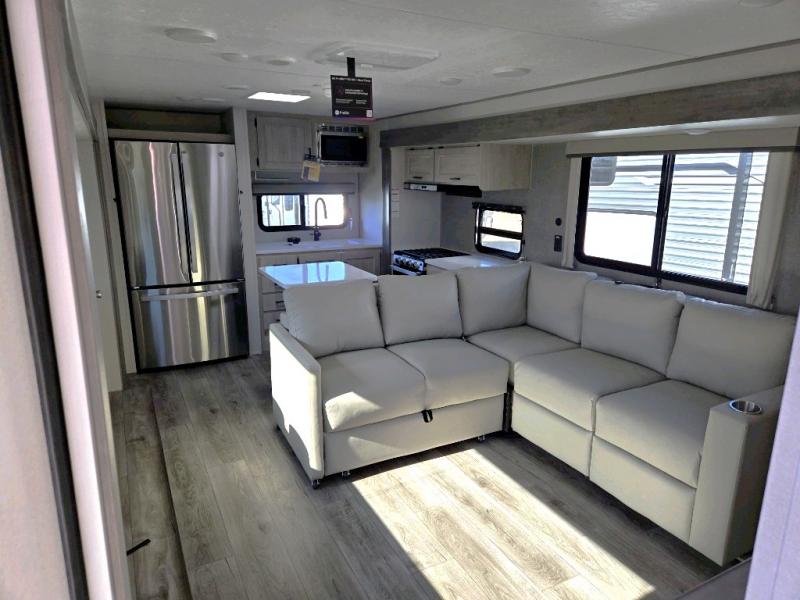 This travel trailer rear kitchen will make you feel like home is on the road, featuring a spacious pantry, residential refrigerator, overhead cabinets, microwave, kitchen island, and sliding desk/table for all your cooking and dining needs. The dining counter and chairs provide the perfect place to enjoy meals with family and friends. The living room boasts a comfortable sectional sofa and TV/entertainment center for relaxing and having fun with your favorite person, whether you're watching your favorite movie, playing games, or simply enjoying quality time with loved ones, this space has everything you need. Moreover, the full bathroom is super complete with a wardrobe, linen closet, and all the amenities you need to freshen up and feel at home. Plus, you and your partner will love this front bedroom, since it is private, featuring a comfortable RV queen bed and a dresser ideal for keeping your clothes organized. There are also overhead cabinets, a closet, and washer/dryer prep for all your laundry needs, making this space the perfect place to rest and recharge after a long day of adventure. Outside, you'll appreciate the two awnings for shade and protection from the elements, as well as the exterior storage for all your gear and toys.