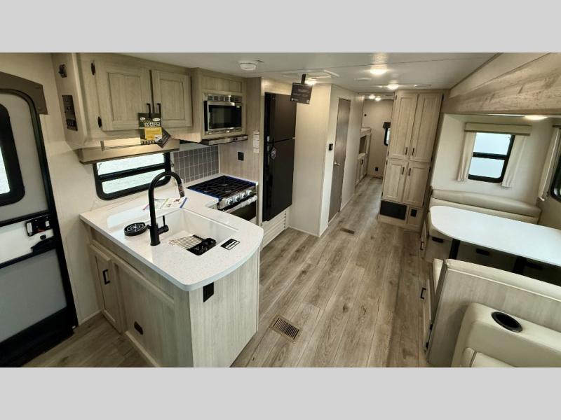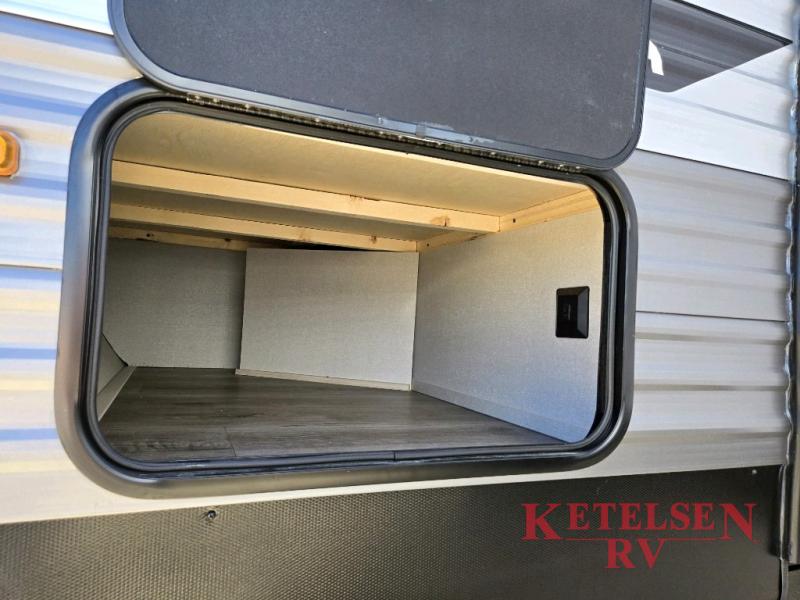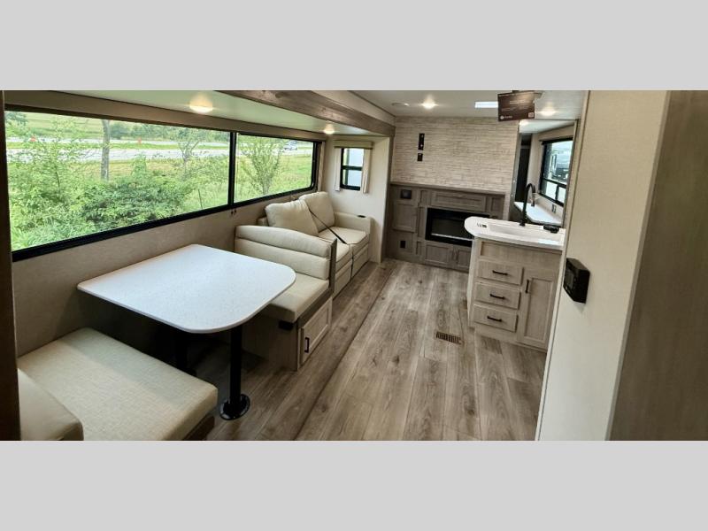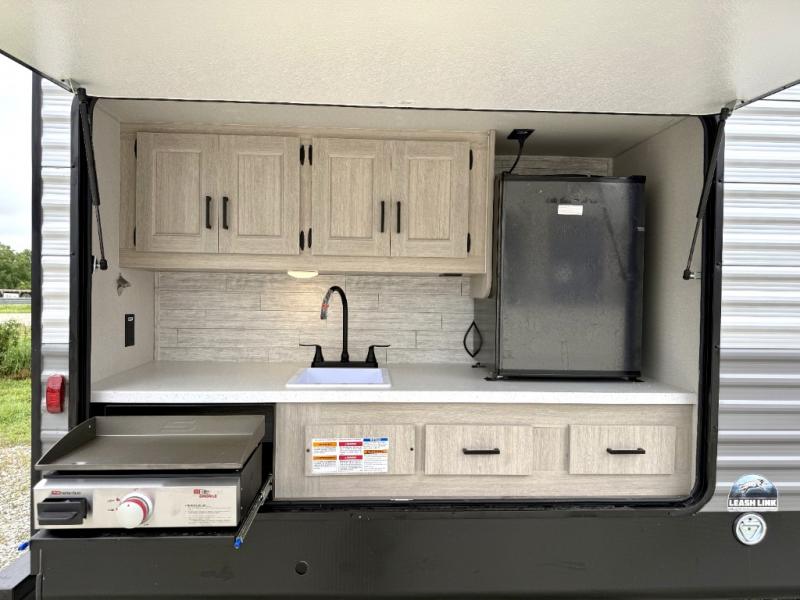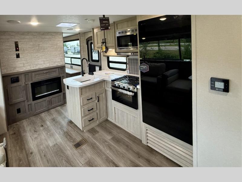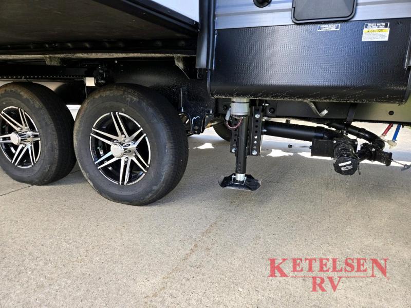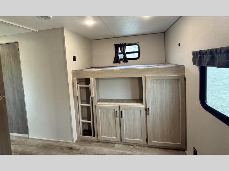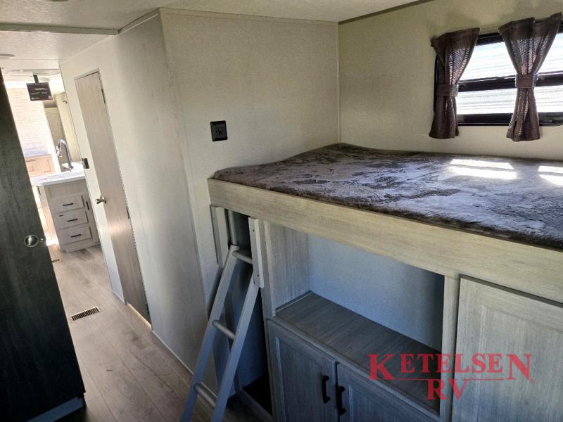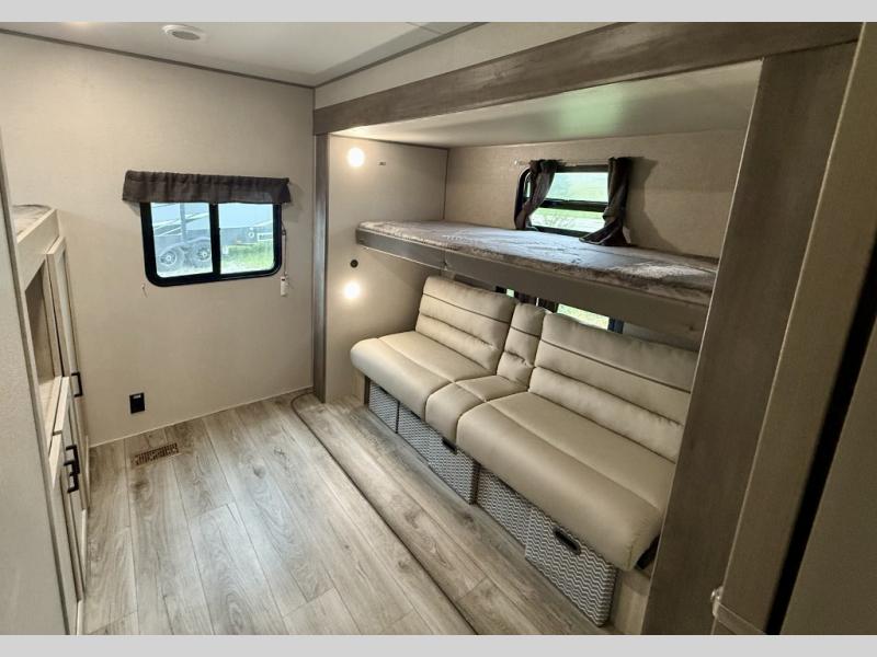 This family-friendly trailer offers lots of floor space thanks to the triple slides throughout! You and your family will love the combined living and kitchen area with a slide out booth dinette and a sofa with drink holders. The L-shaped kitchen counter allows the cook to make meals without moving for anyone trying to get to the full bathroom or the rear bunkhouse. The kids will have their own privacy, two bunk beds, a jack knife sofa with storage totes below plus a TV/wardrobe cabinet. The front private bedroom allows you to sleep like royalty, and offers a large closet for your clothing and another closet prepped for a washer/dryer. And don't forget about the full size camper kitchen and the 21' power awning with multicolor LED lights when you are outside.