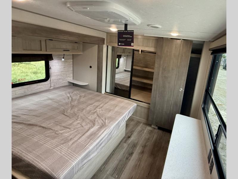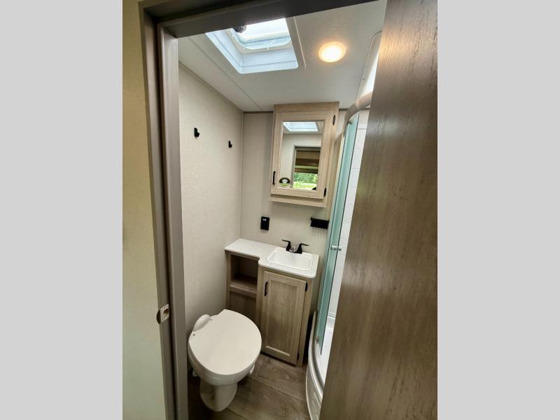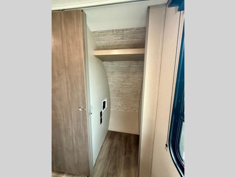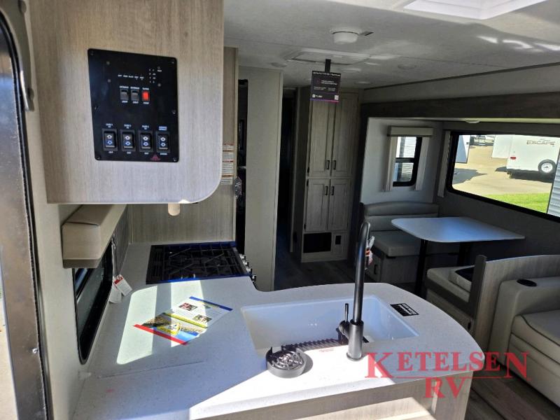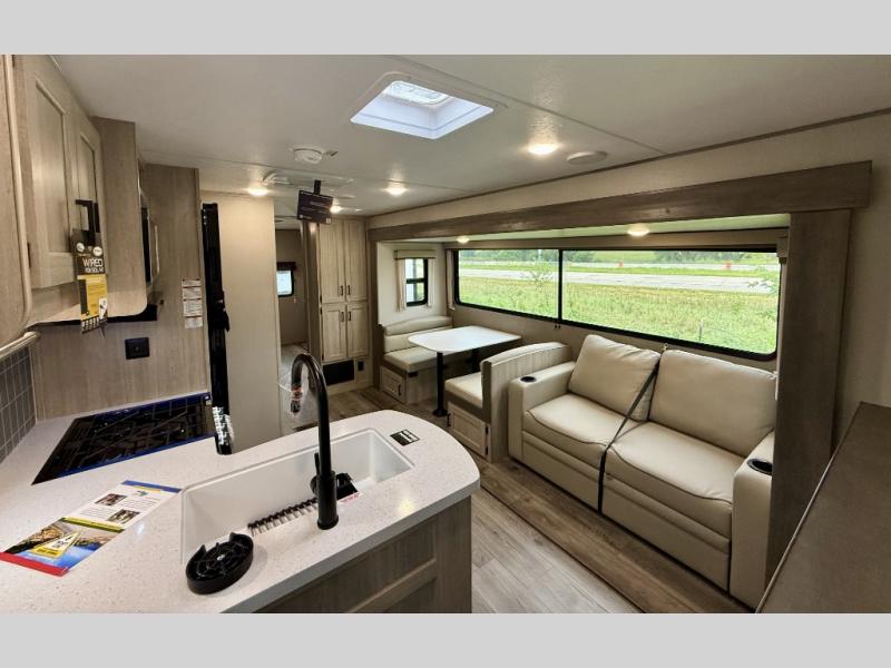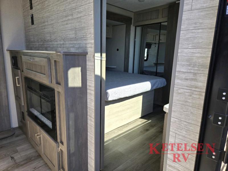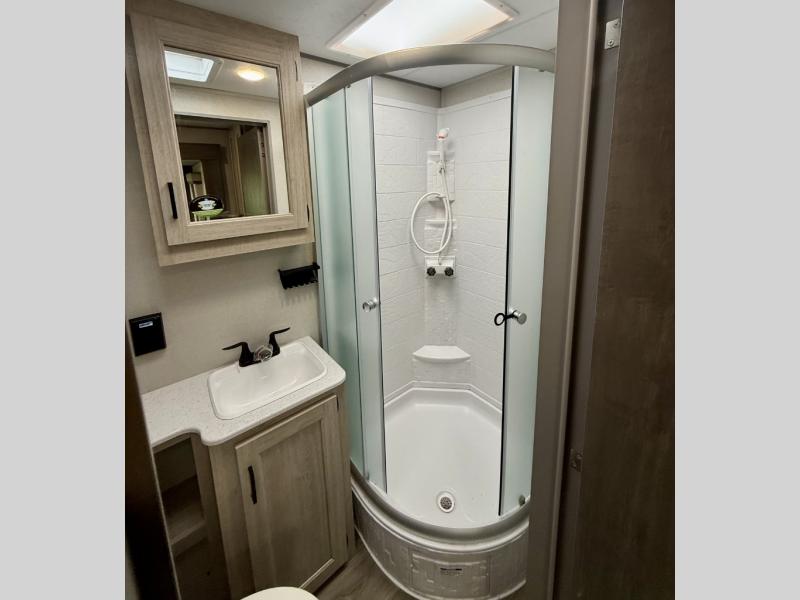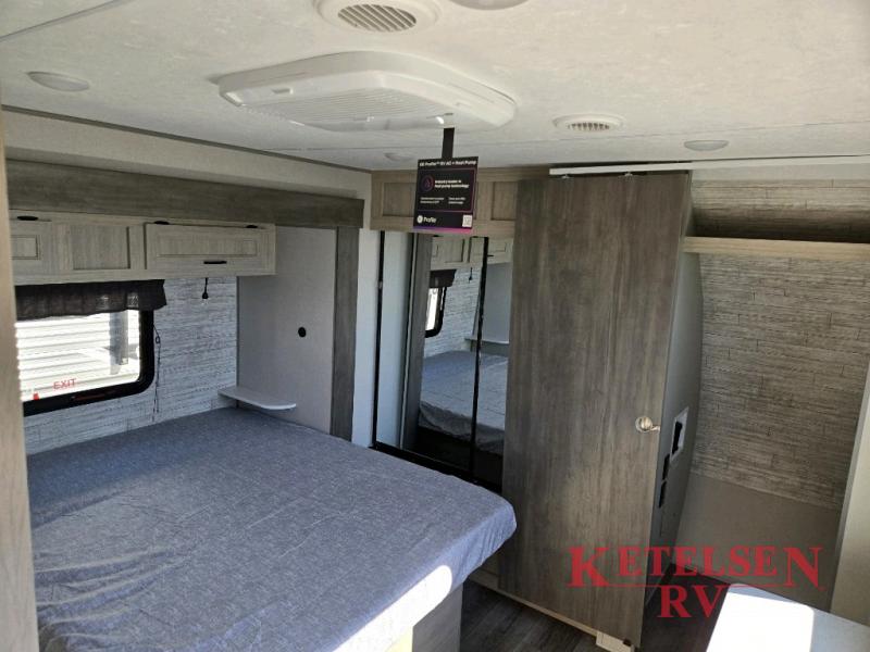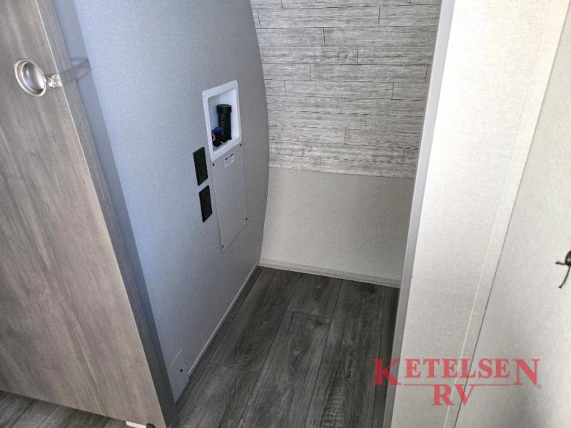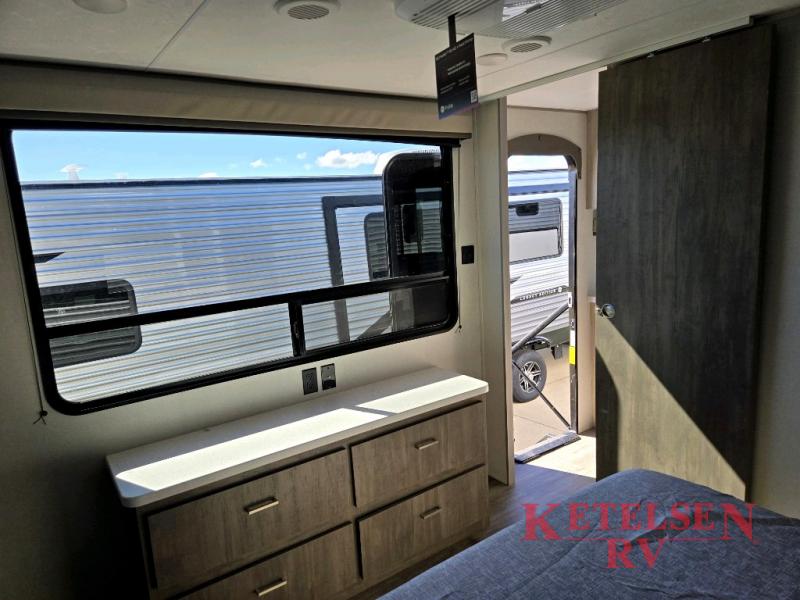 This family-friendly trailer offers lots of floor space thanks to the triple slides throughout! You and your family will love the combined living and kitchen area with a slide out booth dinette and a sofa with drink holders. The L-shaped kitchen counter allows the cook to make meals without moving for anyone trying to get to the full bathroom or the rear bunkhouse. The kids will have their own privacy, two bunk beds, a jack knife sofa with storage totes below plus a TV/wardrobe cabinet. The front private bedroom allows you to sleep like royalty, and offers a large closet for your clothing and another closet prepped for a washer/dryer. And don't forget about the full size camper kitchen and the 21' power awning with multicolor LED lights when you are outside.