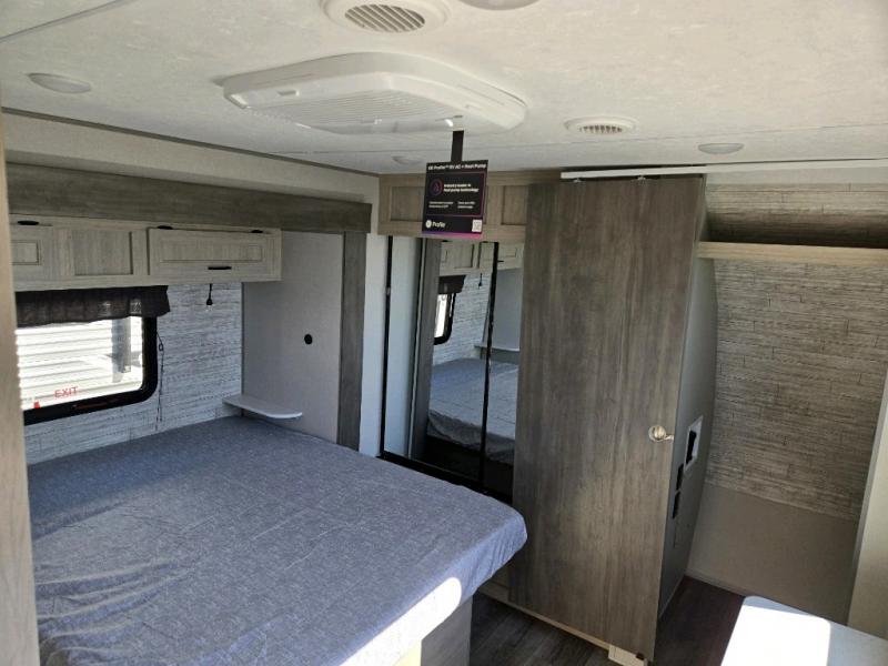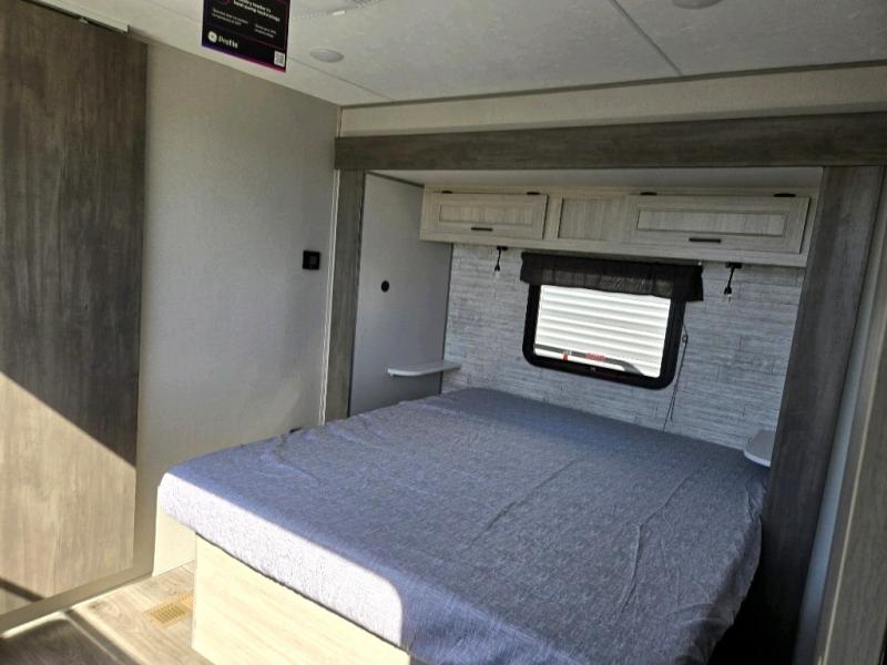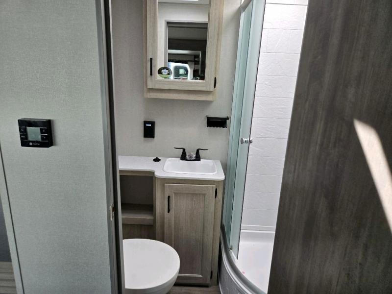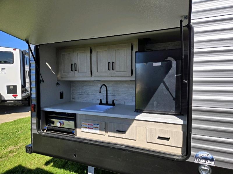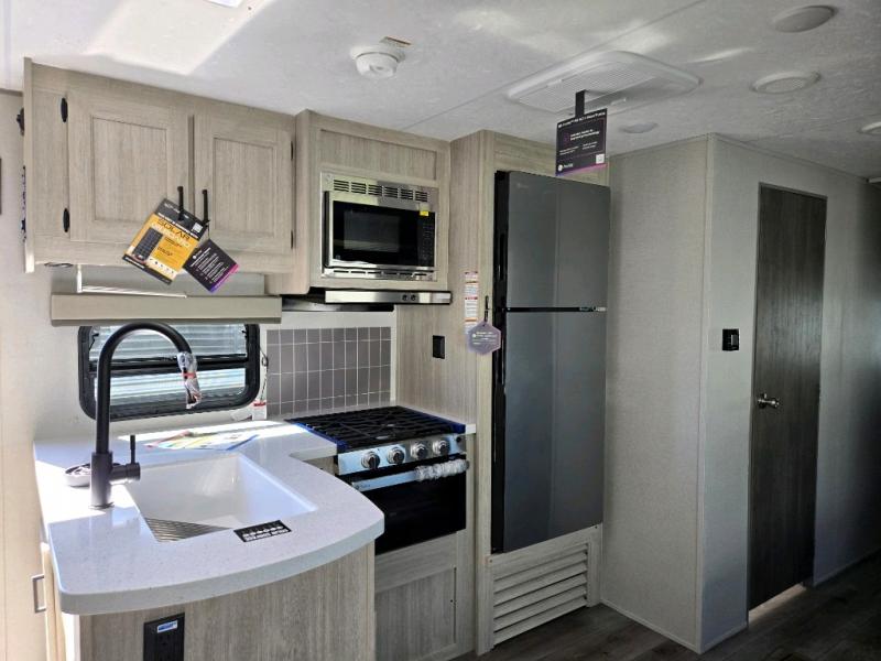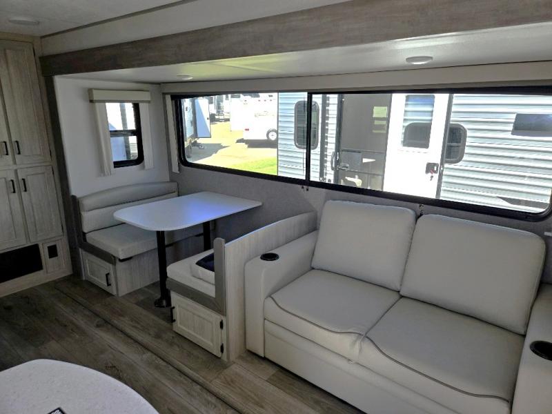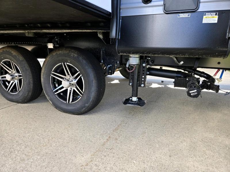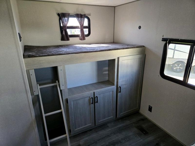 This family-friendly trailer offers lots of floor space thanks to the triple slides throughout! You and your family will love the combined living and kitchen area with a slide out booth dinette and a sofa with drink holders. The L-shaped kitchen counter allows the cook to make meals without moving for anyone trying to get to the full bathroom or the rear bunkhouse. The kids will have their own privacy, two bunk beds, a jack knife sofa with storage totes below plus a TV/wardrobe cabinet. The front private bedroom allows you to sleep like royalty, and offers a large closet for your clothing and another closet prepped for a washer/dryer. And don't forget about the full size camper kitchen and the 21' power awning with multicolor LED lights when you are outside.