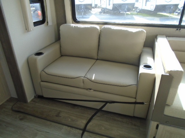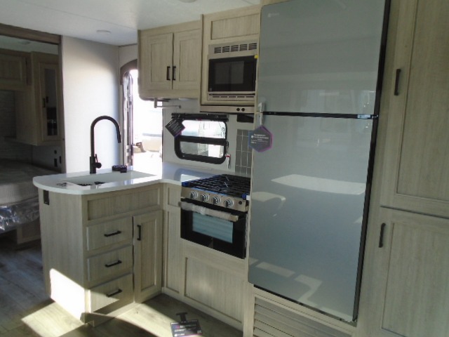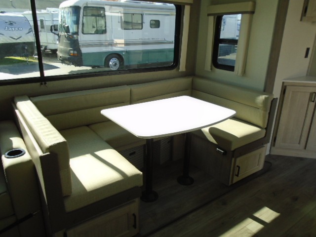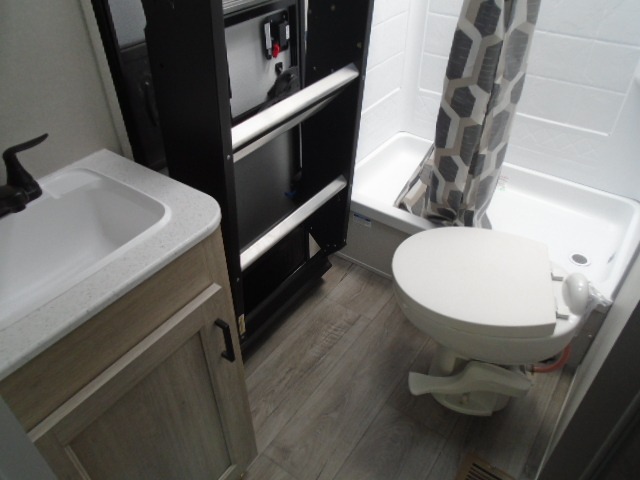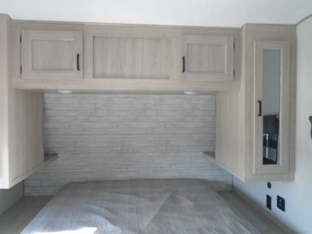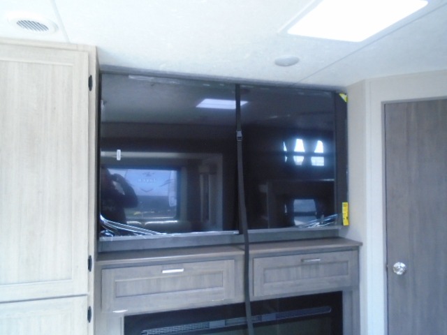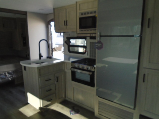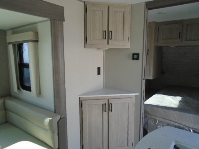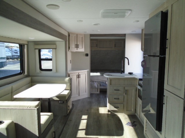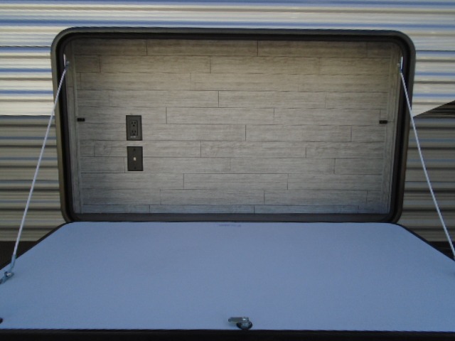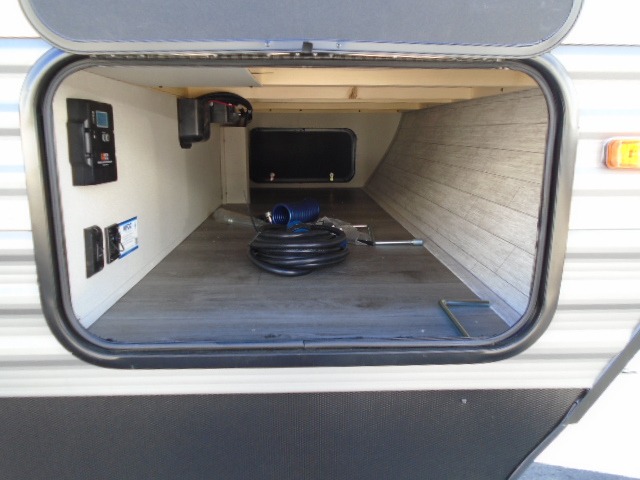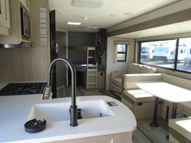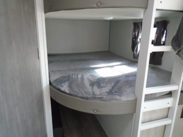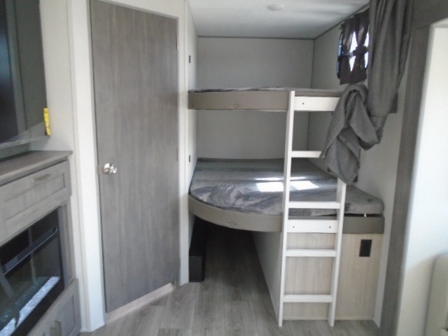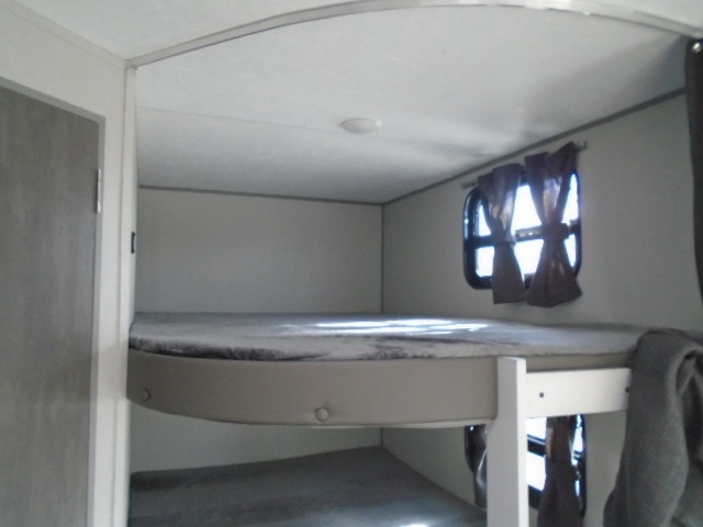 This travel trailer is perfect for your whole crew! Once you arrive at the campground, you can put out the 21' electric awning and start lunch on the exterior camper kitchen with a griddle and mini fridge. There is also a pass-thru storage plus additional exterior storage with a fold-down table and a TV hookup for added convenience. And since there are dual entry doors found on this unit, you can enter in through the full bath in the back, or the main living area towards the front! A large slide provides ample space to move about, and you'll find a trundle sofa and U-shaped dinette here for cozy seating and sleeping space. Speaking of sleeping, there is a front RV queen bed in the bedroom plus double-size bunks in the back for guests!