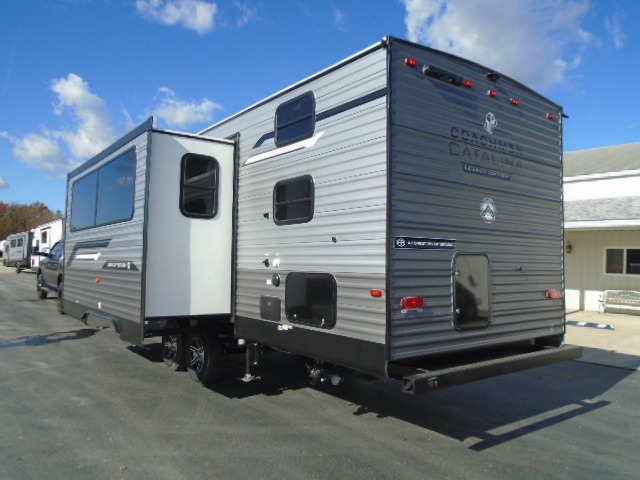 Each Catalina Legacy travel trailer by Coachmen is constructed with a cambered structural steel I-beam frame for added strength and support, plus an enclosed and fully sealed corrugated underbelly to extend your camping season. There is also a seamless Alpha roof membrane, R-7 insulation throughout, full length frame outriggers, plus many more durable construction materials. You will love the 6' 9" interior height, along with Congoleum woodplank linoleum flooring, solid surface kitchen countertops, and hard valance window treatments. Choose a Catalina Legacy today!