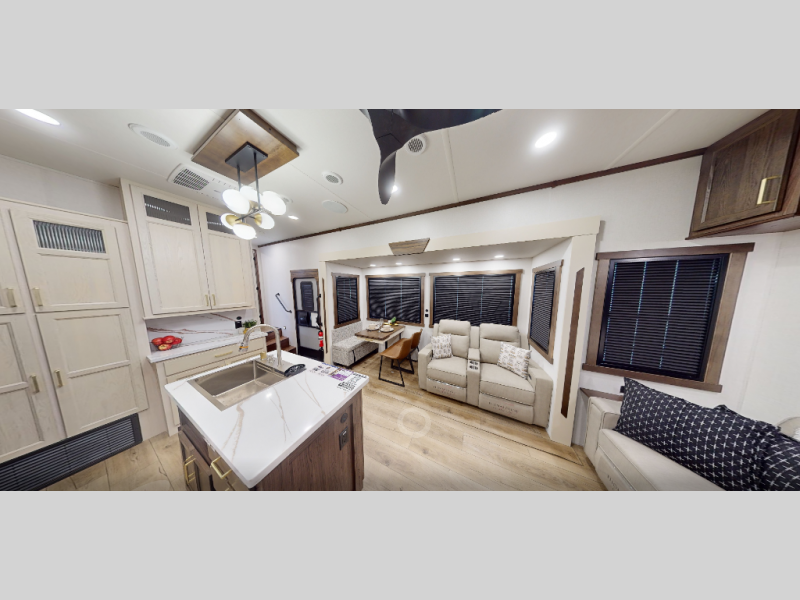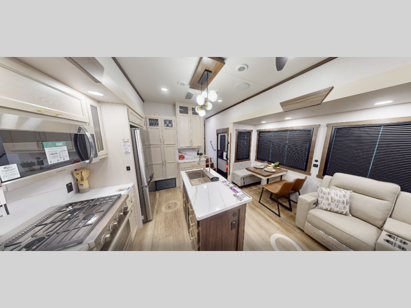 At the front of the 29RL fifth wheel, you’ll find the inviting front bedroom featuring a 72" x 80" king bed in a slide-out, offering plenty of room for a restful night’s sleep. This bedroom also includes a wardrobe, shelving, and a dresser with a TV above, providing ample storage for clothing and personal items. Moving down the hall, the full bathroom offers a spacious 48" x 30" shower with a seat for added comfort, along with linen shelves for extra storage. Toward the rear, the open kitchen and living area we have dual opposing slides that create a roomy, comfortable environment. One slide features a Murphy pantry, a 3-burner gas oven, and a 20-cu. ft. stainless steel refrigerator with overhead cabinets, equipping the chef on board with all the essentials. The central island includes a sink and handy hutch for added convenience. Across the way, the opposite slide houses reclining seats, a table with chairs, and a bench, perfect for dining or relaxing after a long day. At the very back, a hide-a-bed sofa offers additional seating and can easily convert into extra sleeping space when needed, making this layout both functional and inviting for any adventure.