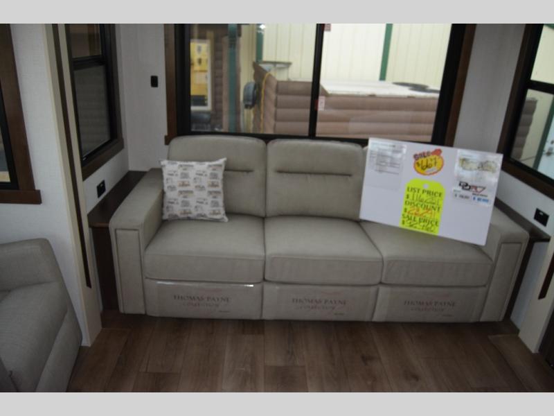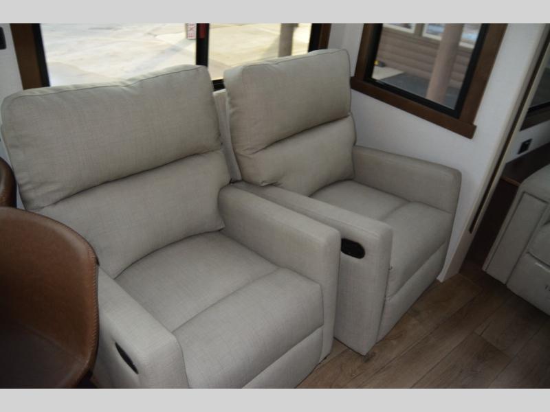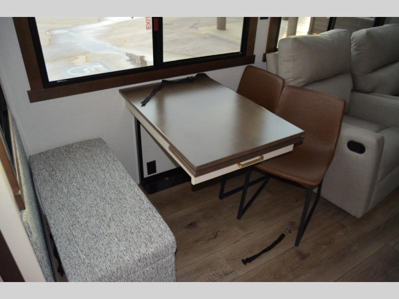 At the front of the 29RL fifth wheel, you’ll find the inviting front bedroom featuring a 72" x 80" king bed in a slide-out, offering plenty of room for a restful night’s sleep. This bedroom also includes a wardrobe, shelving, and a dresser with a TV above, providing ample storage for clothing and personal items. Moving down the hall, the full bathroom offers a spacious 48" x 30" shower with a seat for added comfort, along with linen shelves for extra storage. Toward the rear, the open kitchen and living area we have dual opposing slides that create a roomy, comfortable environment. One slide features a Murphy pantry, a 3-burner gas oven, and a 20-cu. ft. stainless steel refrigerator with overhead cabinets, equipping the chef on board with all the essentials. The central island includes a sink and handy hutch for added convenience. Across the way, the opposite slide houses reclining seats, a table with chairs, and a bench, perfect for dining or relaxing after a long day. At the very back, a hide-a-bed sofa offers additional seating and can easily convert into extra sleeping space when needed, making this layout both functional and inviting for any adventure.