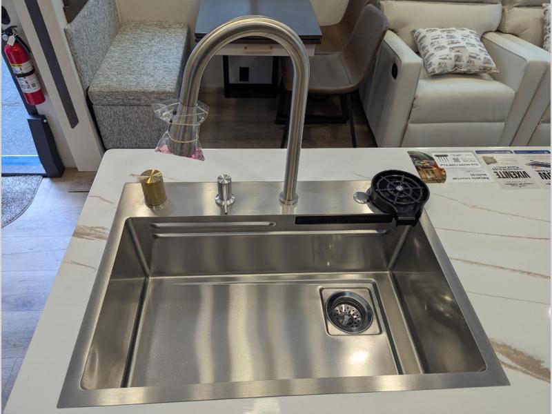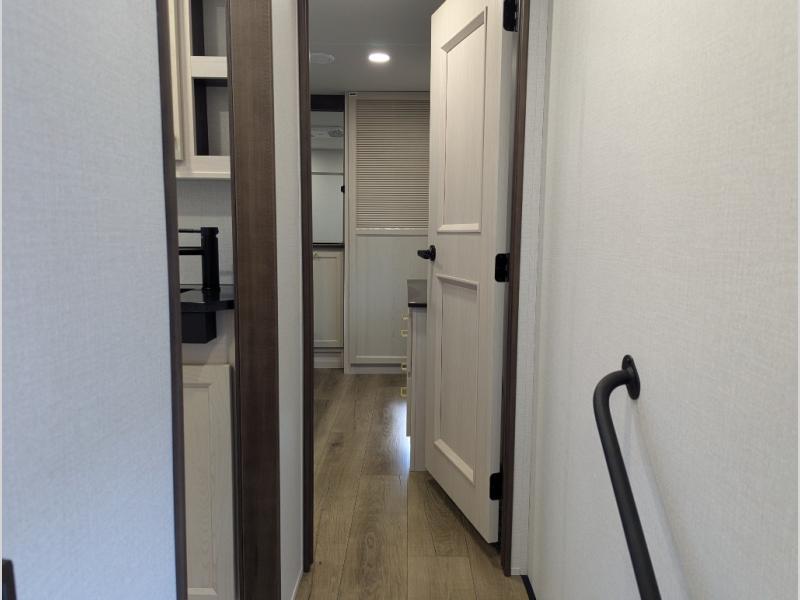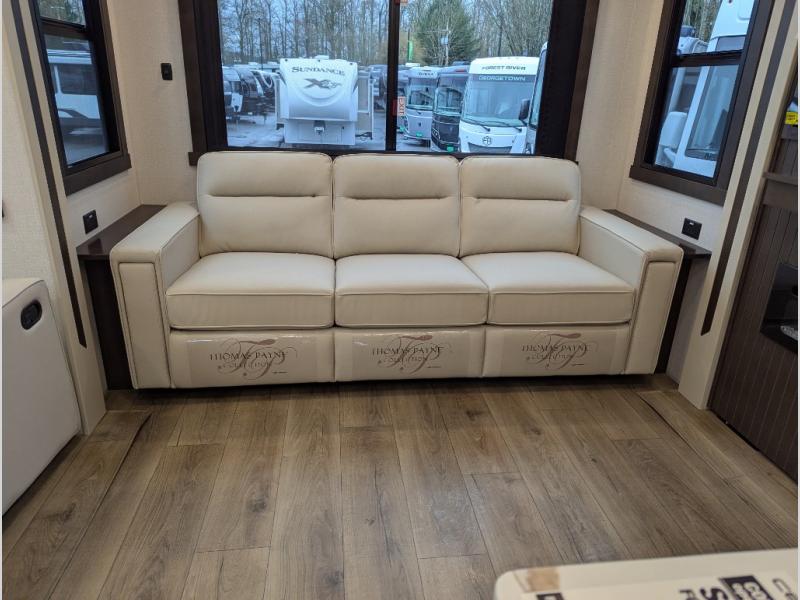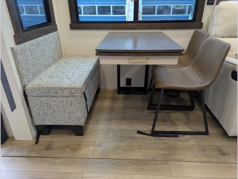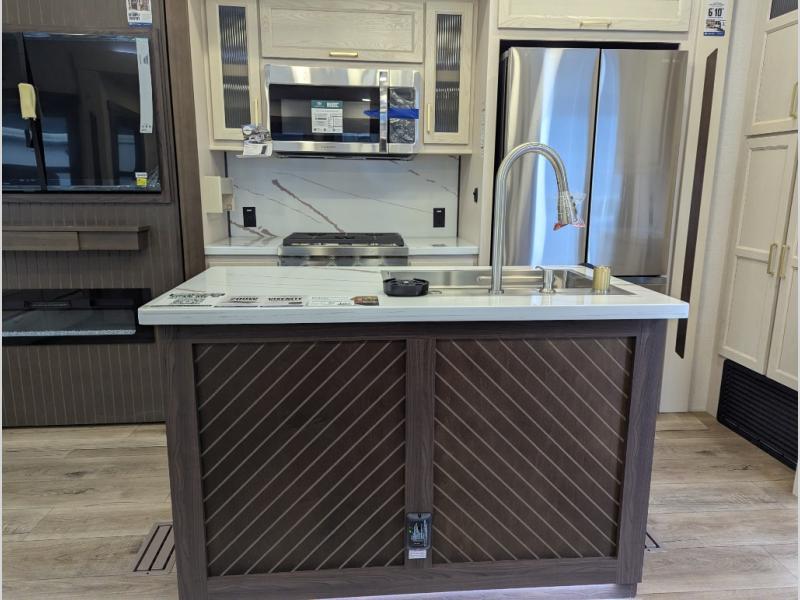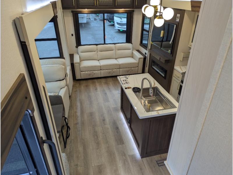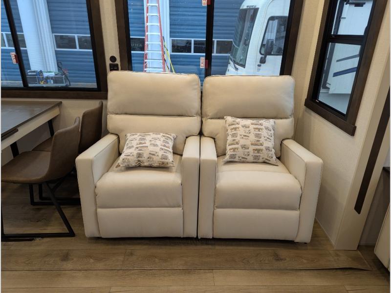 At the front of the 29RL fifth wheel, you’ll find the inviting front bedroom featuring a 72" x 80" king bed in a slide-out, offering plenty of room for a restful night’s sleep. This bedroom also includes a wardrobe, shelving, and a dresser with a TV above, providing ample storage for clothing and personal items. Moving down the hall, the full bathroom offers a spacious 48" x 30" shower with a seat for added comfort, along with linen shelves for extra storage. Toward the rear, the open kitchen and living area we have dual opposing slides that create a roomy, comfortable environment. One slide features a Murphy pantry, a 3-burner gas oven, and a 20-cu. ft. stainless steel refrigerator with overhead cabinets, equipping the chef on board with all the essentials. The central island includes a sink and handy hutch for added convenience. Across the way, the opposite slide houses reclining seats, a table with chairs, and a bench, perfect for dining or relaxing after a long day. At the very back, a hide-a-bed sofa offers additional seating and can easily convert into extra sleeping space when needed, making this layout both functional and inviting for any adventure.