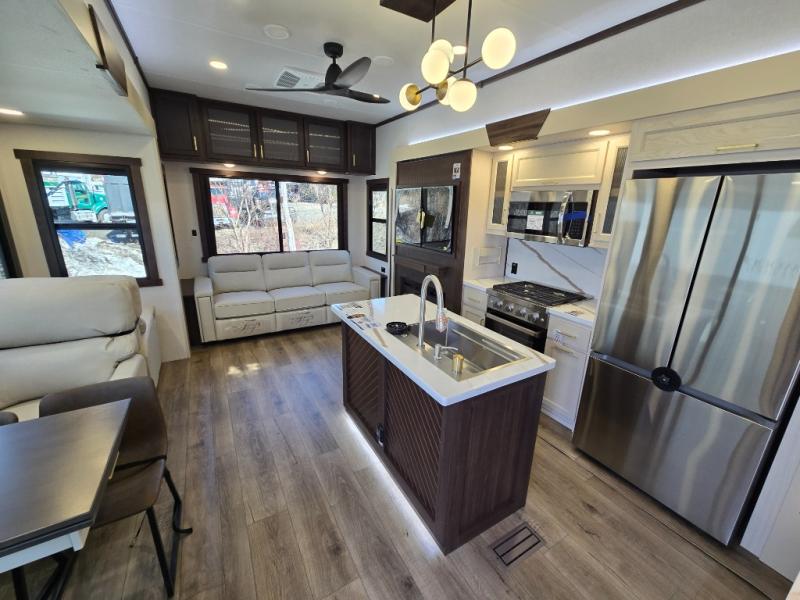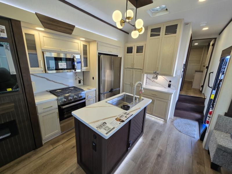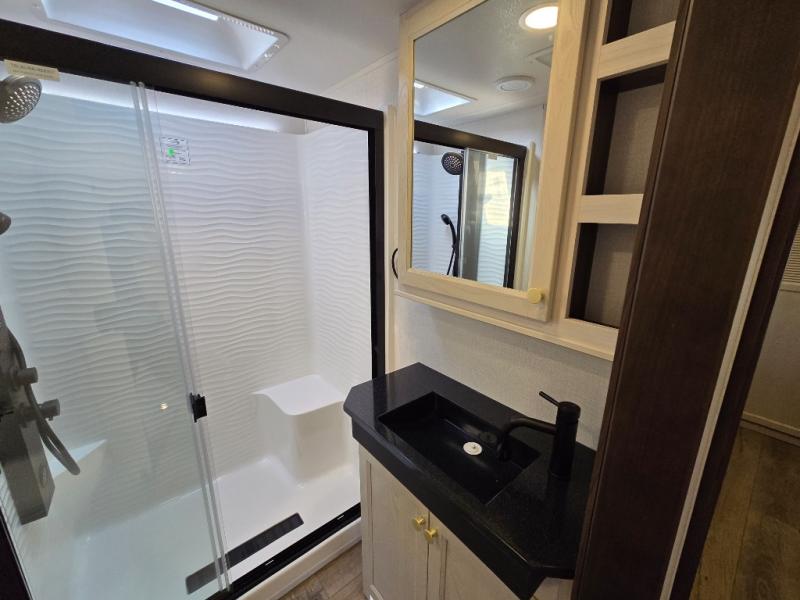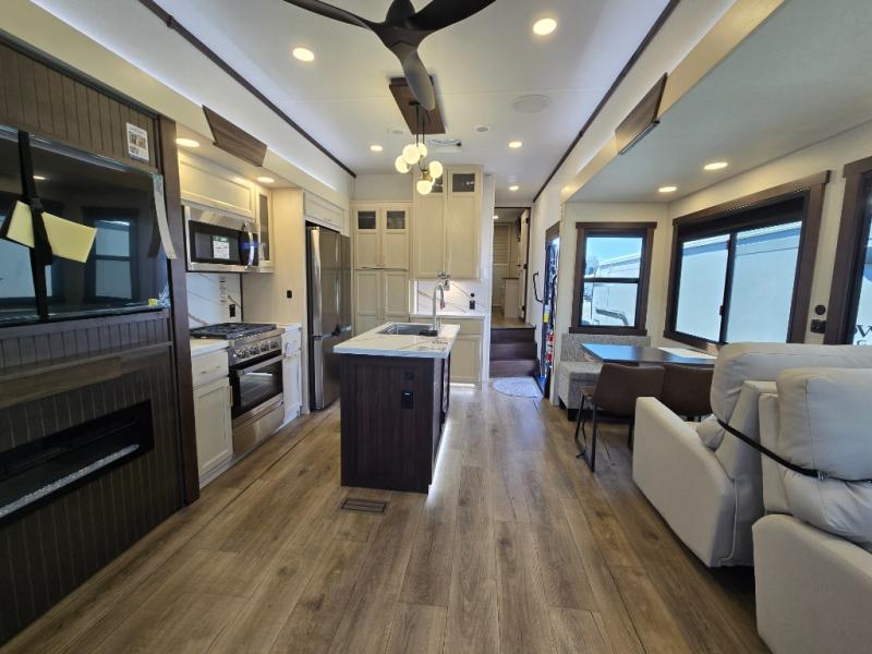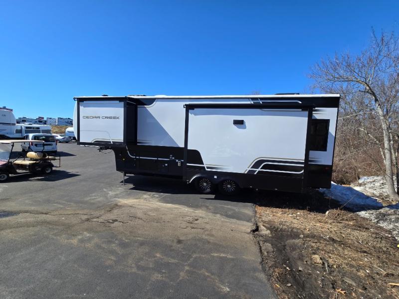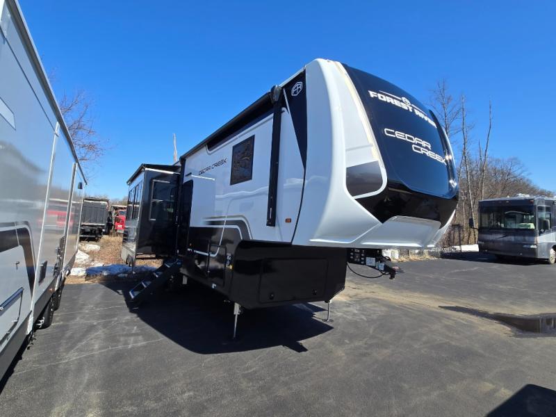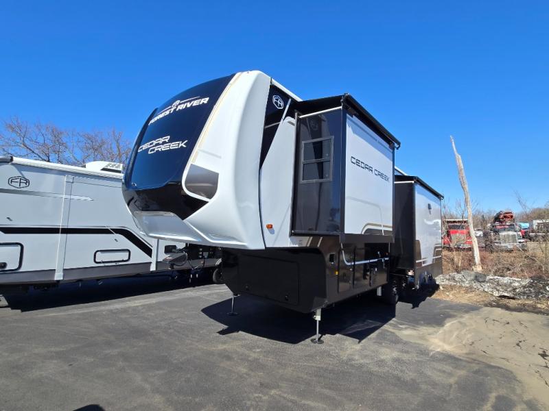 With any Cedar Creek fifth wheel by Forest River, you will find a quality-built RV with your comfort in mind! The all-aluminum super structure on 16" centers or less will provide a solid foundation to your fifth wheel, and the 3M bonded sidewalls will hold up and provide resistance to UV, heat, cold moisture, and even highway chemicals. Each model also includes a Road Warrior suspension for smooth towing, a 6-Point Hydraulic, GEN 3 Leveling System, and a new 101" wide body frame. Inside, you'll enjoy walnut/two tone wooden cabinetry with hidden hinges, cutting board drawer with cut-out trash funnel, motion lighting in the bath and bedroom closet, plus many more comforts. The New Travelfi™ Pay-as-you go internet provides the ability to bring your own internet rather than relying solely on campground WiFi, and the "Rich Solar" 200W solar panel will give you off-grid capabilities!