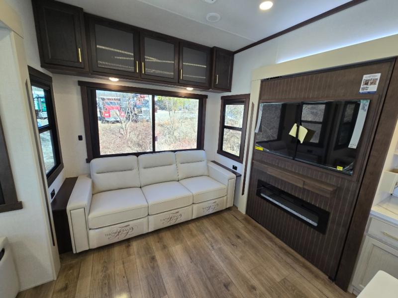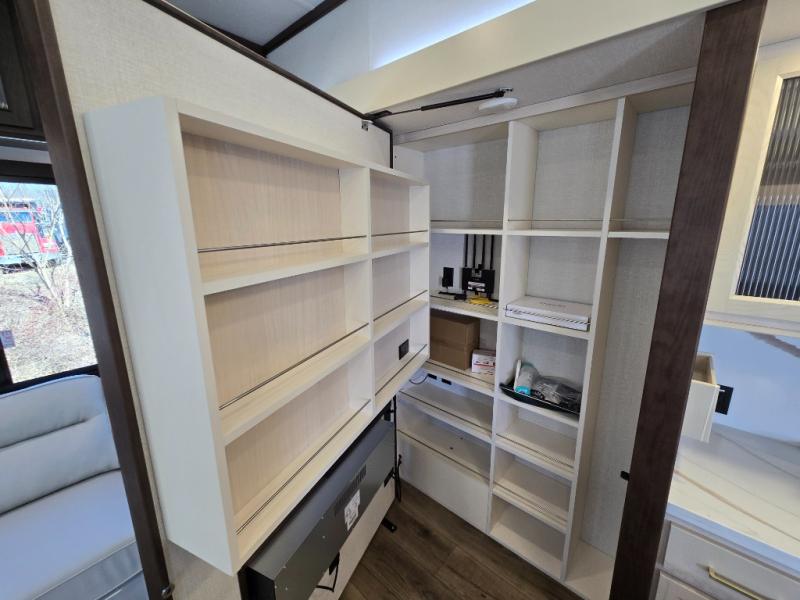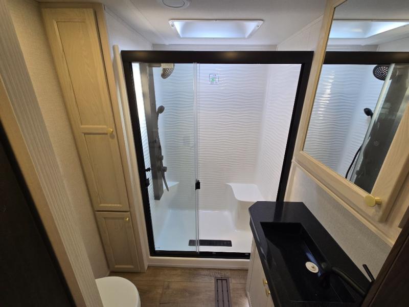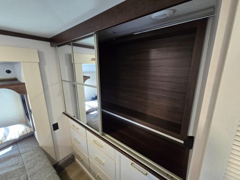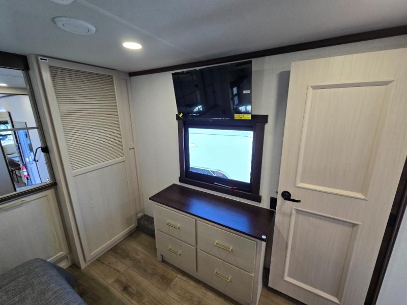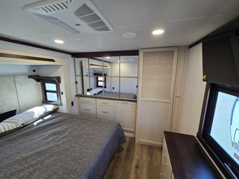 At the front of the 29RL fifth wheel, you’ll find the inviting front bedroom featuring a 72" x 80" king bed in a slide-out, offering plenty of room for a restful night’s sleep. This bedroom also includes a wardrobe, shelving, and a dresser with a TV above, providing ample storage for clothing and personal items. Moving down the hall, the full bathroom offers a spacious 48" x 30" shower with a seat for added comfort, along with linen shelves for extra storage. Toward the rear, the open kitchen and living area we have dual opposing slides that create a roomy, comfortable environment. One slide features a Murphy pantry, a 3-burner gas oven, and a 20-cu. ft. stainless steel refrigerator with overhead cabinets, equipping the chef on board with all the essentials. The central island includes a sink and handy hutch for added convenience. Across the way, the opposite slide houses reclining seats, a table with chairs, and a bench, perfect for dining or relaxing after a long day. At the very back, a hide-a-bed sofa offers additional seating and can easily convert into extra sleeping space when needed, making this layout both functional and inviting for any adventure.