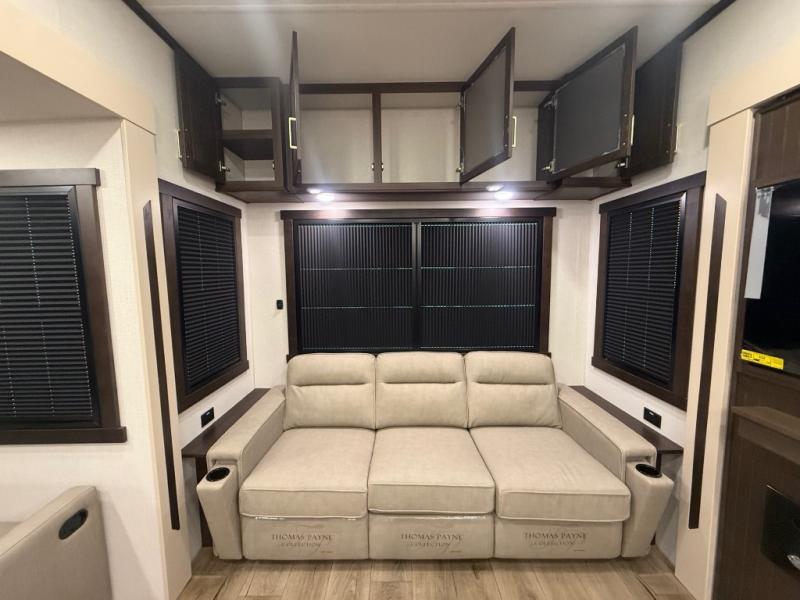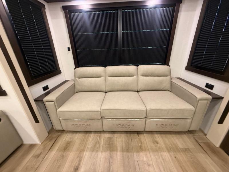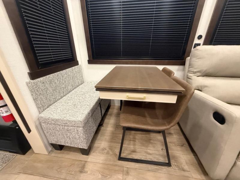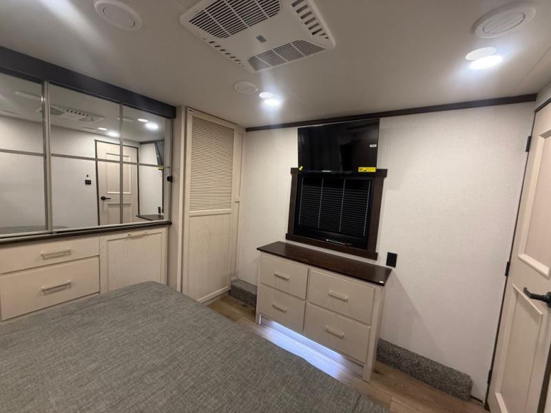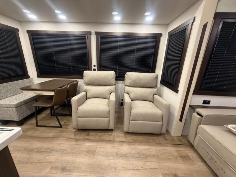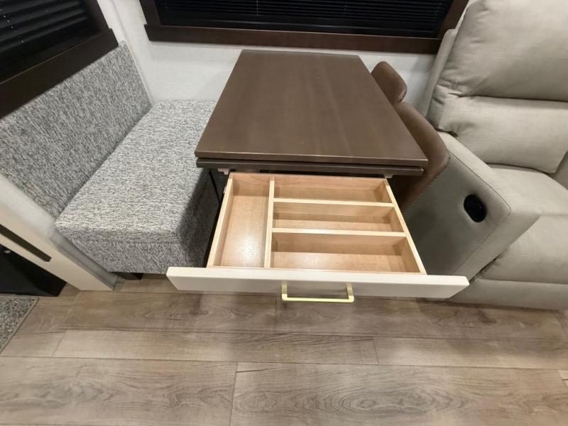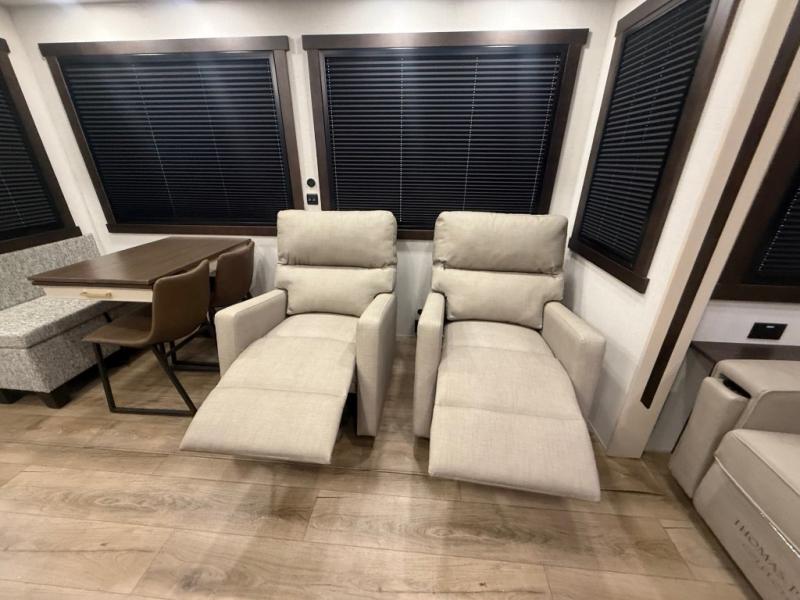 At the front of the 29RL fifth wheel, you’ll find the inviting front bedroom featuring a 72" x 80" king bed in a slide-out, offering plenty of room for a restful night’s sleep. This bedroom also includes a wardrobe, shelving, and a dresser with a TV above, providing ample storage for clothing and personal items. Moving down the hall, the full bathroom offers a spacious 48" x 30" shower with a seat for added comfort, along with linen shelves for extra storage. Toward the rear, the open kitchen and living area we have dual opposing slides that create a roomy, comfortable environment. One slide features a Murphy pantry, a 3-burner gas oven, and a 20-cu. ft. stainless steel refrigerator with overhead cabinets, equipping the chef on board with all the essentials. The central island includes a sink and handy hutch for added convenience. Across the way, the opposite slide houses reclining seats, a table with chairs, and a bench, perfect for dining or relaxing after a long day. At the very back, a hide-a-bed sofa offers additional seating and can easily convert into extra sleeping space when needed, making this layout both functional and inviting for any adventure.