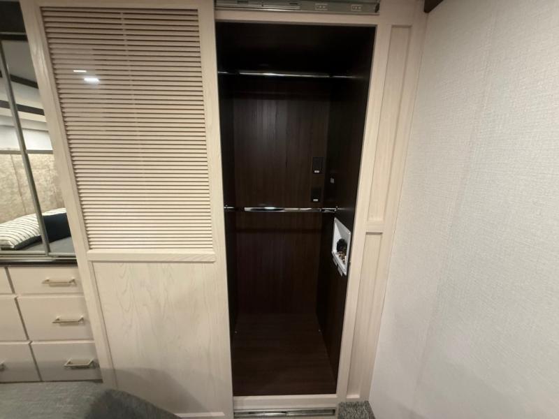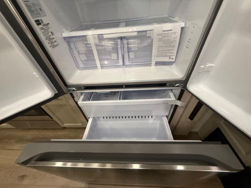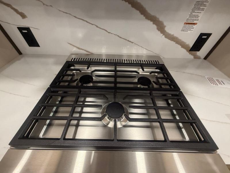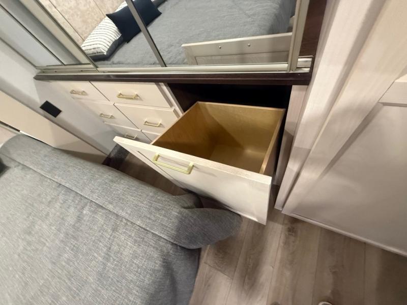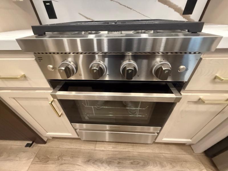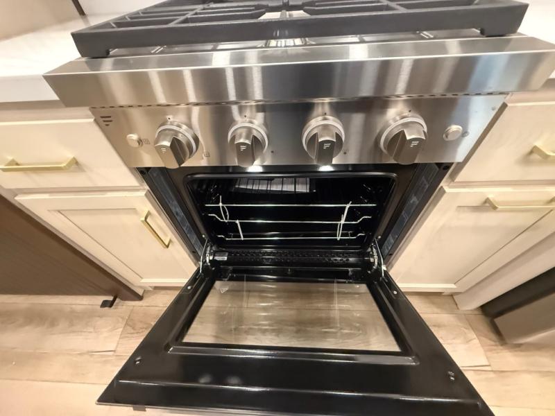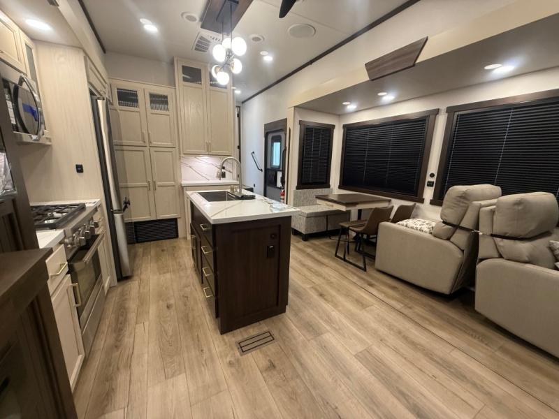 At the front of the 29RL fifth wheel, you’ll find the inviting front bedroom featuring a 72" x 80" king bed in a slide-out, offering plenty of room for a restful night’s sleep. This bedroom also includes a wardrobe, shelving, and a dresser with a TV above, providing ample storage for clothing and personal items. Moving down the hall, the full bathroom offers a spacious 48" x 30" shower with a seat for added comfort, along with linen shelves for extra storage. Toward the rear, the open kitchen and living area we have dual opposing slides that create a roomy, comfortable environment. One slide features a Murphy pantry, a 3-burner gas oven, and a 20-cu. ft. stainless steel refrigerator with overhead cabinets, equipping the chef on board with all the essentials. The central island includes a sink and handy hutch for added convenience. Across the way, the opposite slide houses reclining seats, a table with chairs, and a bench, perfect for dining or relaxing after a long day. At the very back, a hide-a-bed sofa offers additional seating and can easily convert into extra sleeping space when needed, making this layout both functional and inviting for any adventure.