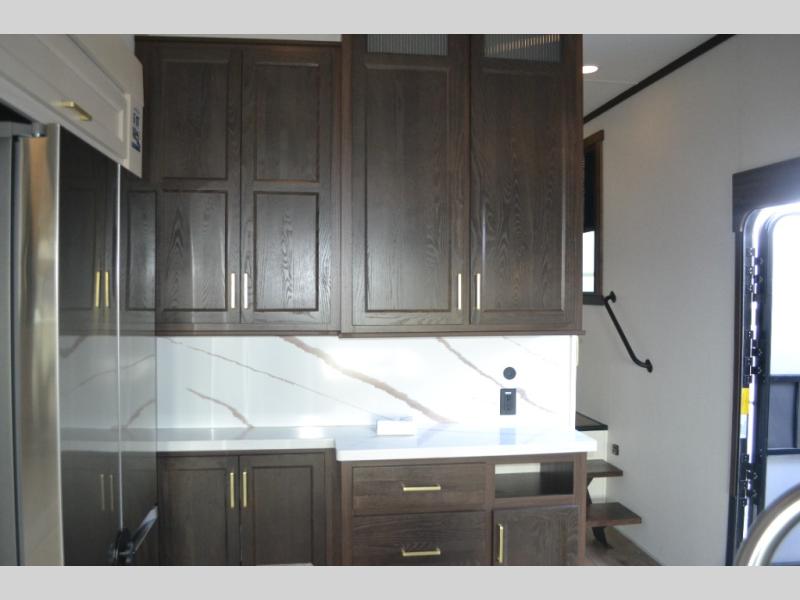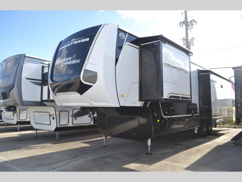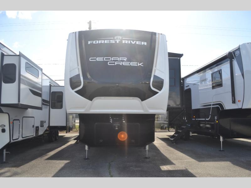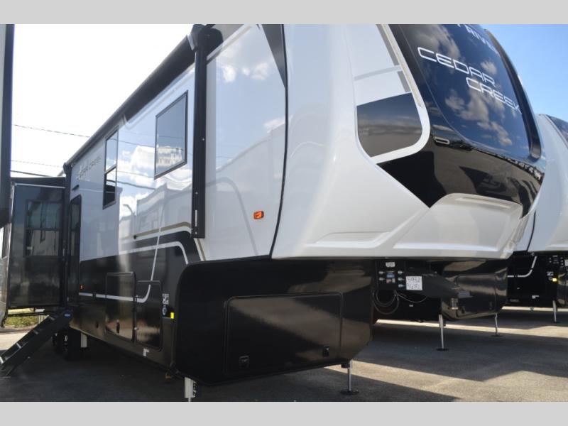 With any Cedar Creek fifth wheel by Forest River, you will find a quality-built RV with your comfort in mind! The all-aluminum super structure on 16" centers or less will provide a solid foundation to your fifth wheel, and the 3M bonded sidewalls will hold up and provide resistance to UV, heat, cold moisture, and even highway chemicals. Each model also includes a Road Warrior suspension for smooth towing, a 6-Point Hydraulic ,GEN 3 Leveling System, and a new 101" wide body frame. Inside, you'll enjoy walnut/two tone wooden cabinetry with hidden hinges, cutting board drawer with cut-out trash funnel, motion lighting in the bath and bedroom closet, plus many more comforts. The New Travelfi™ Pay-as-you go internet provides the ability to bring your own internet rather than relying solely on campground WiFi, and the "Rich Solar" 200W solar panel will give you off-grid capabilities!