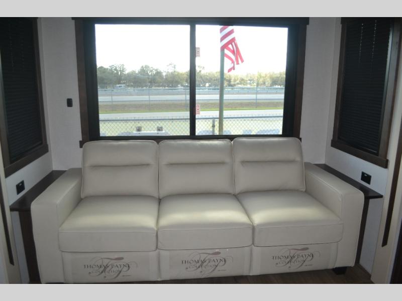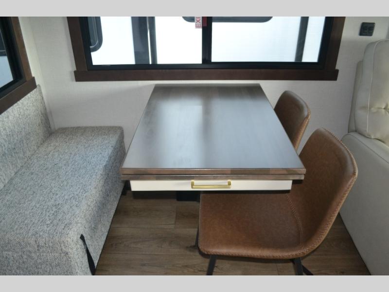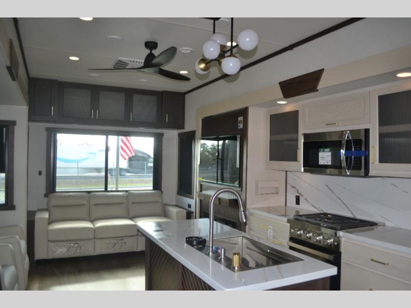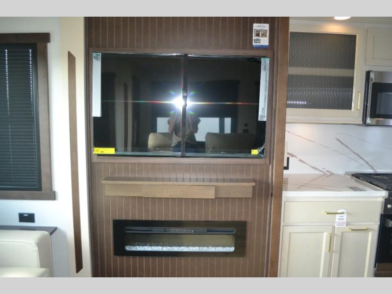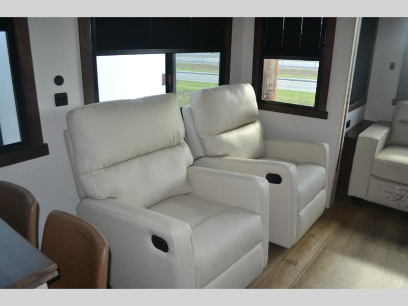 You can bring a guest or two to join in on the fun with this fifth wheel! The rear living area has a hide-a-bed sofa and power theater seating across from the swivel mounted TV and fireplace with a hidden Murphy pantry behind. The chef can prepare their best meals with the kitchen island, and your guests will love the fold-down breakfast counter. The full bathroom has a spacious shower with a seat plus a dual sink vanity for convenience. The king bed slide in the front private bedroom welcomes you to enjoy a good night's rest and the front wardrobe has storage shelves and washer/dryer prep if you want the option to wash clothes while you're away from home!