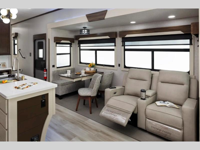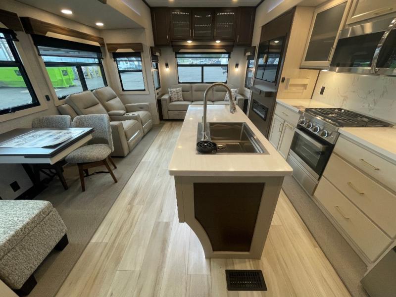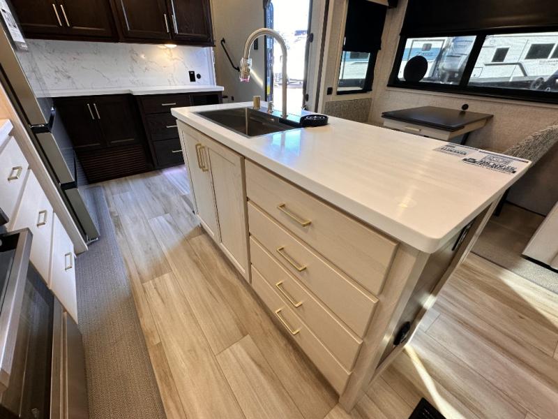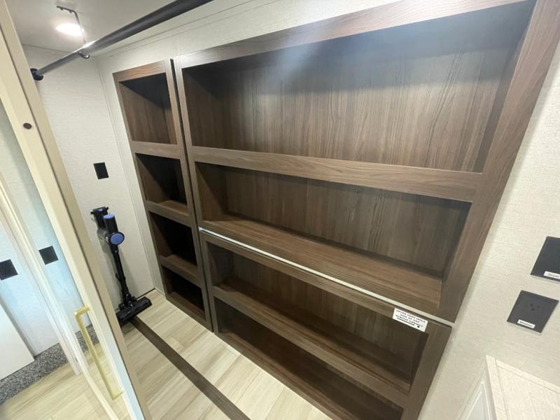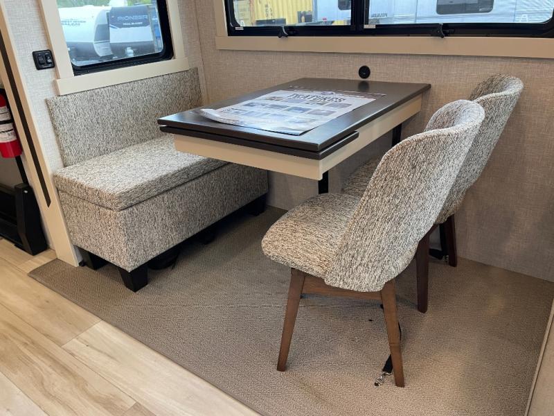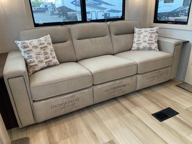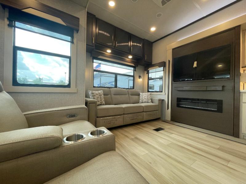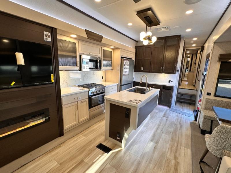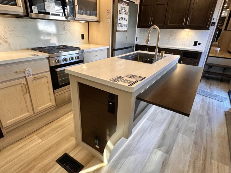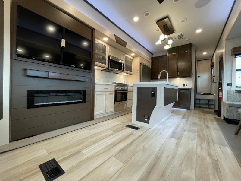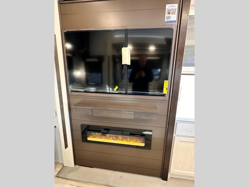 You can bring a guest or two to join in on the fun with this fifth wheel! The rear living area has a hide-a-bed sofa and power theater seating across from the swivel mounted TV and fireplace with a hidden Murphy pantry behind. The chef can prepare their best meals with the kitchen island, and your guests will love the fold-down breakfast counter. The full bathroom has a spacious shower with a seat plus a dual sink vanity for convenience. The king bed slide in the front private bedroom welcomes you to enjoy a good night's rest and the front wardrobe has storage shelves and washer/dryer prep if you want the option to wash clothes while you're away from home!