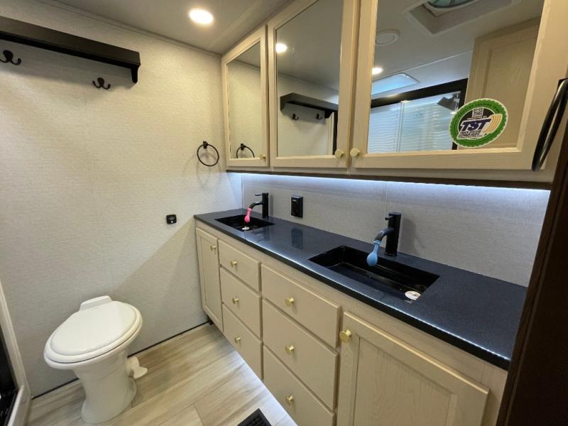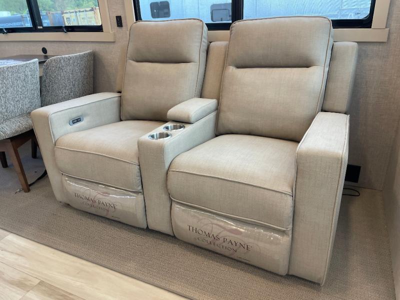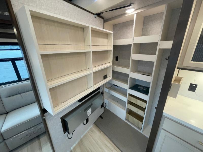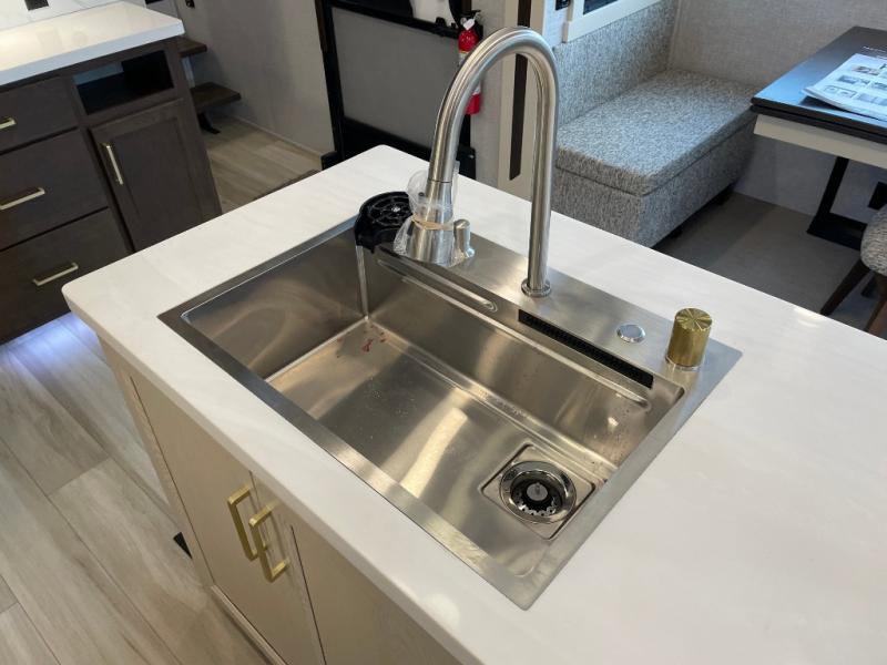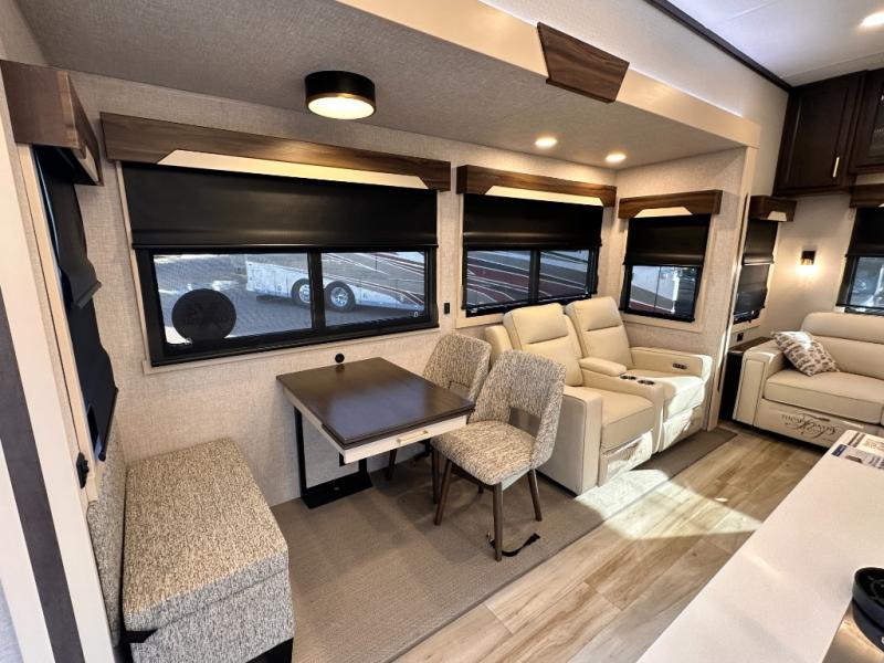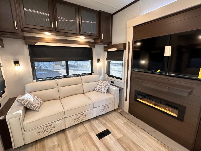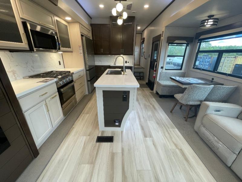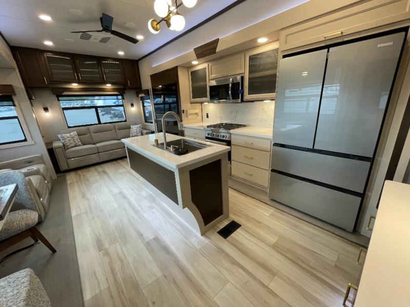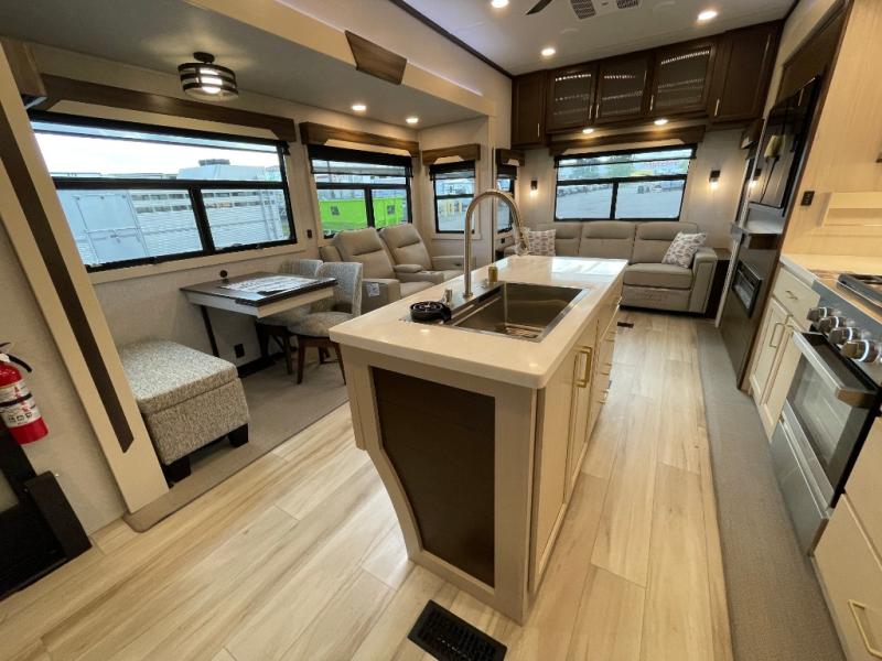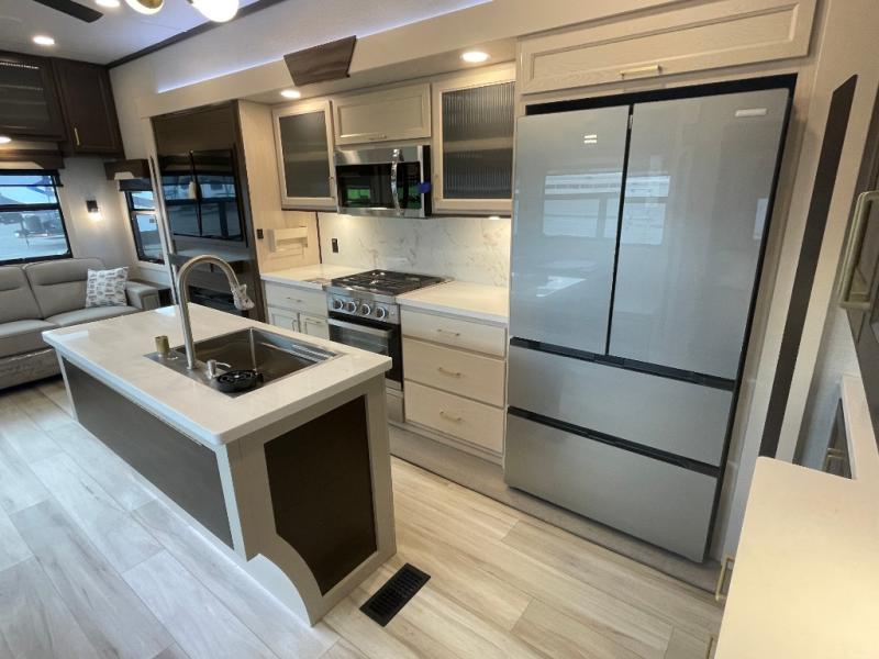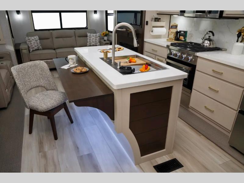You can bring a guest or two to join in on the fun with this fifth wheel! The rear living area has a hide-a-bed sofa and power theater seating across from the swivel mounted TV and fireplace with a hidden Murphy pantry behind. The chef can prepare their best meals with the kitchen island, and your guests will love the fold-down breakfast counter. The full bathroom has a spacious shower with a seat plus a dual sink vanity for convenience. The king bed slide in the front private bedroom welcomes you to enjoy a good night's rest and the front wardrobe has storage shelves and washer/dryer prep if you want the option to wash clothes while you're away from home!