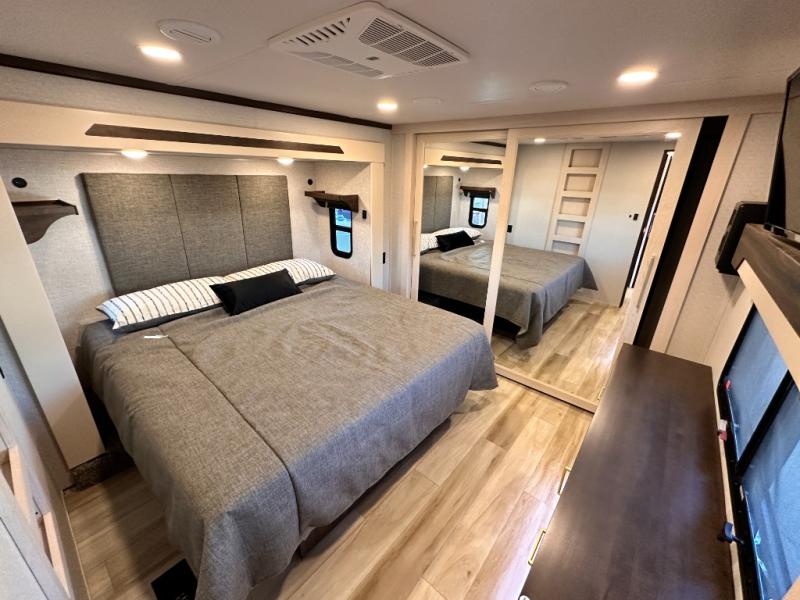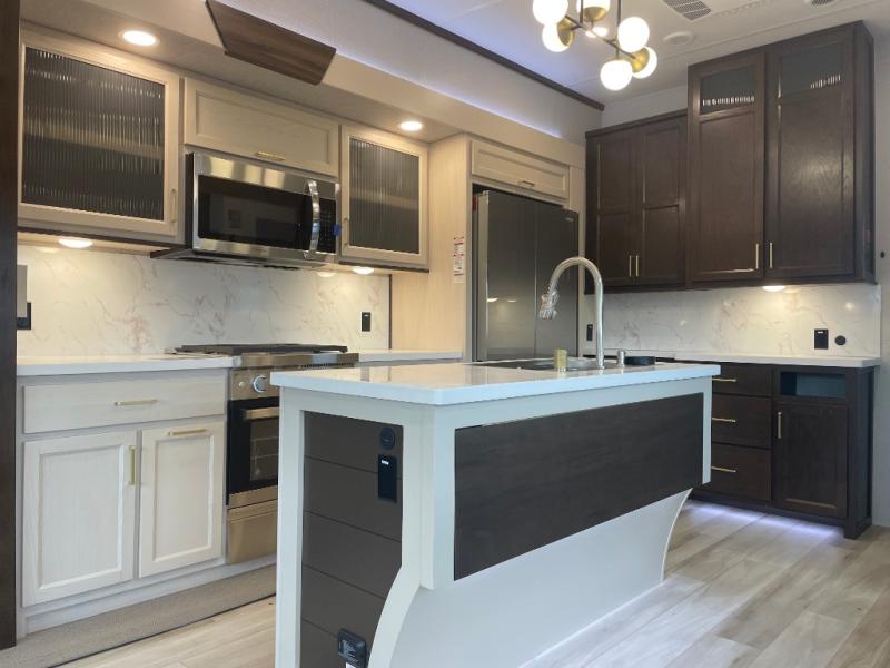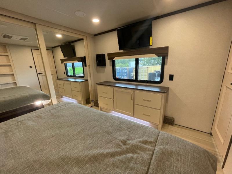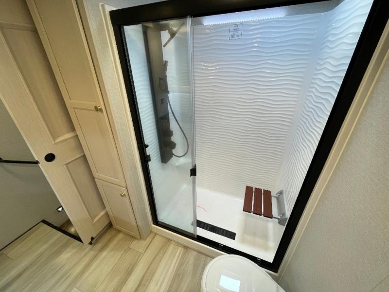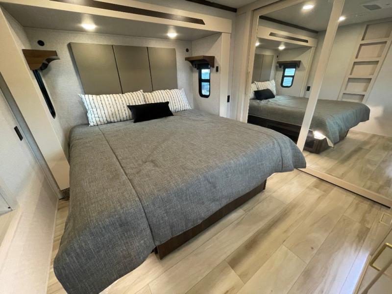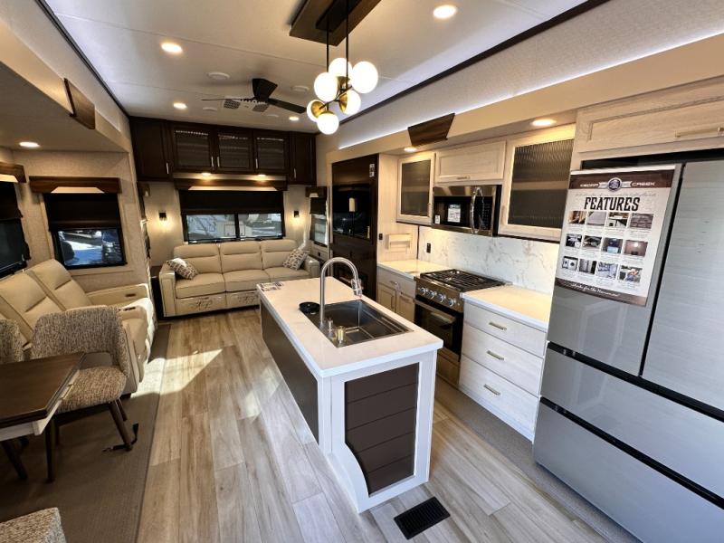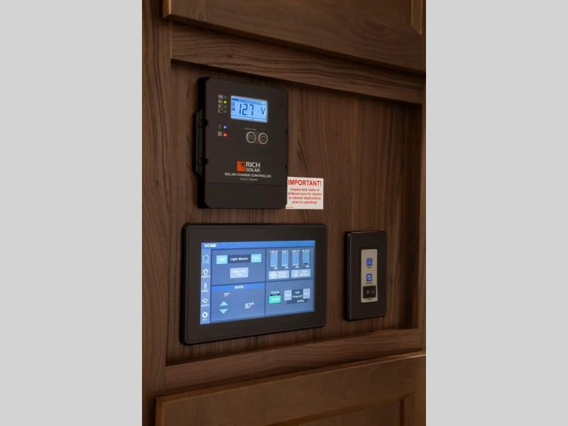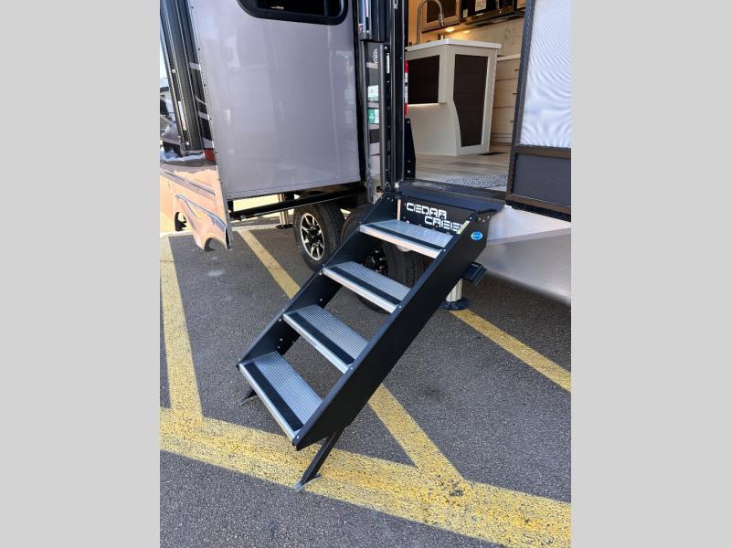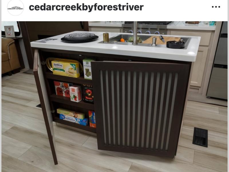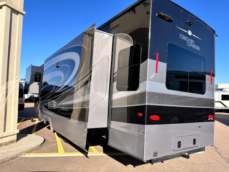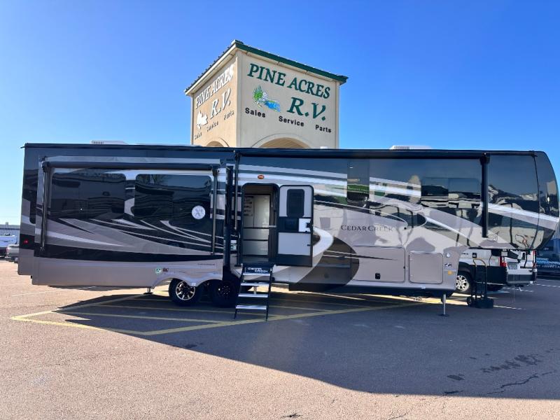 With any Cedar Creek fifth wheel by Forest River, you will find a quality-built RV with your comfort in mind! The all-aluminum super structure on 16" centers or less will provide a solid foundation to your fifth wheel, and the 3M bonded sidewalls will hold up and provide resistance to UV, heat, cold moisture, and even highway chemicals. Each model also includes a Road Warrior suspension for smooth towing, a 6-Point Hydraulic ,GEN 3 Leveling System, and a new 101" wide body frame. Inside, you'll enjoy walnut/two tone wooden cabinetry with hidden hinges, cutting board drawer with cut-out trash funnel, motion lighting in the bath and bedroom closet, plus many more comforts. The New Travelfi™ Pay-as-you go internet provides the ability to bring your own internet rather than relying solely on campground WiFi, and the "Rich Solar" 200W solar panel will give you off-grid capabilities!