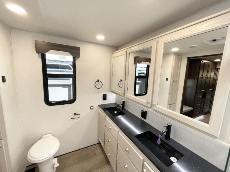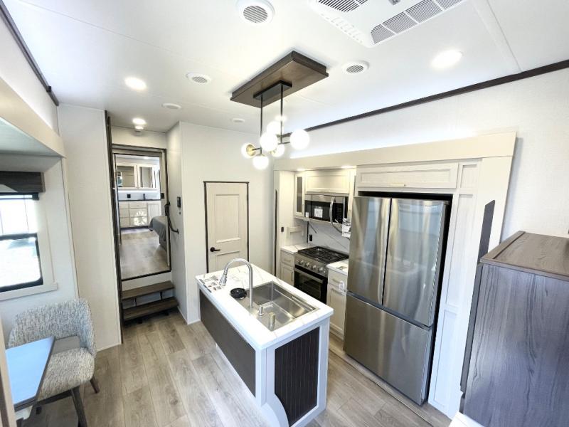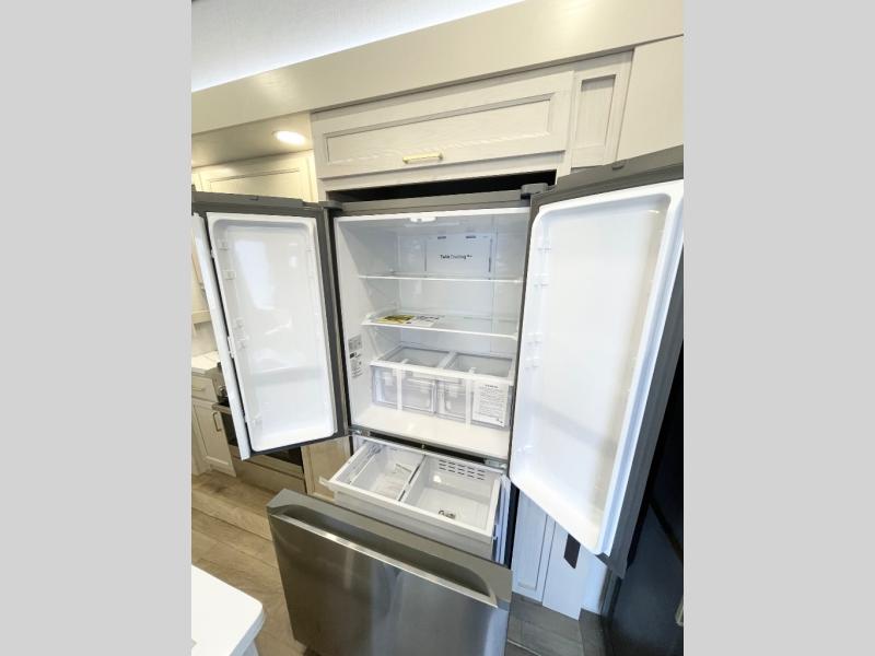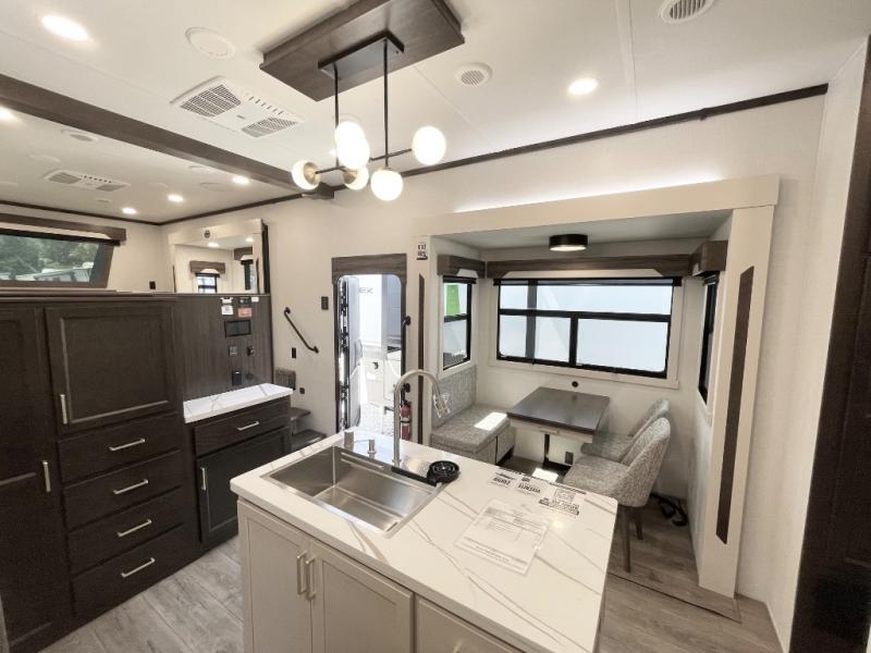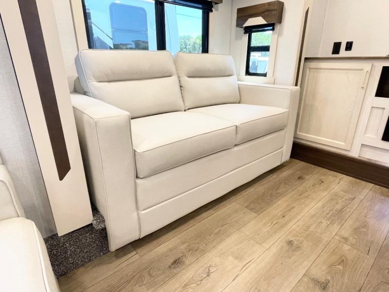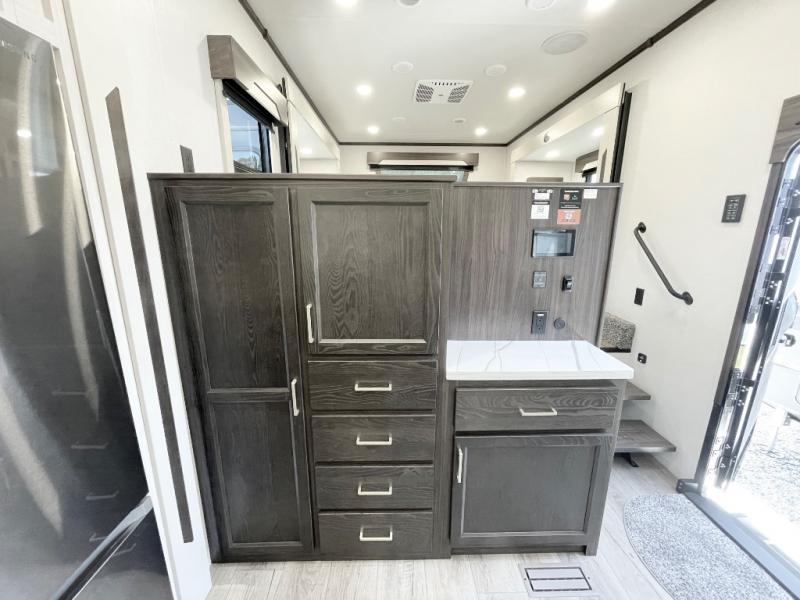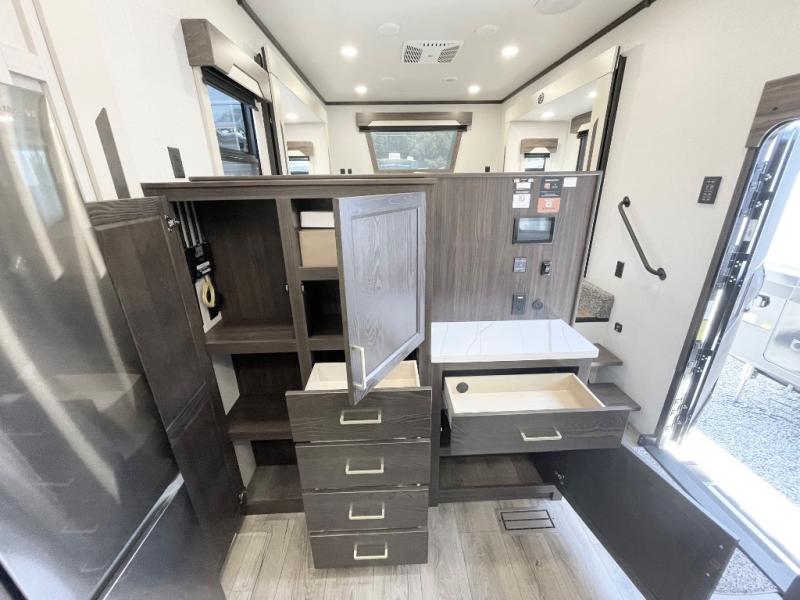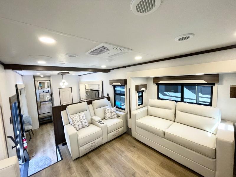 This fifth wheel has everything and then some! The front living area has opposing tri-fold sofas and power theater seating across from the front entertainment center with a fireplace and hidden telescoping TV. The chef can prepare their best meals with the kitchen island with a fold-down breakfast counter, and there is an 18 cu. ft. 12V refrigerator with an icemaker for food storage. Enjoy your meals and the extra space provided with the wall mounted dining table with an extension and an ottoman. The master suite has a king bed slide to lay your head at night and access to the full rear bathroom which has a shower with a seat, a linen closet, washer/dryer prep, and a dual sink vanity. You'll also find drop-down storage underneath the bath/bedroom so nothing gets left behind. And the convenient half bath can be traded out for an optional bonus pantry if you don't need the half bath!