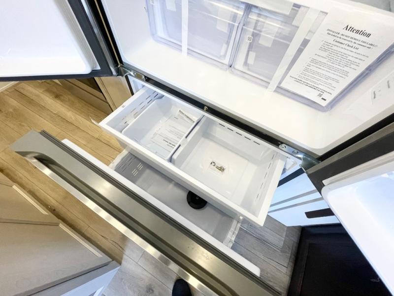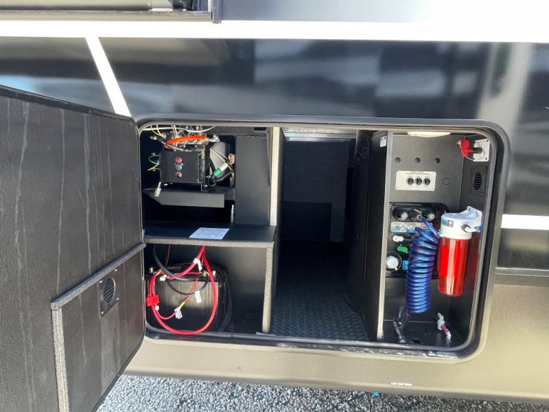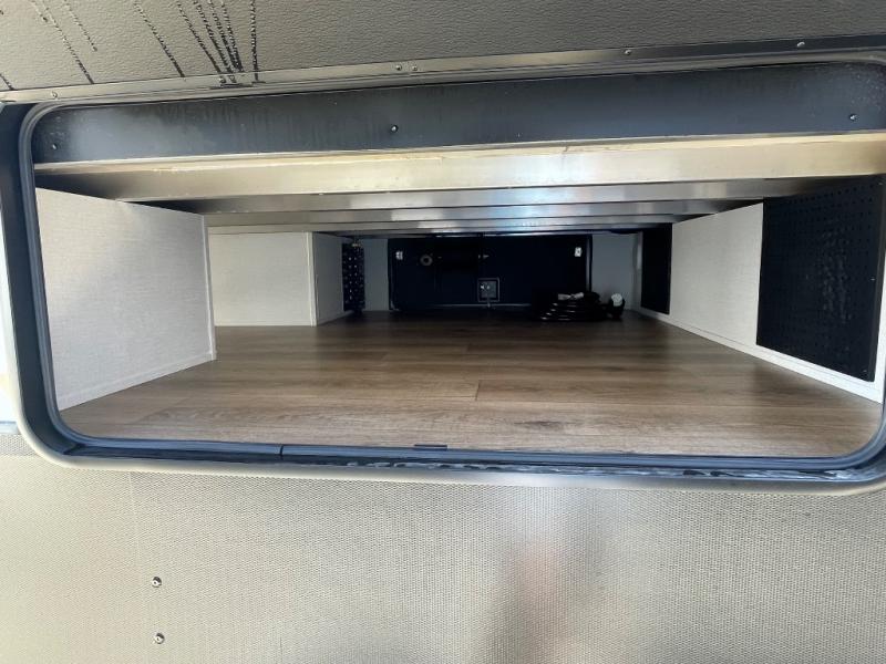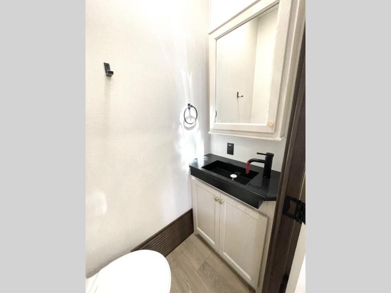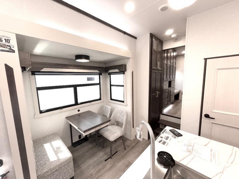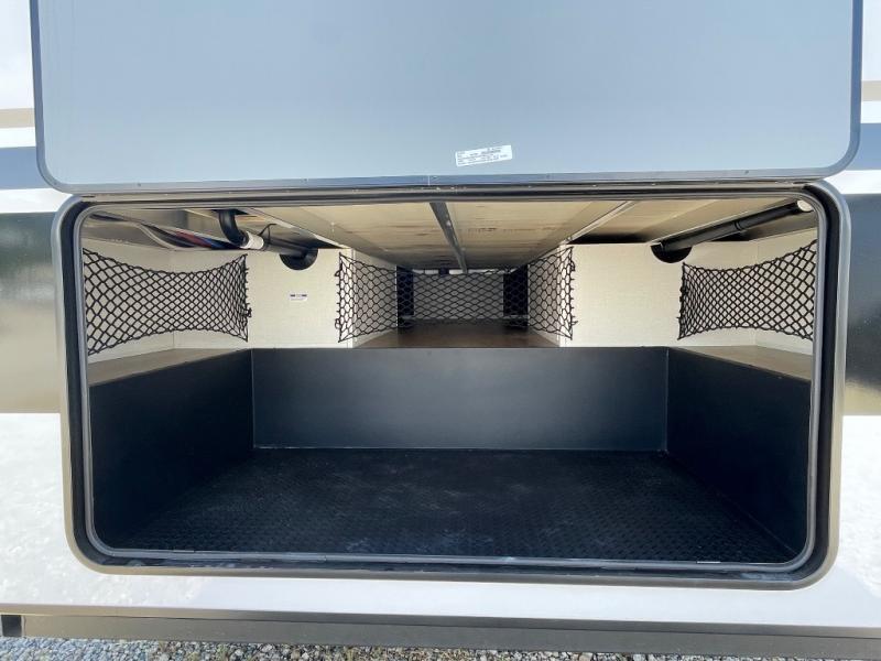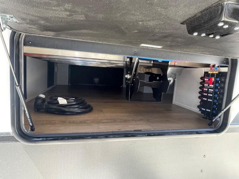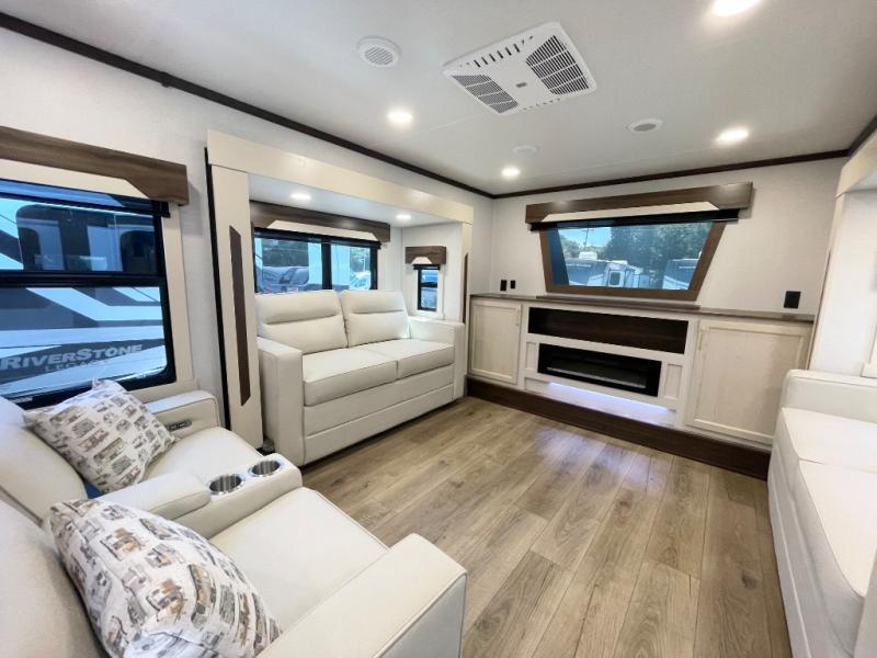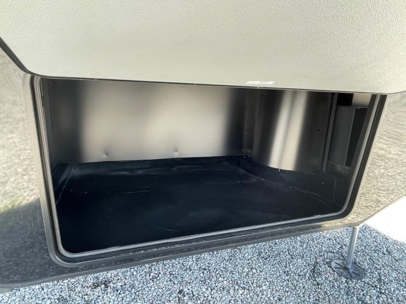 This fifth wheel has everything and then some! The front living area has opposing tri-fold sofas and power theater seating across from the front entertainment center with a fireplace and hidden telescoping TV. The chef can prepare their best meals with the kitchen island with a fold-down breakfast counter, and there is an 18 cu. ft. 12V refrigerator with an icemaker for food storage. Enjoy your meals and the extra space provided with the wall mounted dining table with an extension and an ottoman. The master suite has a king bed slide to lay your head at night and access to the full rear bathroom which has a shower with a seat, a linen closet, washer/dryer prep, and a dual sink vanity. You'll also find drop-down storage underneath the bath/bedroom so nothing gets left behind. And the convenient half bath can be traded out for an optional bonus pantry if you don't need the half bath!