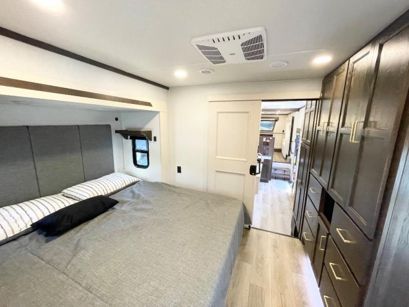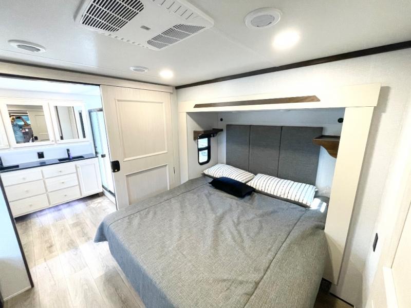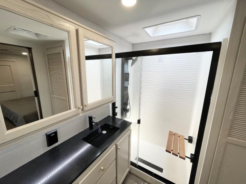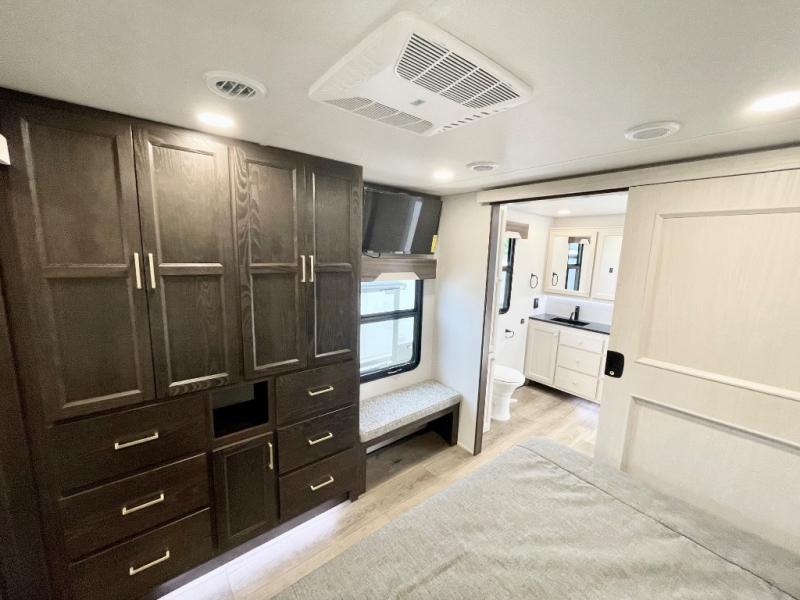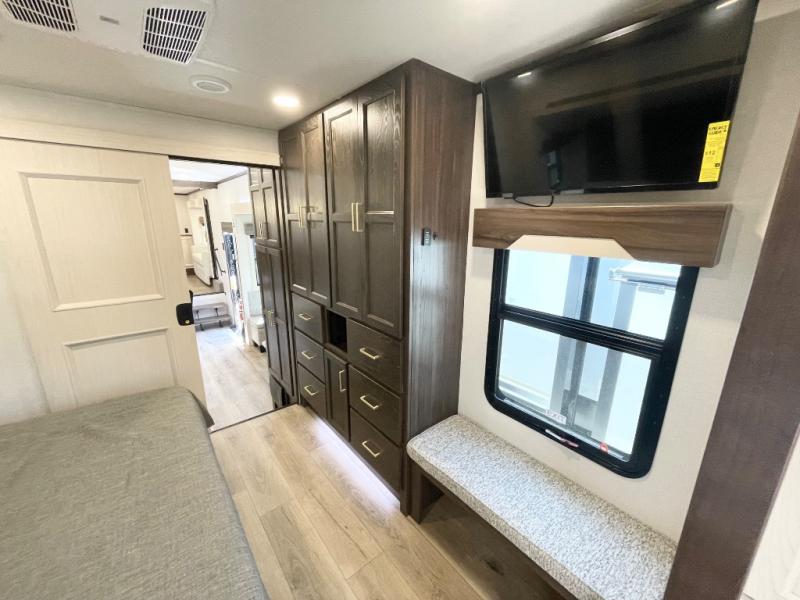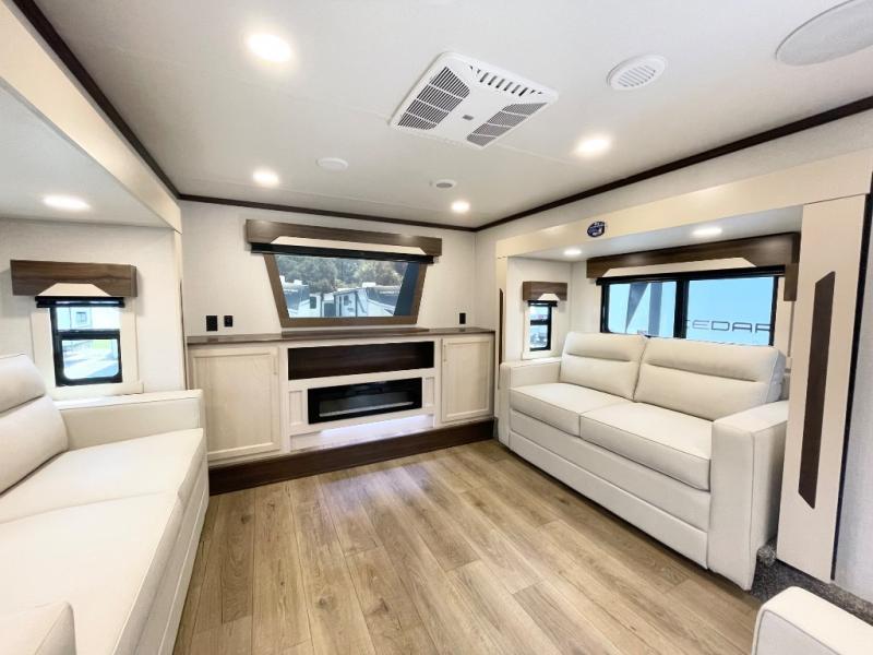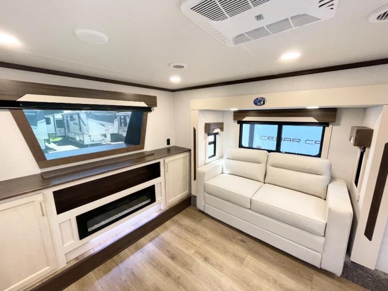 With any Cedar Creek fifth wheel by Forest River, you will find a quality-built RV with your comfort in mind! The all-aluminum super structure on 16" centers or less will provide a solid foundation to your fifth wheel, and the 3M bonded sidewalls will hold up over years of use. Each model also includes a Road Warrior suspension for smooth towing, a 21,000 lb. Rhino box hitch, and a new 101" wide body frame. Inside, you'll enjoy walnut/two tone wooden cabinets and fascias, day/night roller shades, motion lighting in the bath and bedroom closet, plus many more comforts. The new CradlePoint WiFi/5G antenna and Day 1 connectivity will help keep you connected as you travel, and the "Rich Solar" 200W solar panel will give you off-grid capabilities!