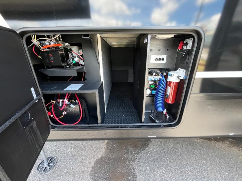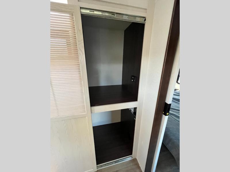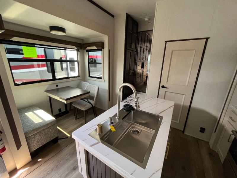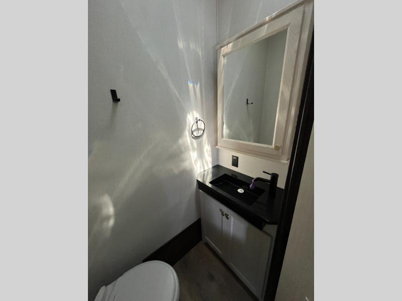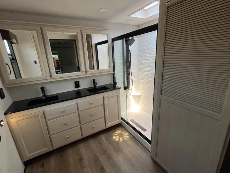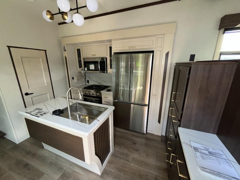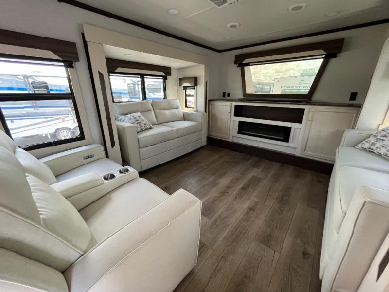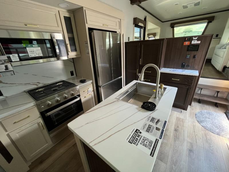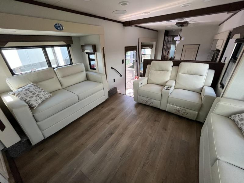 This fifth wheel has everything and then some! The front living area has opposing tri-fold sofas and power theater seating across from the front entertainment center with a fireplace and hidden telescoping TV. The chef can prepare their best meals with the kitchen island with a fold-down breakfast counter, and there is an 18 cu. ft. 12V refrigerator with an icemaker for food storage. Enjoy your meals and the extra space provided with the wall mounted dining table with an extension and an ottoman. The master suite has a king bed slide to lay your head at night and access to the full rear bathroom which has a shower with a seat, a linen closet, washer/dryer prep, and a dual sink vanity. You'll also find drop-down storage underneath the bath/bedroom so nothing gets left behind. And the convenient half bath can be traded out for an optional bonus pantry if you don't need the half bath!