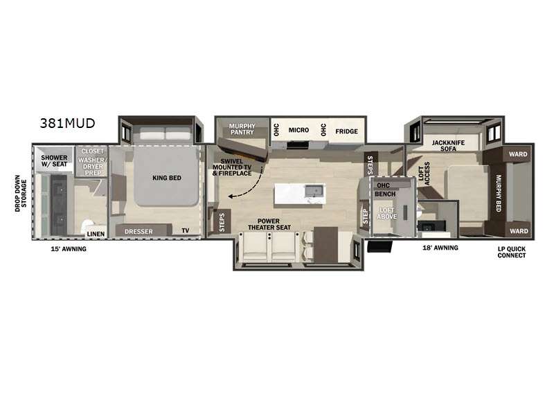 You won't believe all this fifth wheel has to offer! There is a convenient mud room right as you enter the unit where you can use the bench to take your shoes off and not drag dirt in the living areas. The front bedroom includes a jackknife sofa slide out, a half bath, plus a Murphy bed so this room can be used as a guest room! And the loft access is in this room to house more guests or use as storage space. Your crew will love to meet in the middle-combined kitchen and living area with power theater seats, a wall mounted dining table with an extension and an ottoman, plus a kitchen island a sink and plenty of counterspace. There is also a Murphy pantry hidden behind the entertainment center and all the appliances needed to make meals each day. You will be met with comfort in the master bedroom that includes a king bed slide out, a dresser and a TV, plus a full rear bath with dual bath sinks. You will also find a shower with a seat and drop-down storage under the rear bedroom/bathroom, so nothing gets left behind!