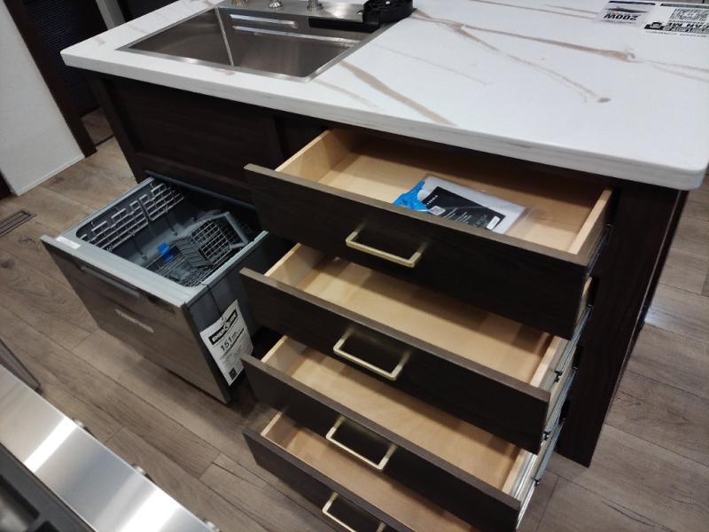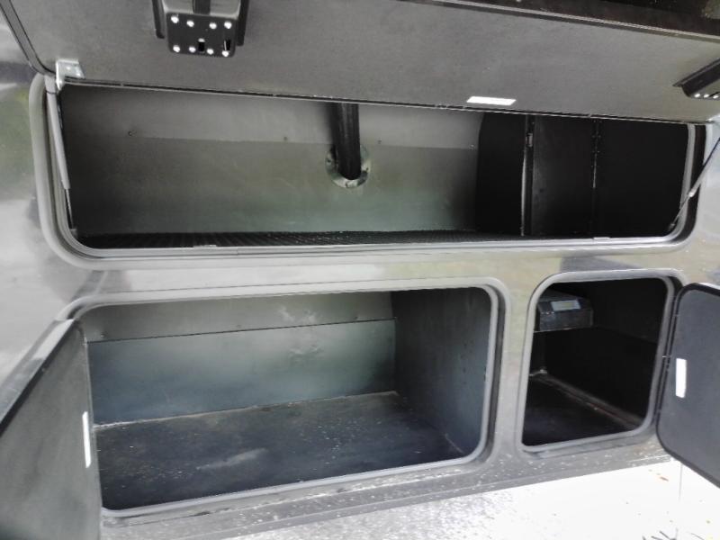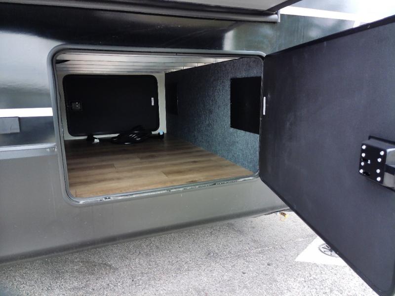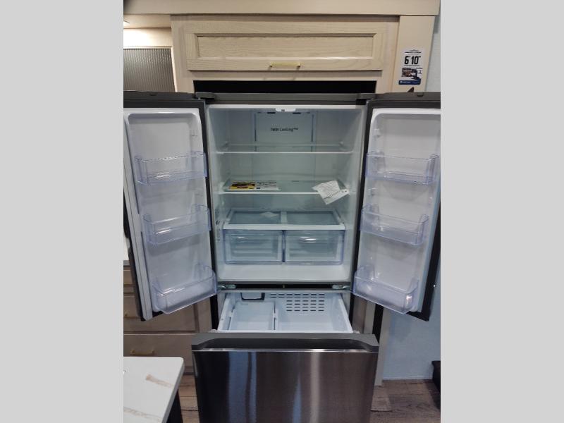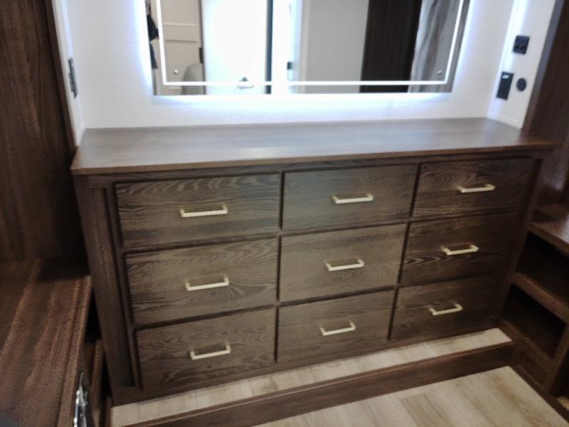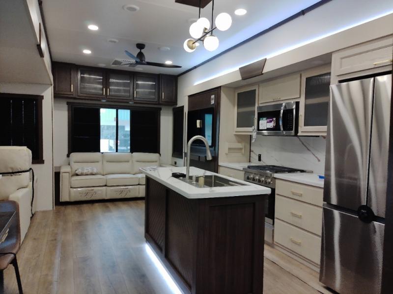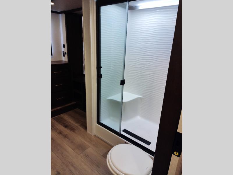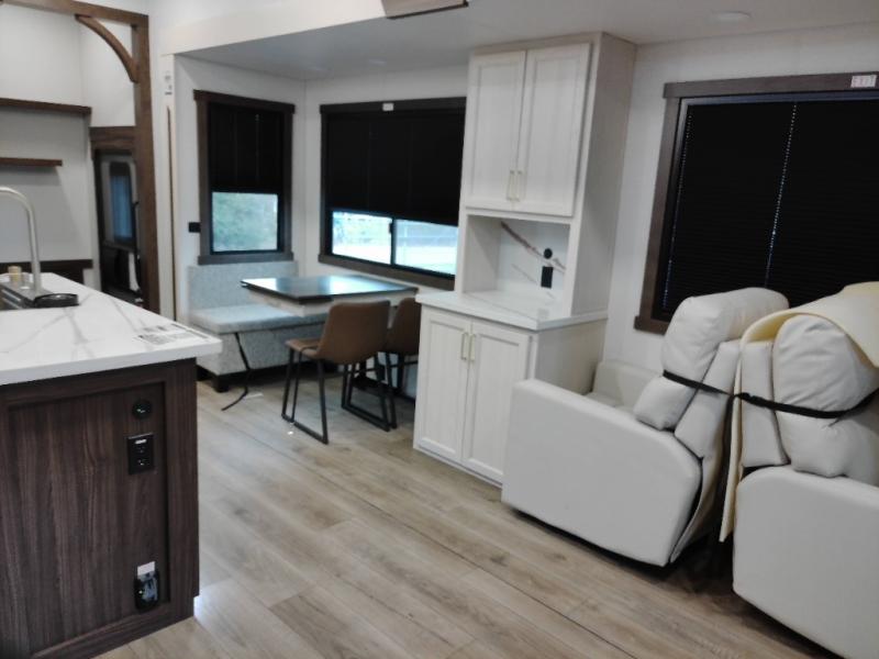 At the front of the 383FB fifth wheel, you’ll find a spacious front bathroom featuring a 48" x 30" shower with a built-in seat and upgraded shower head for a refreshing experience. The 18" high porcelain toilet includes a top circular flush system for added comfort, while LED motion night lighting beneath the vanity adds a convenient touch for nighttime use. This bathroom also provides a walk-in closet with a dresser and shelves equipped with hanging rods, perfect for keeping clothes and essentials neatly organized. Just next to the bathroom, the bedroom houses a king bed in a slide-out, offering plenty of room to stretch out and relax, with additional storage space located across from the bed. Moving toward the rear, the main living area and kitchen open up with dual opposing slides to maximize space and comfort. One slide features a Murphy pantry, a 3-burner gas oven, a 20-cu. ft. stainless steel refrigerator, and a 30" over-the-range microwave with an updated backsplash, while the central kitchen island provides a convenient workspace for the chef on board. Across the way, the opposite slide holds the recliner, table with chairs, and a bench, ideal for dining or lounging after a long day. At the very back, a hide-a-bed sofa offers additional seating and converts easily into extra sleeping space, making this fifth wheel as functional as it is comfortable.