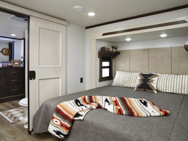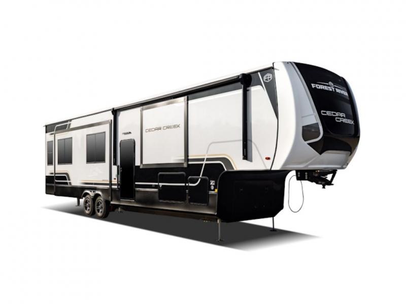 With any Cedar Creek fifth wheel by Forest River, you will find a quality-built RV with your comfort in mind! The all-aluminum super structure on 16" centers or less will provide a solid foundation to your fifth wheel, and the 3M bonded sidewalls will hold up and provide resistance to UV, heat, cold moisture, and even highway chemicals. Each model also includes a Road Warrior suspension for smooth towing, a 6-Point Hydraulic, GEN 3 Leveling System, and a new 101" wide body frame. Inside, you'll enjoy walnut/two tone wooden cabinetry with hidden hinges, cutting board drawer with cut-out trash funnel, motion lighting in the bath and bedroom closet, plus many more comforts. The New Travelfi™ Pay-as-you go internet provides the ability to bring your own internet rather than relying solely on campground WiFi, and the "Rich Solar" 200W solar panel will give you off-grid capabilities!