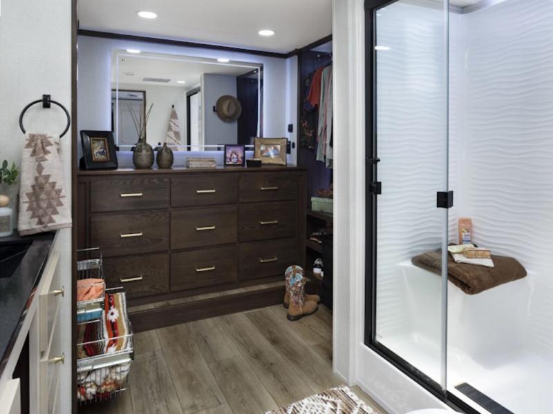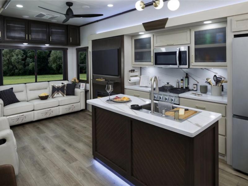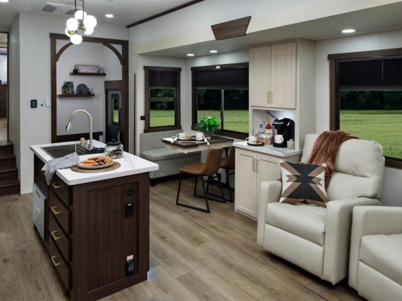 At the front of the 383FB fifth wheel, you’ll find a spacious front bathroom featuring a 48" x 30" shower with a built-in seat and upgraded shower head for a refreshing experience. The 18" high porcelain toilet includes a top circular flush system for added comfort, while LED motion night lighting beneath the vanity adds a convenient touch for nighttime use. This bathroom also provides a walk-in closet with a dresser and shelves equipped with hanging rods, perfect for keeping clothes and essentials neatly organized. Just next to the bathroom, the bedroom houses a king bed in a slide-out, offering plenty of room to stretch out and relax, with additional storage space located across from the bed. Moving toward the rear, the main living area and kitchen open up with dual opposing slides to maximize space and comfort. One slide features a Murphy pantry, a 3-burner gas oven, a 20-cu. ft. stainless steel refrigerator, and a 30" over-the-range microwave with an updated backsplash, while the central kitchen island provides a convenient workspace for the chef on board. Across the way, the opposite slide holds the recliner, table with chairs, and a bench, ideal for dining or lounging after a long day. At the very back, a hide-a-bed sofa offers additional seating and converts easily into extra sleeping space, making this fifth wheel as functional as it is comfortable.