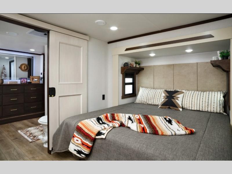 With any Cedar Creek fifth wheel by Forest River, you will find a quality-built RV with your comfort in mind! The all-aluminum super structure on 16" centers or less will provide a solid foundation to your fifth wheel, and the 3M bonded sidewalls will hold up and provide resistance to UV, heat, cold moisture, and even highway chemicals. Each model also includes a Road Warrior suspension for smooth towing, a 6-Point Hydraulic, GEN 3 Leveling System, and a new 101" wide body frame. Inside, you'll enjoy walnut/two tone wooden cabinetry with hidden hinges, cutting board drawer with cut-out trash funnel, motion lighting in the bath and bedroom closet, plus many more comforts. The New Travelfi™ Pay-as-you go internet provides the ability to bring your own internet rather than relying solely on campground WiFi, and the "Rich Solar" 200W solar panel will give you off-grid capabilities!