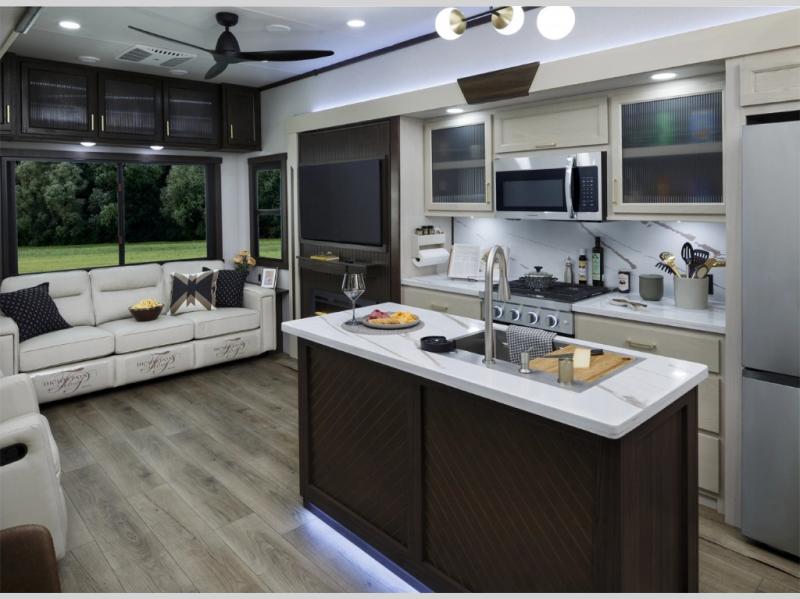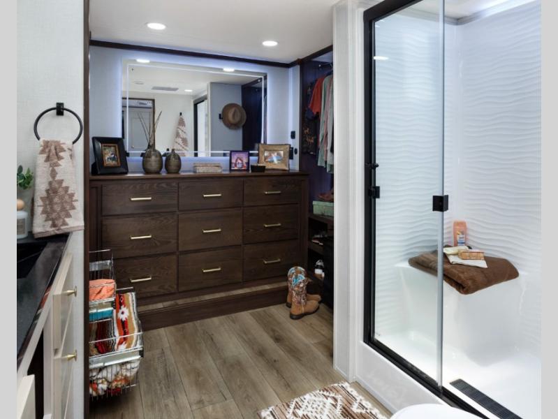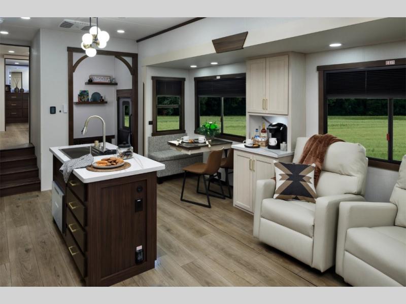 At the front of the 383FB fifth wheel, you’ll find a spacious front bathroom featuring a 48" x 30" shower with a built-in seat and upgraded shower head for a refreshing experience. The 18" high porcelain toilet includes a top circular flush system for added comfort, while LED motion night lighting beneath the vanity adds a convenient touch for nighttime use. This bathroom also provides a walk-in closet with a dresser and shelves equipped with hanging rods, perfect for keeping clothes and essentials neatly organized. Just next to the bathroom, the bedroom houses a king bed in a slide-out, offering plenty of room to stretch out and relax, with additional storage space located across from the bed. Moving toward the rear, the main living area and kitchen open up with dual opposing slides to maximize space and comfort. One slide features a Murphy pantry, a 3-burner gas oven, a 20-cu. ft. stainless steel refrigerator, and a 30" over-the-range microwave with an updated backsplash, while the central kitchen island provides a convenient workspace for the chef on board. Across the way, the opposite slide holds the recliner, table with chairs, and a bench, ideal for dining or lounging after a long day. At the very back, a hide-a-bed sofa offers additional seating and converts easily into extra sleeping space, making this fifth wheel as functional as it is comfortable.