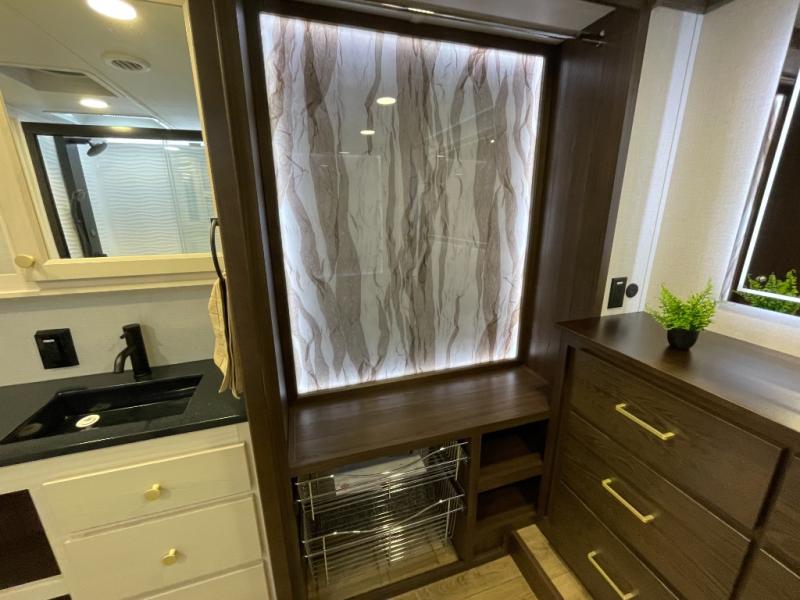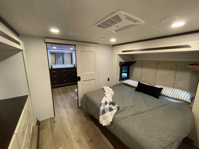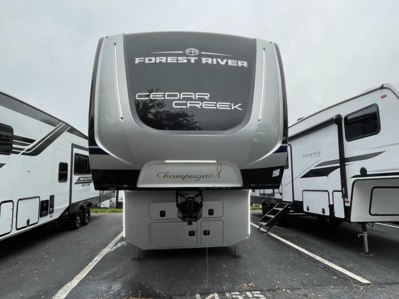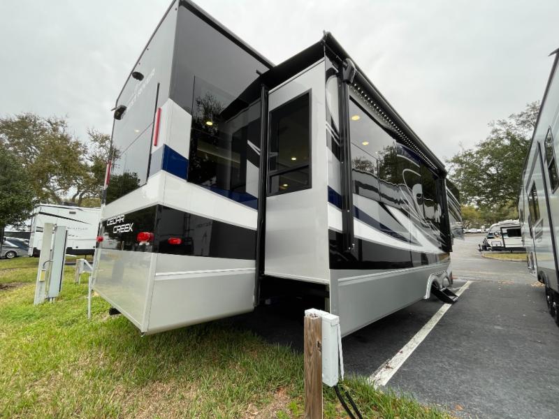 With any Cedar Creek fifth wheel by Forest River, you will find a quality-built RV with your comfort in mind! The all-aluminum super structure on 16" centers or less will provide a solid foundation to your fifth wheel, and the 3M bonded sidewalls will hold up and provide resistance to UV, heat, cold moisture, and even highway chemicals. Each model also includes a Road Warrior suspension for smooth towing, a 6-Point Hydraulic, GEN 3 Leveling System, and a new 101" wide body frame. Inside, you'll enjoy walnut/two tone wooden cabinetry with hidden hinges, cutting board drawer with cut-out trash funnel, motion lighting in the bath and bedroom closet, plus many more comforts. The New Travelfi™ Pay-as-you go internet provides the ability to bring your own internet rather than relying solely on campground WiFi, and the "Rich Solar" 200W solar panel will give you off-grid capabilities!