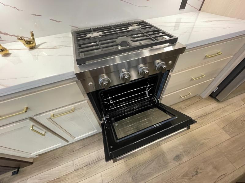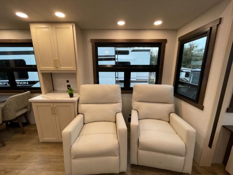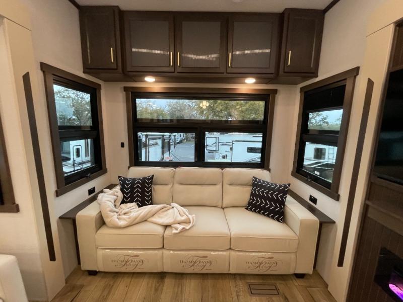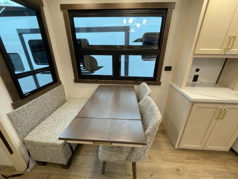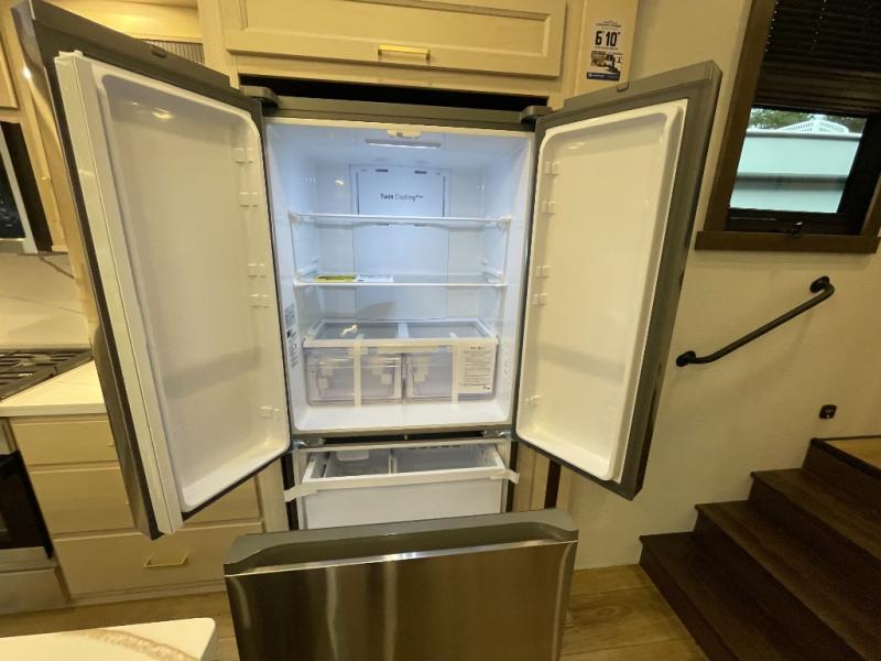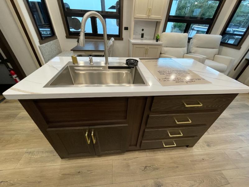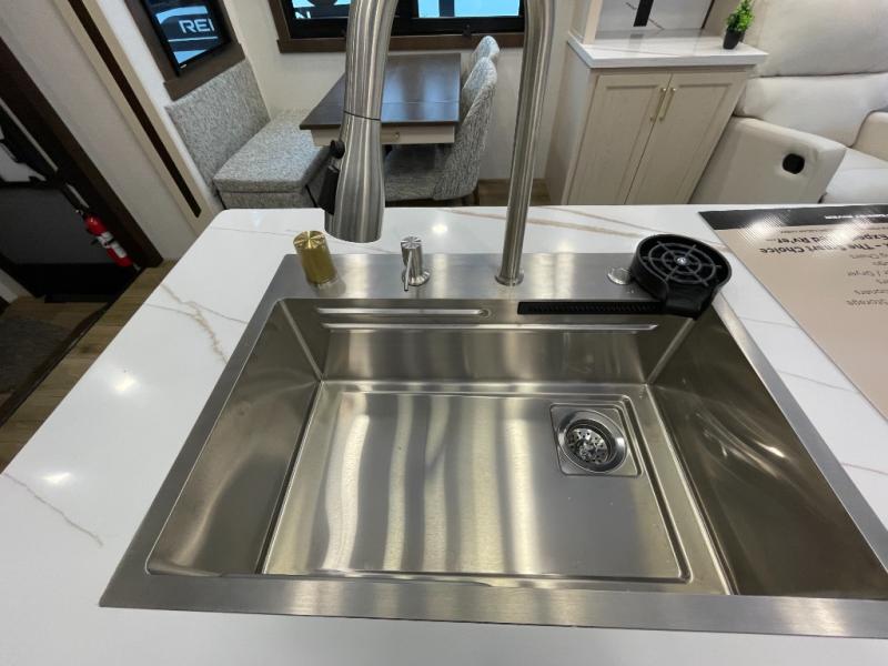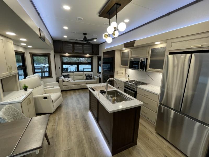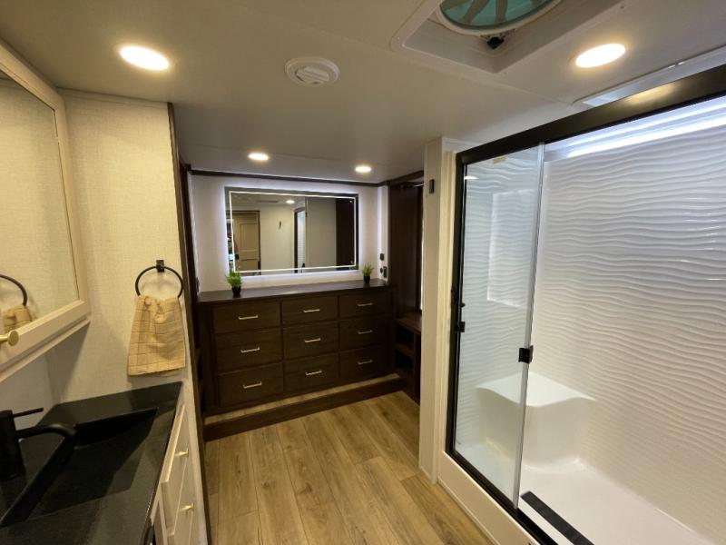 At the front of the 383FB fifth wheel, you’ll find a spacious front bathroom featuring a 48" x 30" shower with a built-in seat and upgraded shower head for a refreshing experience. The 18" high porcelain toilet includes a top circular flush system for added comfort, while LED motion night lighting beneath the vanity adds a convenient touch for nighttime use. This bathroom also provides a walk-in closet with a dresser and shelves equipped with hanging rods, perfect for keeping clothes and essentials neatly organized. Just next to the bathroom, the bedroom houses a king bed in a slide-out, offering plenty of room to stretch out and relax, with additional storage space located across from the bed. Moving toward the rear, the main living area and kitchen open up with dual opposing slides to maximize space and comfort. One slide features a Murphy pantry, a 3-burner gas oven, a 20-cu. ft. stainless steel refrigerator, and a 30" over-the-range microwave with an updated backsplash, while the central kitchen island provides a convenient workspace for the chef on board. Across the way, the opposite slide holds the recliner, table with chairs, and a bench, ideal for dining or lounging after a long day. At the very back, a hide-a-bed sofa offers additional seating and converts easily into extra sleeping space, making this fifth wheel as functional as it is comfortable.