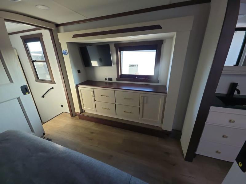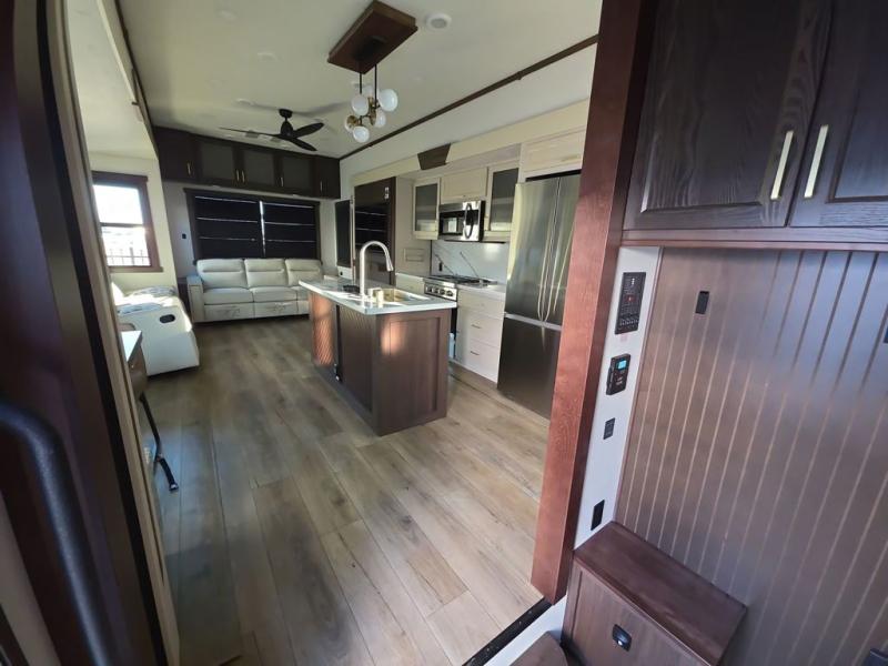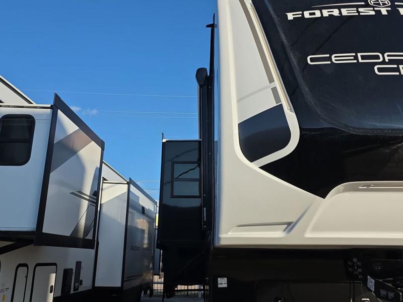 With any Cedar Creek fifth wheel by Forest River, you will find a quality-built RV with your comfort in mind! The all-aluminum super structure on 16" centers or less will provide a solid foundation to your fifth wheel, and the 3M bonded sidewalls will hold up and provide resistance to UV, heat, cold moisture, and even highway chemicals. Each model also includes a Road Warrior suspension for smooth towing, a 6-Point Hydraulic, GEN 3 Leveling System, and a new 101" wide body frame. Inside, you'll enjoy walnut/two tone wooden cabinetry with hidden hinges, cutting board drawer with cut-out trash funnel, motion lighting in the bath and bedroom closet, plus many more comforts. The New Travelfi™ Pay-as-you go internet provides the ability to bring your own internet rather than relying solely on campground WiFi, and the "Rich Solar" 200W solar panel will give you off-grid capabilities!
