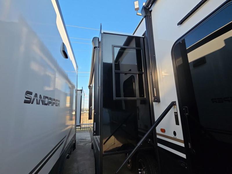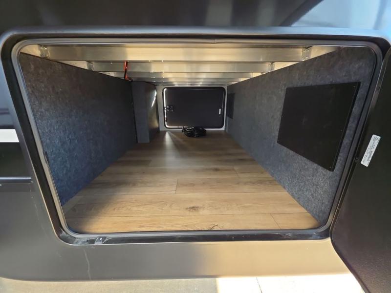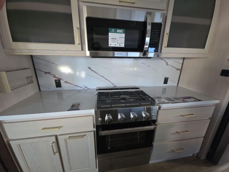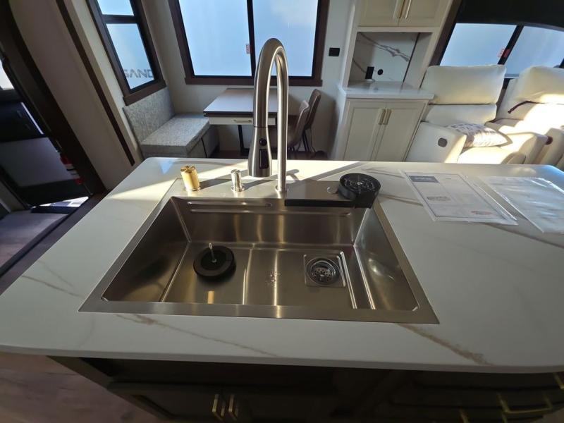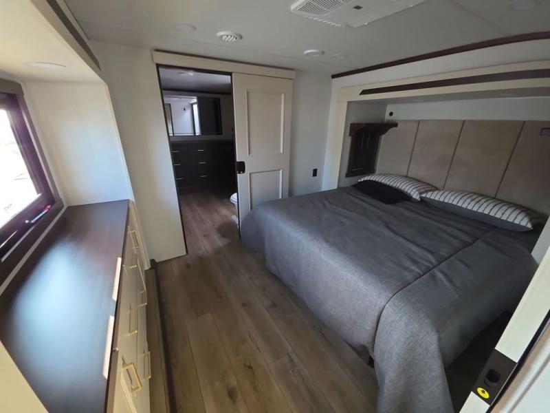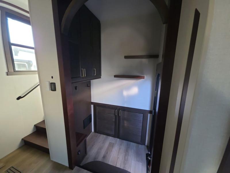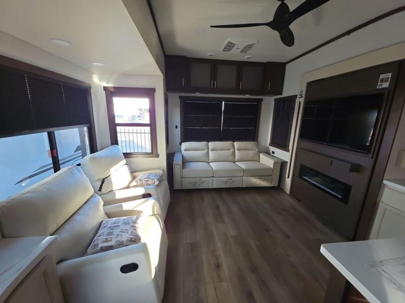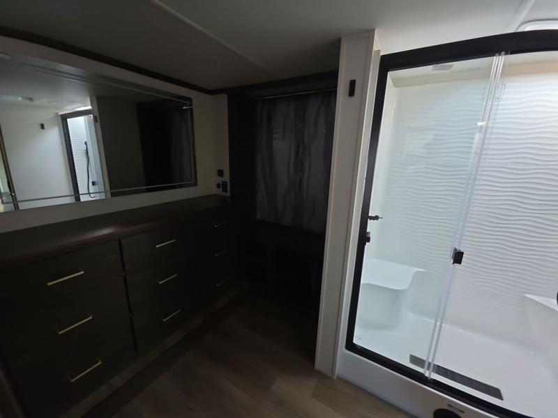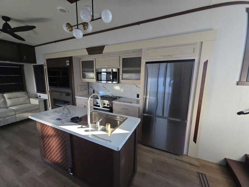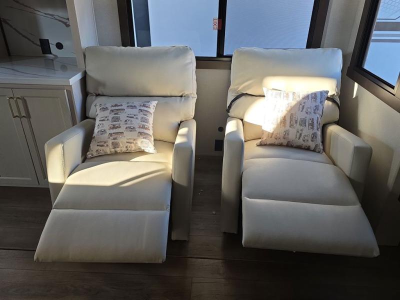 At the front of the 383FB fifth wheel, you’ll find a spacious front bathroom featuring a 48" x 30" shower with a built-in seat and upgraded shower head for a refreshing experience. The 18" high porcelain toilet includes a top circular flush system for added comfort, while LED motion night lighting beneath the vanity adds a convenient touch for nighttime use. This bathroom also provides a walk-in closet with a dresser and shelves equipped with hanging rods, perfect for keeping clothes and essentials neatly organized. Just next to the bathroom, the bedroom houses a king bed in a slide-out, offering plenty of room to stretch out and relax, with additional storage space located across from the bed. Moving toward the rear, the main living area and kitchen open up with dual opposing slides to maximize space and comfort. One slide features a Murphy pantry, a 3-burner gas oven, a 20-cu. ft. stainless steel refrigerator, and a 30" over-the-range microwave with an updated backsplash, while the central kitchen island provides a convenient workspace for the chef on board. Across the way, the opposite slide holds the recliner, table with chairs, and a bench, ideal for dining or lounging after a long day. At the very back, a hide-a-bed sofa offers additional seating and converts easily into extra sleeping space, making this fifth wheel as functional as it is comfortable.