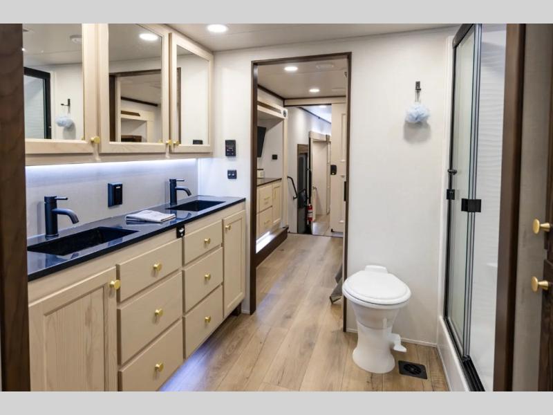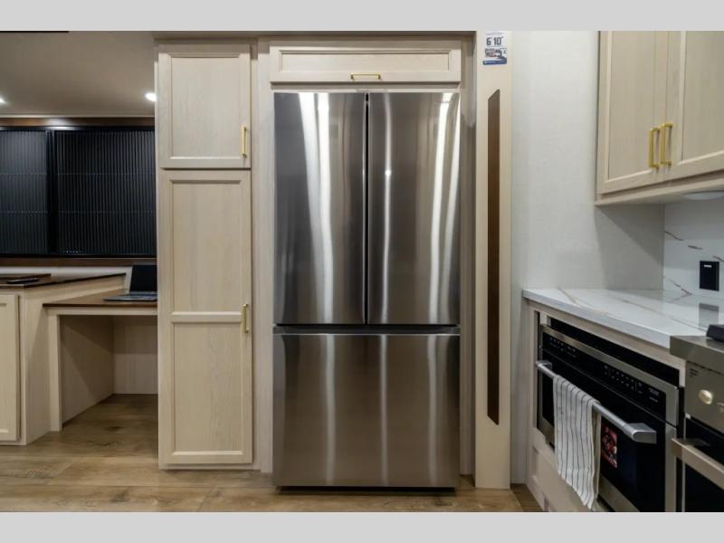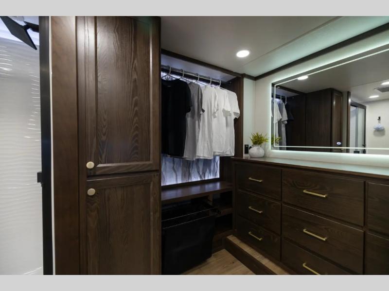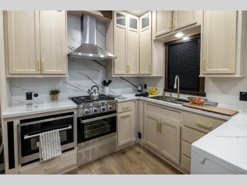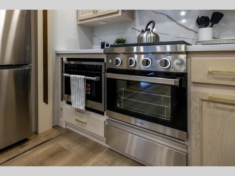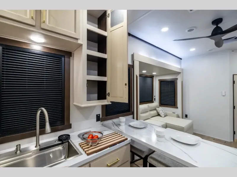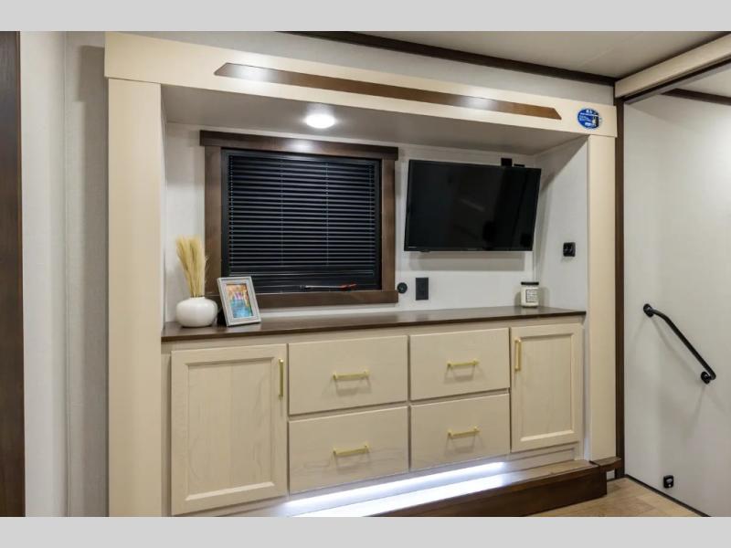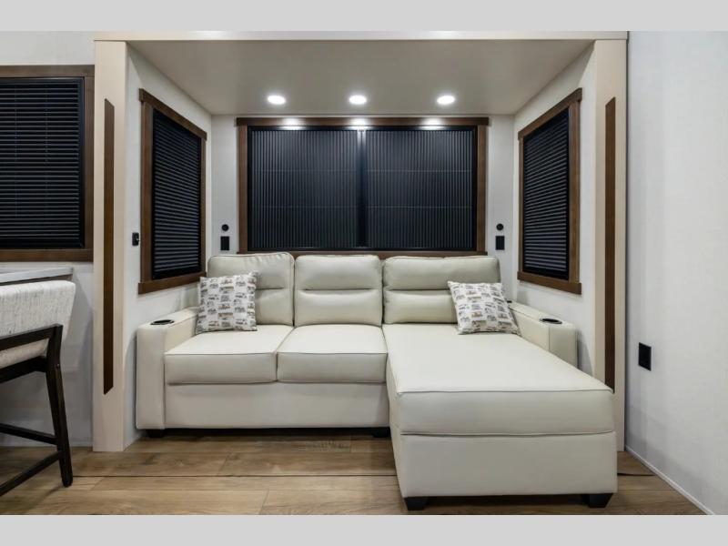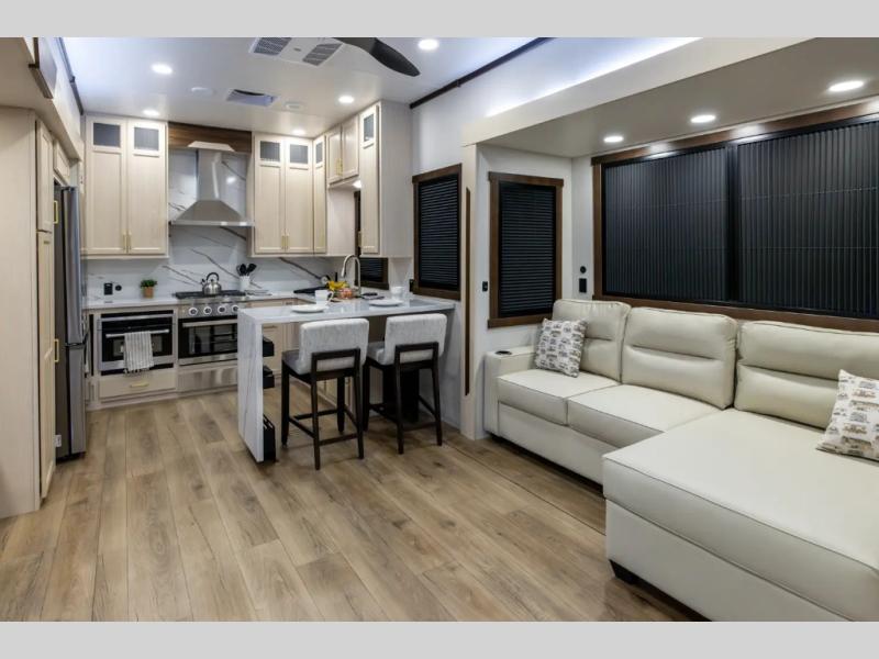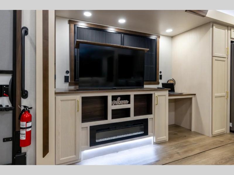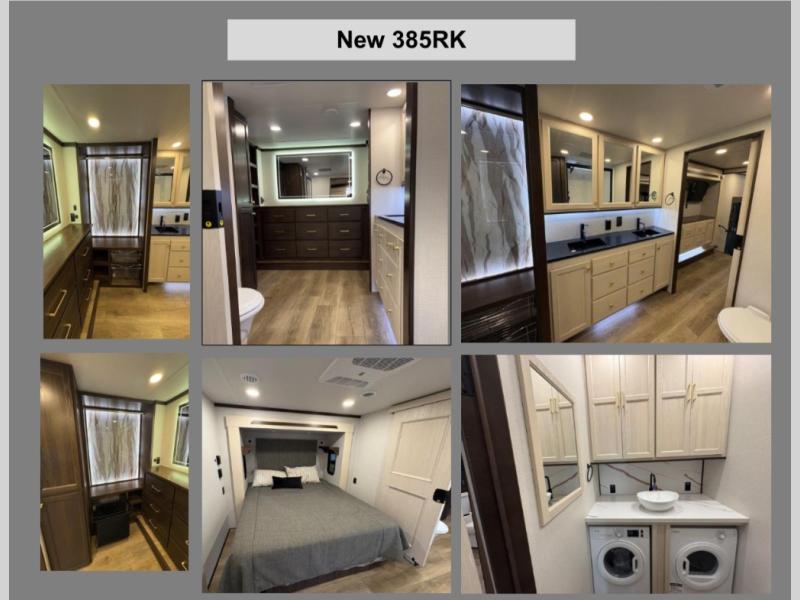 At the front of this 385RK fifth wheel, you’ll find a full bathroom featuring a spacious shower with a built-in seat and convenient LED motion night lighting under the vanity for added comfort. Adjacent to the bathroom is a walk-in closet complete with a dresser and hanging rods, offering ample storage for clothing and gear. Next to this area is the bedroom, which houses a 72" x 80" king bed set in a slide-out for a restful night’s sleep. Across from the bed sits another dresser with a TV, providing extra storage and entertainment. Moving toward the center, a half bath is conveniently located across from the entrance for easy access. The living area opens up with dual opposing slides, creating a roomy lounge space featuring a sectional sofa and an entertainment center with a TV and fireplace, perfect for cozy movie nights. At the rear, the U-shaped kitchen invites the chef of the trip to cook to their heart’s content, equipped with ample overhead cabinets, a 20-cu. ft. stainless steel refrigerator, a 30" stainless steel over-the-range microwave with an updated backsplash, and a 3-burner gas oven with a pull-out pan drawer. Meals can be enjoyed at the convenient bartop with stools to the side, making this fifth wheel both stylish and functional.