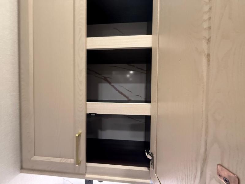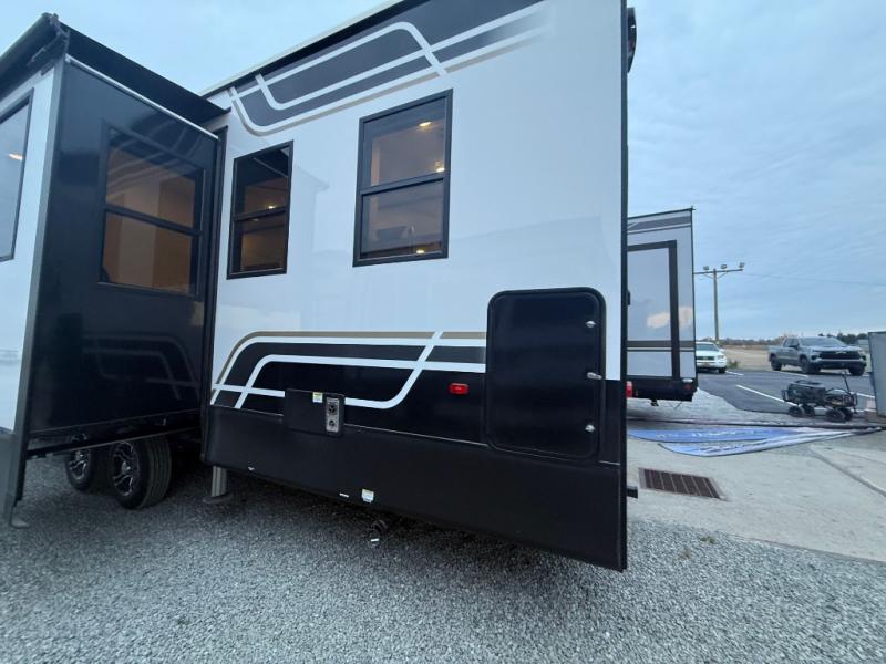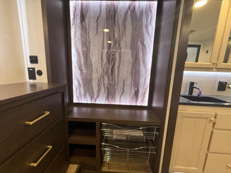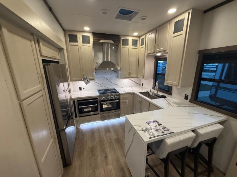At the front of this 385RK fifth wheel, you’ll find a full bathroom featuring a spacious shower with a built-in seat and convenient LED motion night lighting under the vanity for added comfort. Adjacent to the bathroom is a walk-in closet complete with a dresser and hanging rods, offering ample storage for clothing and gear. Next to this area is the bedroom, which houses a 72" x 80" king bed set in a slide-out for a restful night’s sleep. Across from the bed sits another dresser with a TV, providing extra storage and entertainment. Moving toward the center, a half bath is conveniently located across from the entrance for easy access. The living area opens up with dual opposing slides, creating a roomy lounge space featuring a sectional sofa and an entertainment center with a TV and fireplace, perfect for cozy movie nights. At the rear, the U-shaped kitchen invites the chef of the trip to cook to their heart’s content, equipped with ample overhead cabinets, a 20-cu. ft. stainless steel refrigerator, a 30" stainless steel over-the-range microwave with an updated backsplash, and a 3-burner gas oven with a pull-out pan drawer. Meals can be enjoyed at the convenient bartop with stools to the side, making this fifth wheel both stylish and functional.