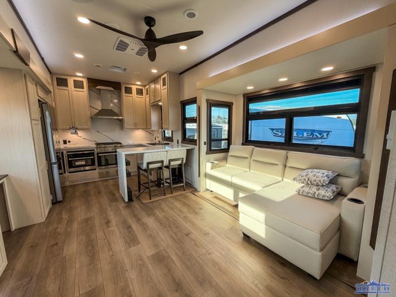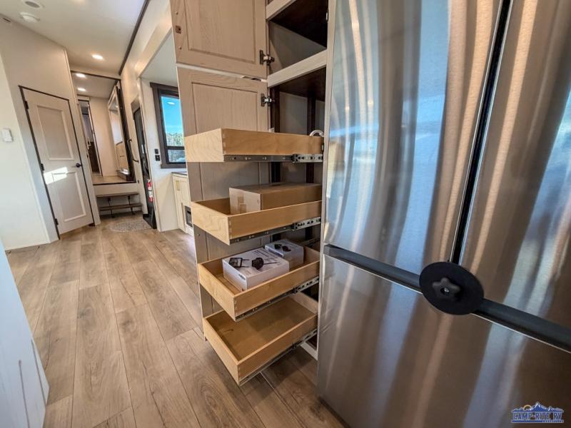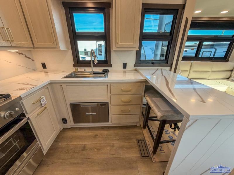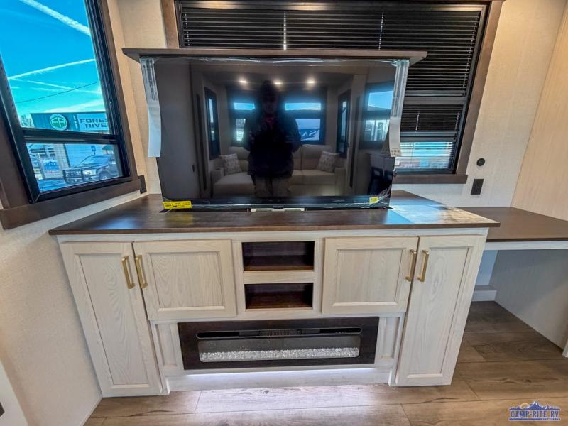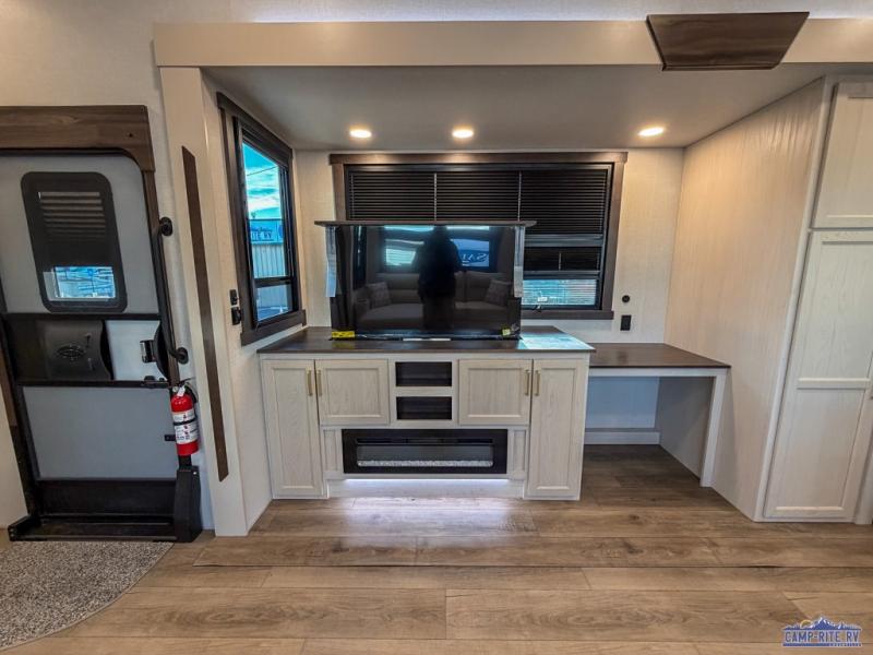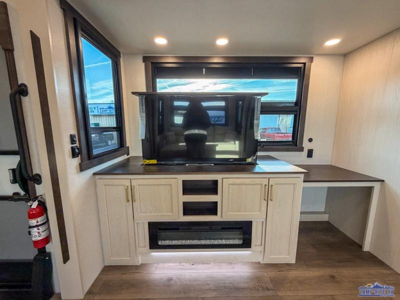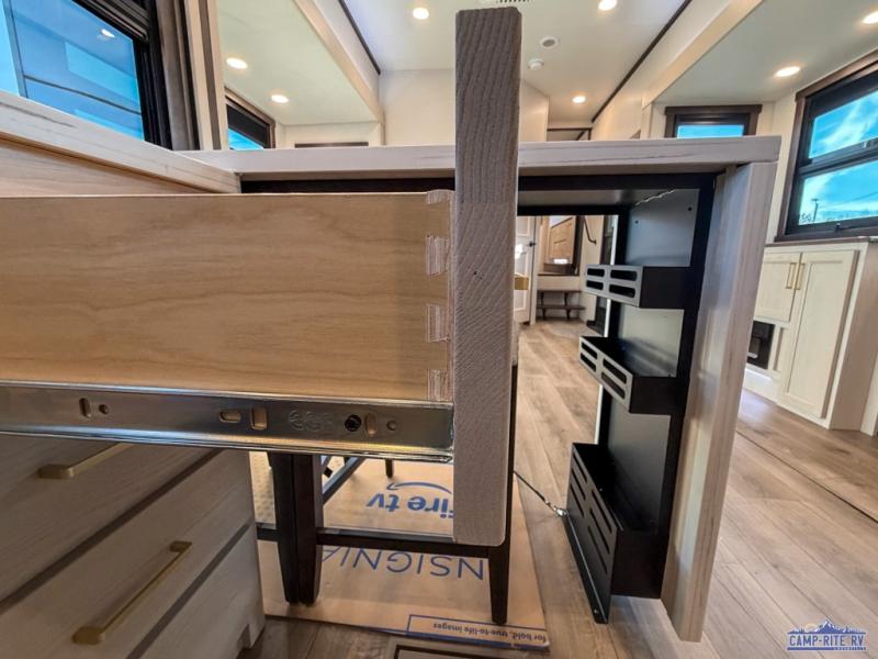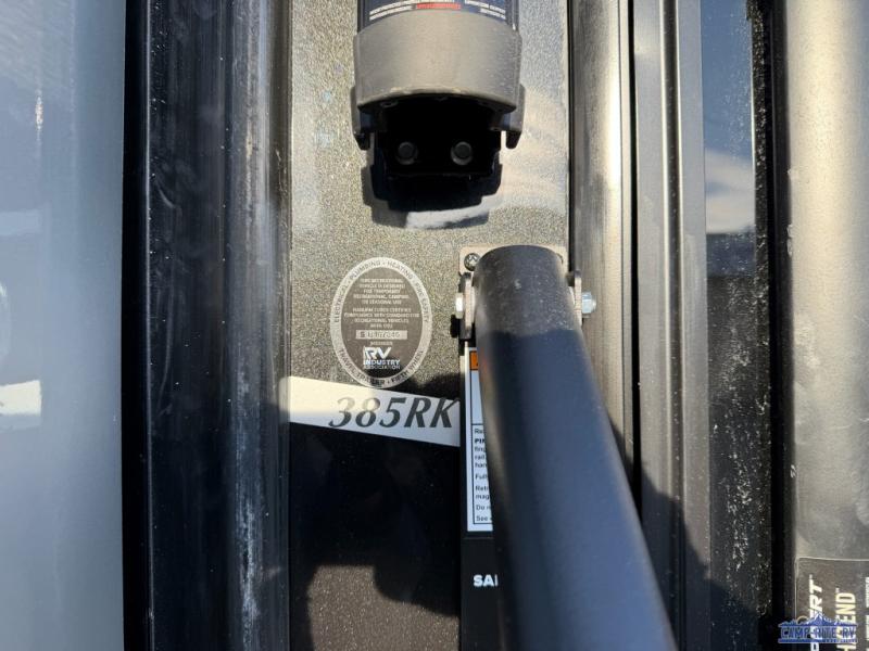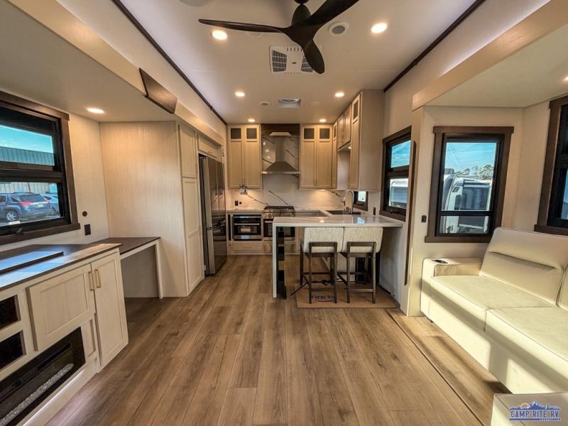 At the front of this 385RK fifth wheel, you’ll find a full bathroom featuring a spacious shower with a built-in seat and convenient LED motion night lighting under the vanity for added comfort. Adjacent to the bathroom is a walk-in closet complete with a dresser and hanging rods, offering ample storage for clothing and gear. Next to this area is the bedroom, which houses a 72" x 80" king bed set in a slide-out for a restful night’s sleep. Across from the bed sits another dresser with a TV, providing extra storage and entertainment. Moving toward the center, a half bath is conveniently located across from the entrance for easy access. The living area opens up with dual opposing slides, creating a roomy lounge space featuring a sectional sofa and an entertainment center with a TV and fireplace, perfect for cozy movie nights. At the rear, the U-shaped kitchen invites the chef of the trip to cook to their heart’s content, equipped with ample overhead cabinets, a 20-cu. ft. stainless steel refrigerator, a 30" stainless steel over-the-range microwave with an updated backsplash, and a 3-burner gas oven with a pull-out pan drawer. Meals can be enjoyed at the convenient bartop with stools to the side, making this fifth wheel both stylish and functional.
