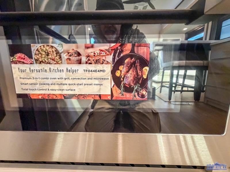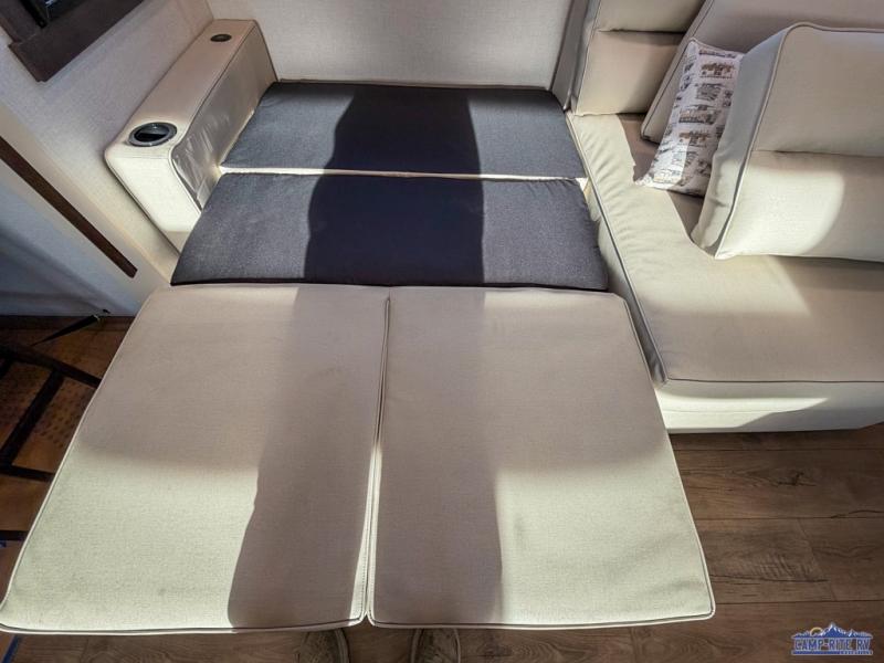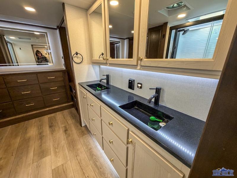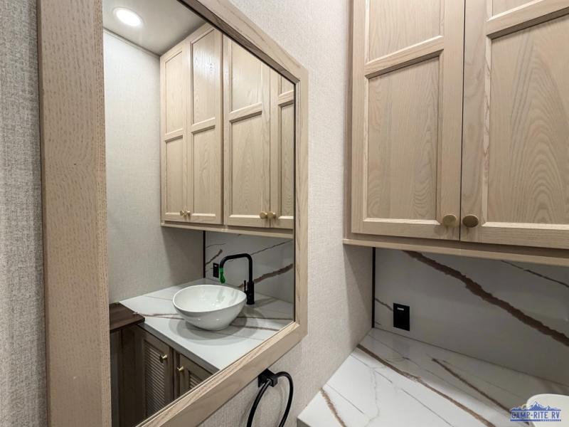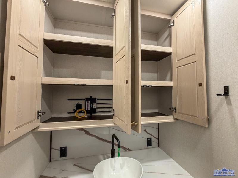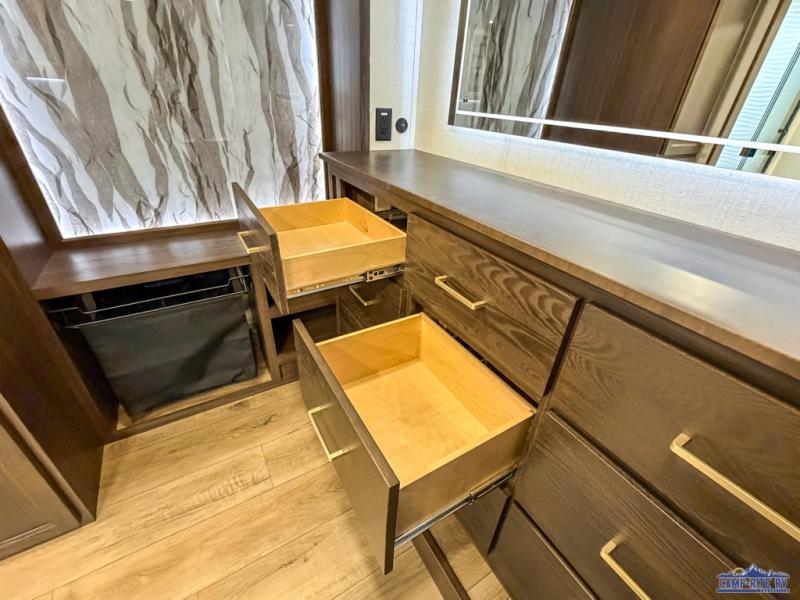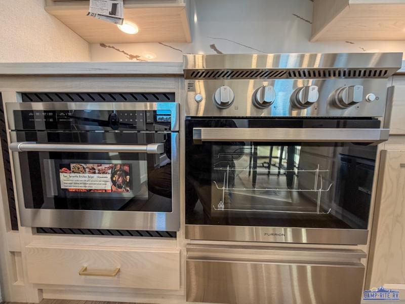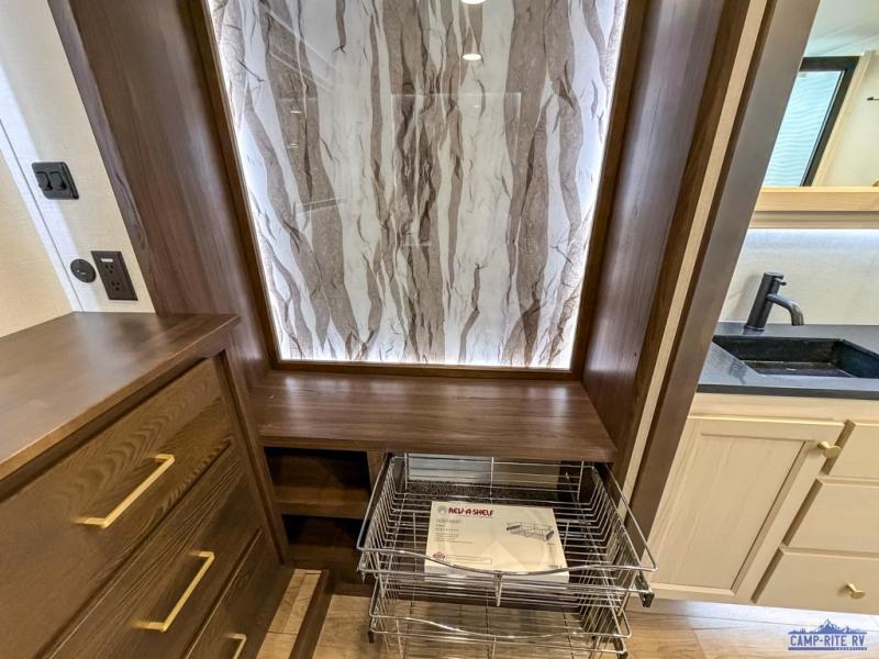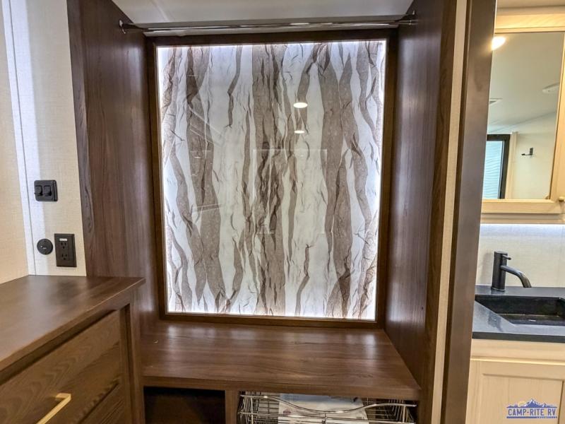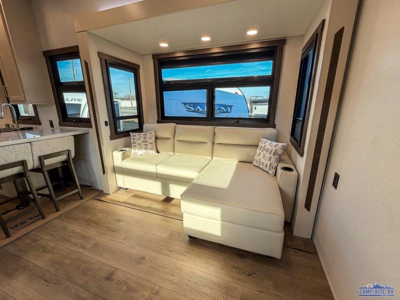 At the front of this 385RK fifth wheel, you’ll find a full bathroom featuring a spacious shower with a built-in seat and convenient LED motion night lighting under the vanity for added comfort. Adjacent to the bathroom is a walk-in closet complete with a dresser and hanging rods, offering ample storage for clothing and gear. Next to this area is the bedroom, which houses a 72" x 80" king bed set in a slide-out for a restful night’s sleep. Across from the bed sits another dresser with a TV, providing extra storage and entertainment. Moving toward the center, a half bath is conveniently located across from the entrance for easy access. The living area opens up with dual opposing slides, creating a roomy lounge space featuring a sectional sofa and an entertainment center with a TV and fireplace, perfect for cozy movie nights. At the rear, the U-shaped kitchen invites the chef of the trip to cook to their heart’s content, equipped with ample overhead cabinets, a 20-cu. ft. stainless steel refrigerator, a 30" stainless steel over-the-range microwave with an updated backsplash, and a 3-burner gas oven with a pull-out pan drawer. Meals can be enjoyed at the convenient bartop with stools to the side, making this fifth wheel both stylish and functional.