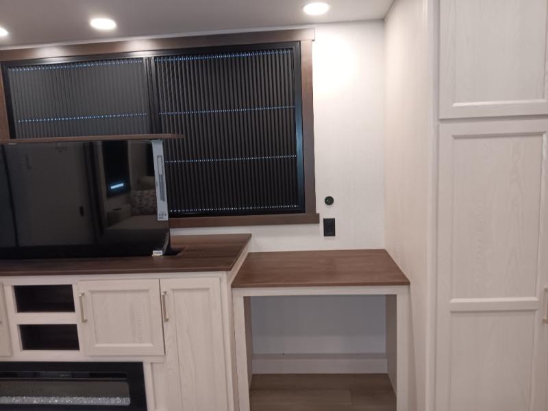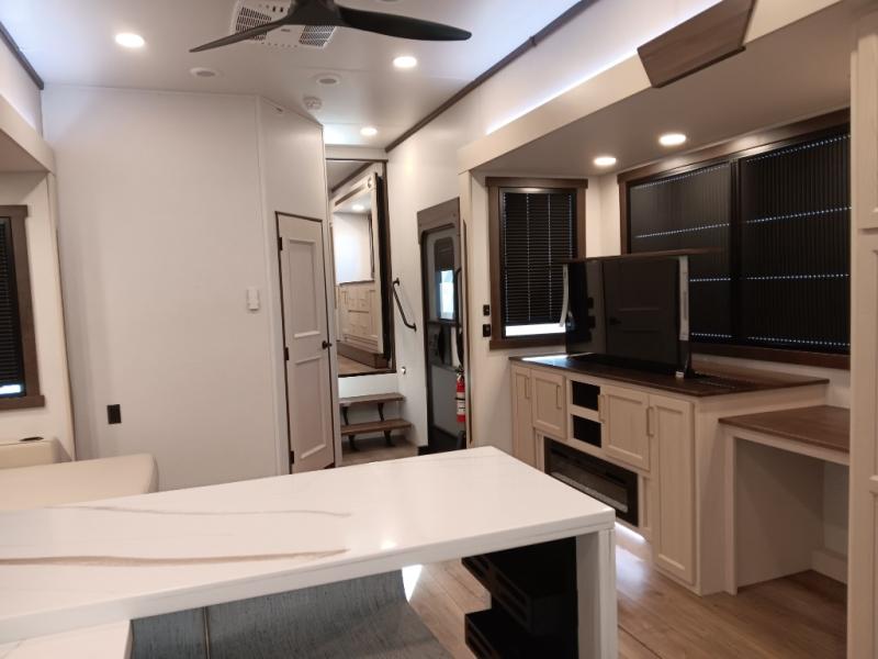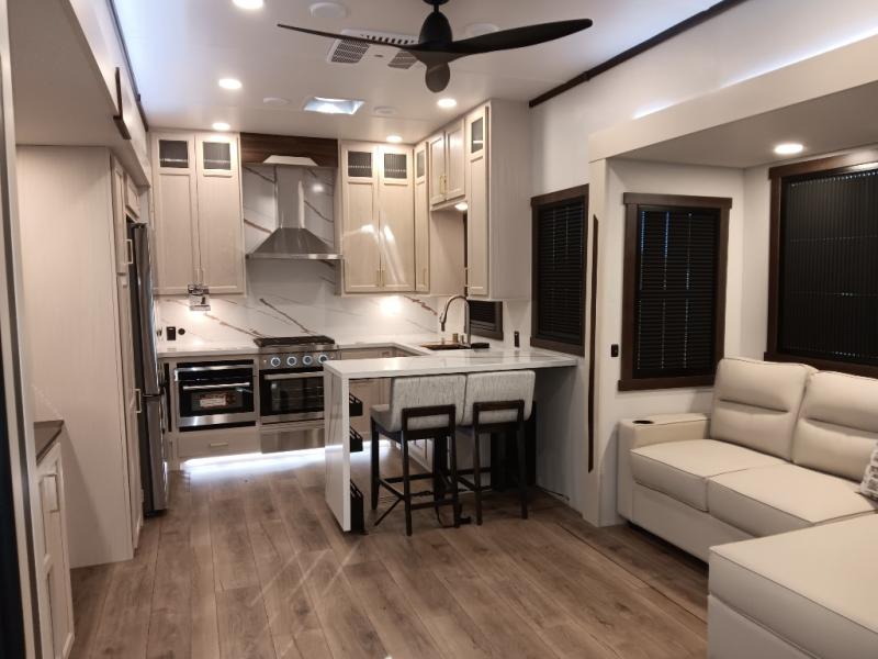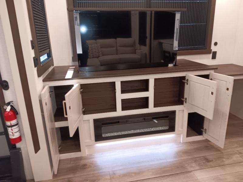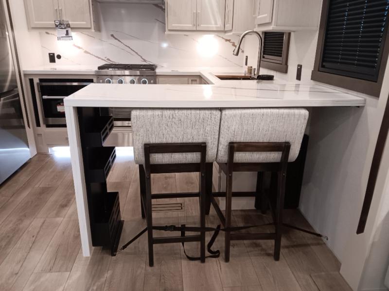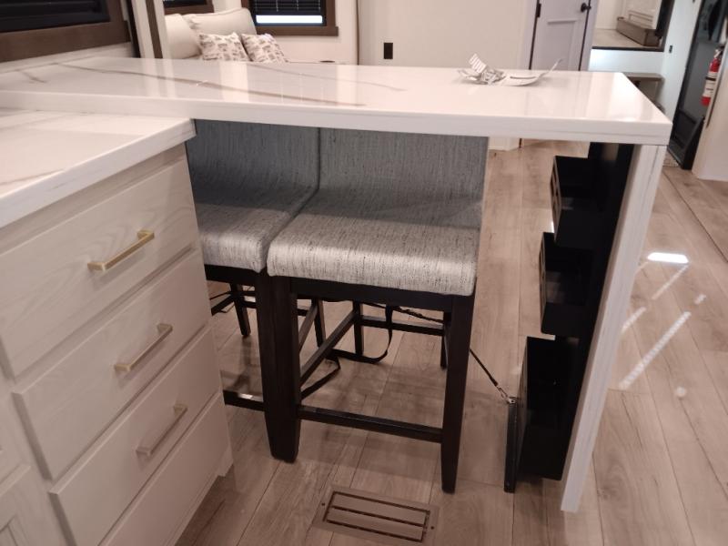 At the front of this 385RK fifth wheel, you’ll find a full bathroom featuring a spacious shower with a built-in seat and convenient LED motion night lighting under the vanity for added comfort. Adjacent to the bathroom is a walk-in closet complete with a dresser and hanging rods, offering ample storage for clothing and gear. Next to this area is the bedroom, which houses a 72" x 80" king bed set in a slide-out for a restful night’s sleep. Across from the bed sits another dresser with a TV, providing extra storage and entertainment. Moving toward the center, a half bath is conveniently located across from the entrance for easy access. The living area opens up with dual opposing slides, creating a roomy lounge space featuring a sectional sofa and an entertainment center with a TV and fireplace, perfect for cozy movie nights. At the rear, the U-shaped kitchen invites the chef of the trip to cook to their heart’s content, equipped with ample overhead cabinets, a 20-cu. ft. stainless steel refrigerator, a 30" stainless steel over-the-range microwave with an updated backsplash, and a 3-burner gas oven with a pull-out pan drawer. Meals can be enjoyed at the convenient bartop with stools to the side, making this fifth wheel both stylish and functional.