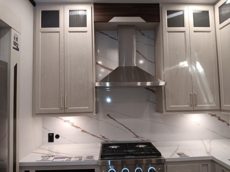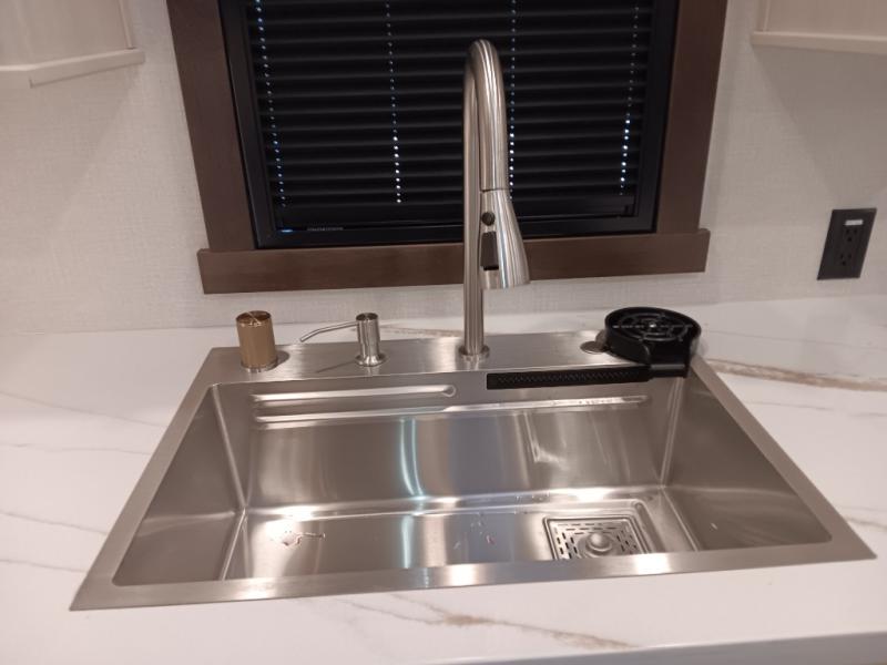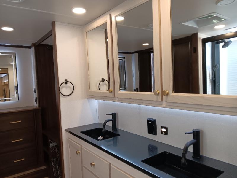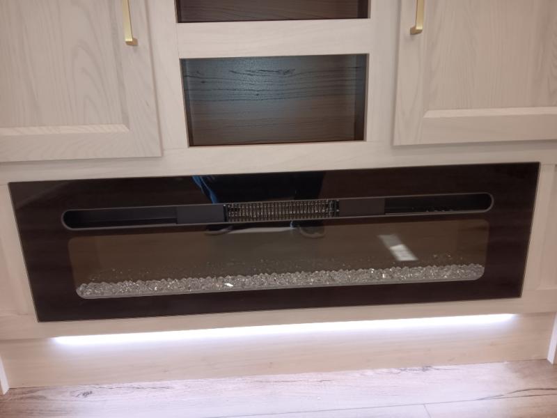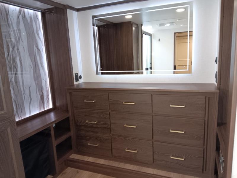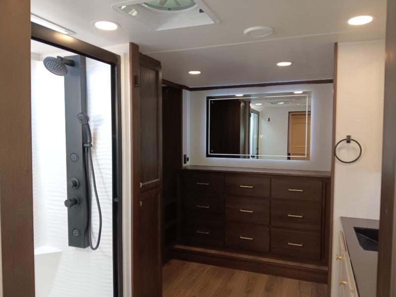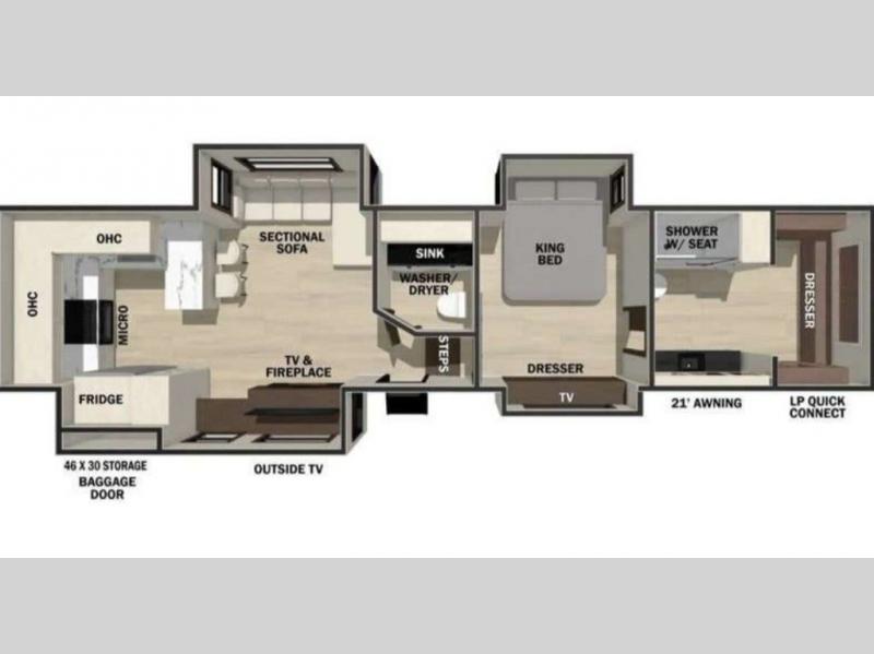At the front of this 385RK fifth wheel, you’ll find a full bathroom featuring a spacious shower with a built-in seat and convenient LED motion night lighting under the vanity for added comfort. Adjacent to the bathroom is a walk-in closet complete with a dresser and hanging rods, offering ample storage for clothing and gear. Next to this area is the bedroom, which houses a 72" x 80" king bed set in a slide-out for a restful night’s sleep. Across from the bed sits another dresser with a TV, providing extra storage and entertainment. Moving toward the center, a half bath is conveniently located across from the entrance for easy access. The living area opens up with dual opposing slides, creating a roomy lounge space featuring a sectional sofa and an entertainment center with a TV and fireplace, perfect for cozy movie nights. At the rear, the U-shaped kitchen invites the chef of the trip to cook to their heart’s content, equipped with ample overhead cabinets, a 20-cu. ft. stainless steel refrigerator, a 30" stainless steel over-the-range microwave with an updated backsplash, and a 3-burner gas oven with a pull-out pan drawer. Meals can be enjoyed at the convenient bartop with stools to the side, making this fifth wheel both stylish and functional.