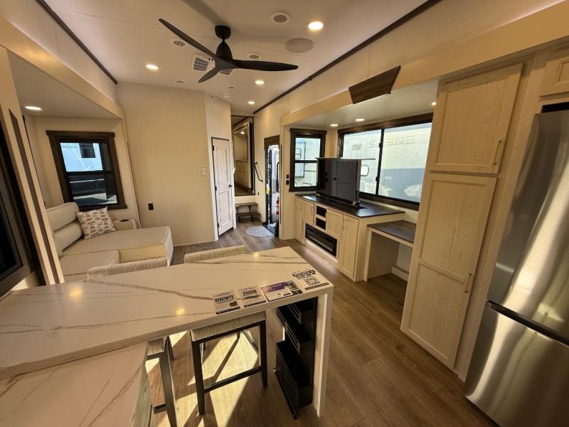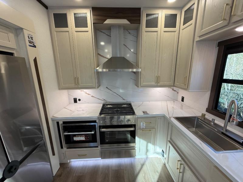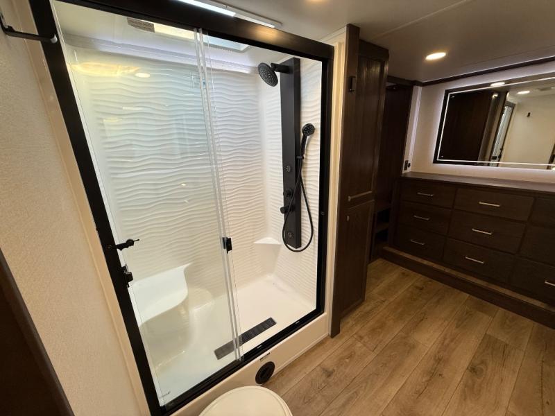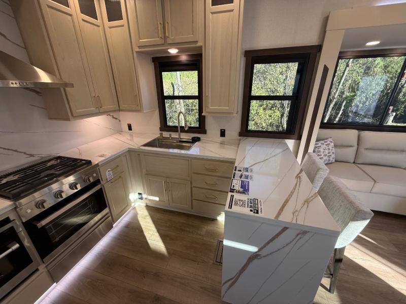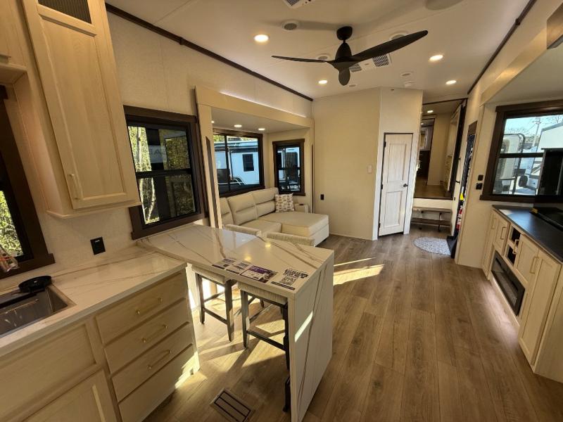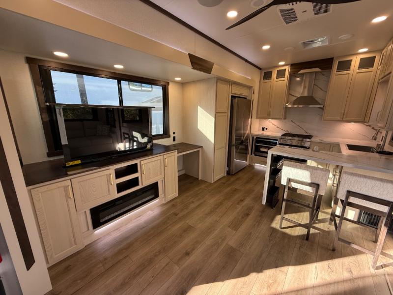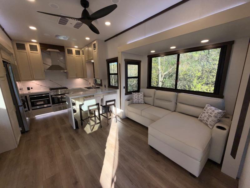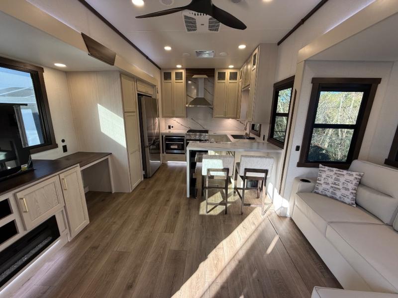 At the front of this 385RK fifth wheel, you’ll find a full bathroom featuring a spacious shower with a built-in seat and convenient LED motion night lighting under the vanity for added comfort. Adjacent to the bathroom is a walk-in closet complete with a dresser and hanging rods, offering ample storage for clothing and gear. Next to this area is the bedroom, which houses a 72" x 80" king bed set in a slide-out for a restful night’s sleep. Across from the bed sits another dresser with a TV, providing extra storage and entertainment. Moving toward the center, a half bath is conveniently located across from the entrance for easy access. The living area opens up with dual opposing slides, creating a roomy lounge space featuring a sectional sofa and an entertainment center with a TV and fireplace, perfect for cozy movie nights. At the rear, the U-shaped kitchen invites the chef of the trip to cook to their heart’s content, equipped with ample overhead cabinets, a 20-cu. ft. stainless steel refrigerator, a 30" stainless steel over-the-range microwave with an updated backsplash, and a 3-burner gas oven with a pull-out pan drawer. Meals can be enjoyed at the convenient bartop with stools to the side, making this fifth wheel both stylish and functional.