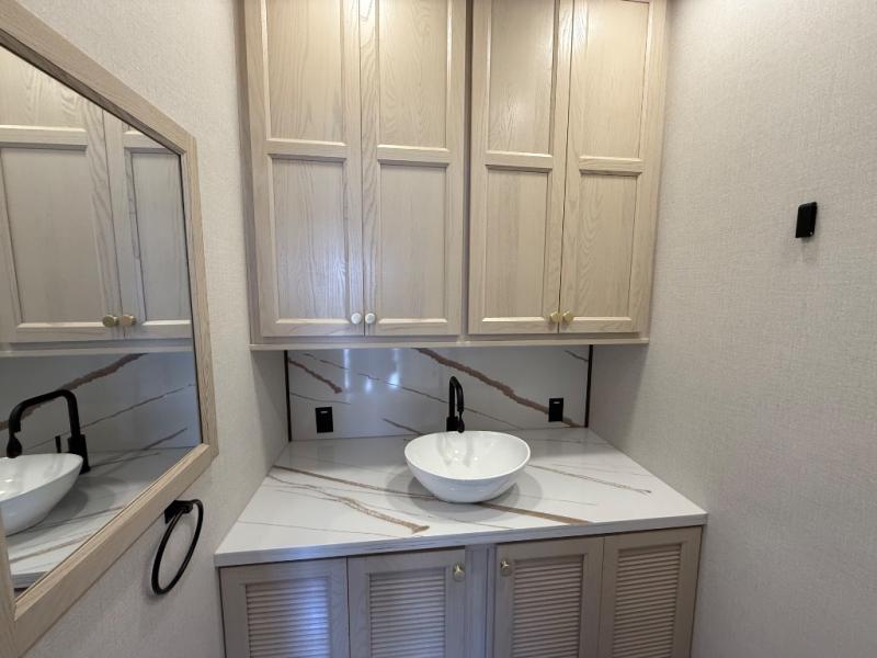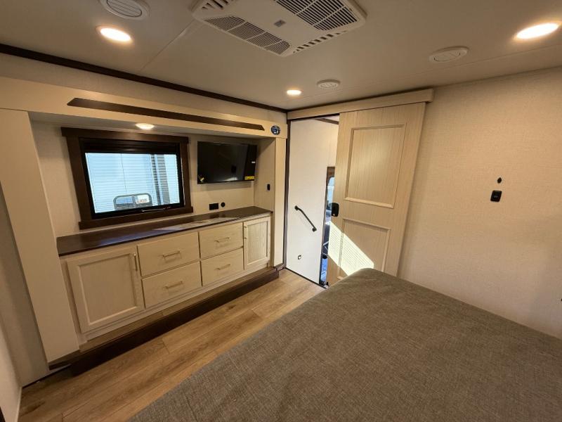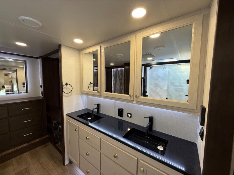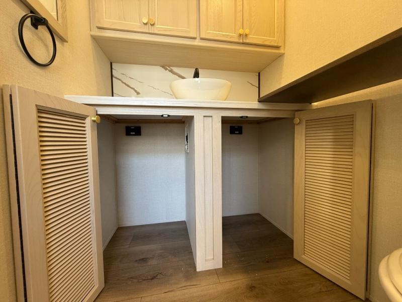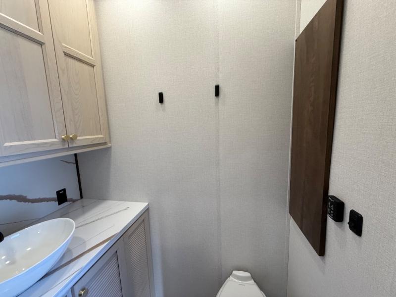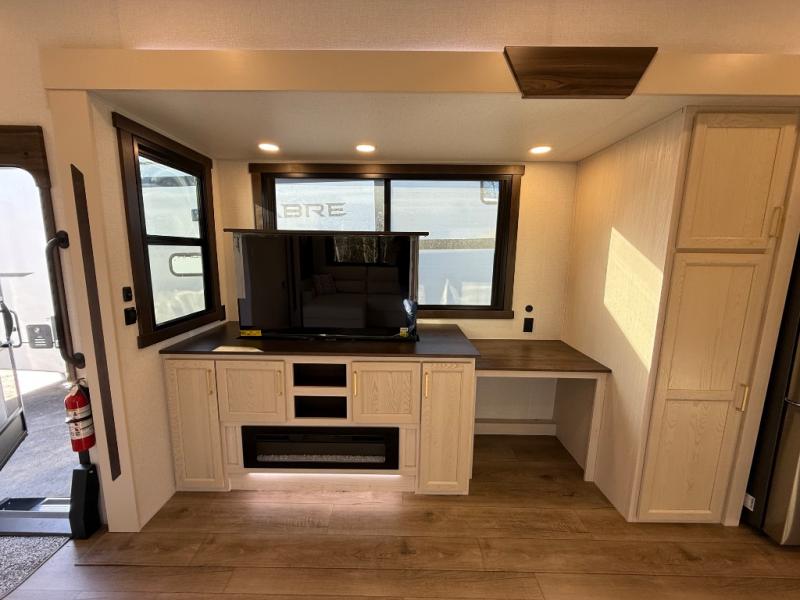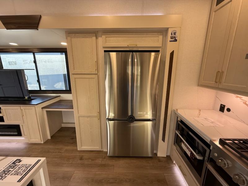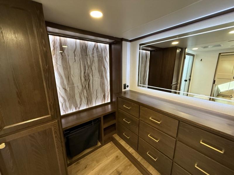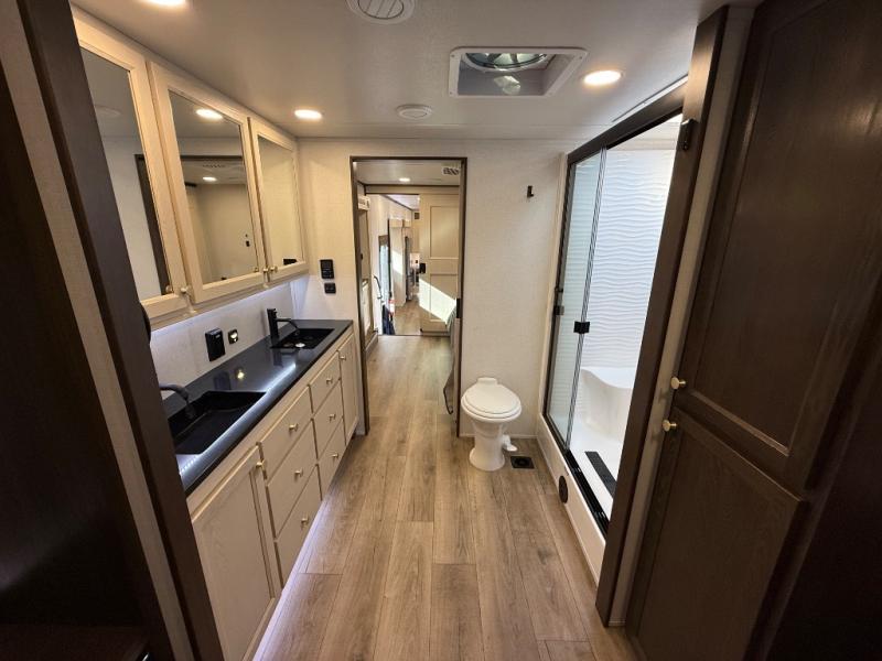 At the front of this 385RK fifth wheel, you’ll find a full bathroom featuring a spacious shower with a built-in seat and convenient LED motion night lighting under the vanity for added comfort. Adjacent to the bathroom is a walk-in closet complete with a dresser and hanging rods, offering ample storage for clothing and gear. Next to this area is the bedroom, which houses a 72" x 80" king bed set in a slide-out for a restful night’s sleep. Across from the bed sits another dresser with a TV, providing extra storage and entertainment. Moving toward the center, a half bath is conveniently located across from the entrance for easy access. The living area opens up with dual opposing slides, creating a roomy lounge space featuring a sectional sofa and an entertainment center with a TV and fireplace, perfect for cozy movie nights. At the rear, the U-shaped kitchen invites the chef of the trip to cook to their heart’s content, equipped with ample overhead cabinets, a 20-cu. ft. stainless steel refrigerator, a 30" stainless steel over-the-range microwave with an updated backsplash, and a 3-burner gas oven with a pull-out pan drawer. Meals can be enjoyed at the convenient bartop with stools to the side, making this fifth wheel both stylish and functional.