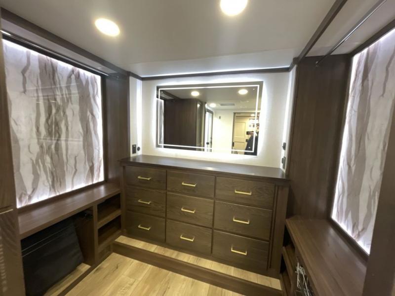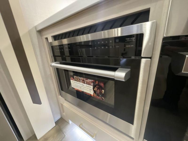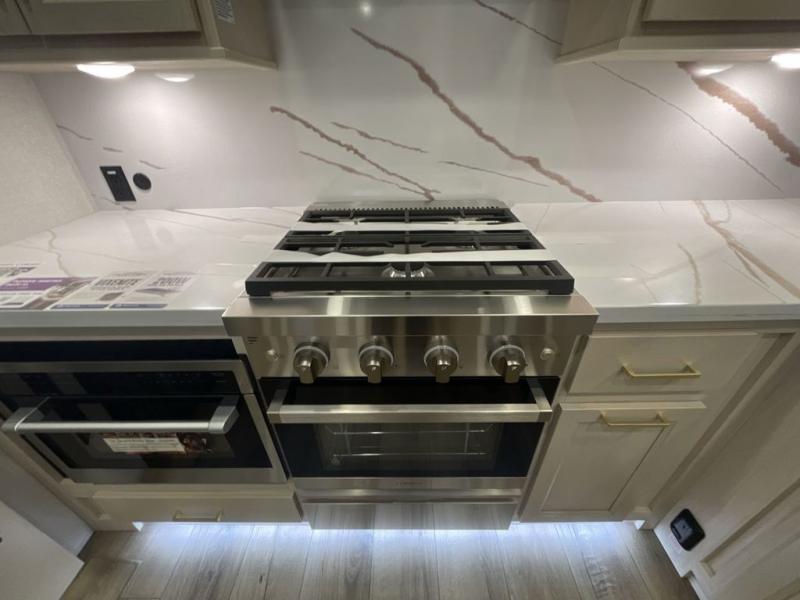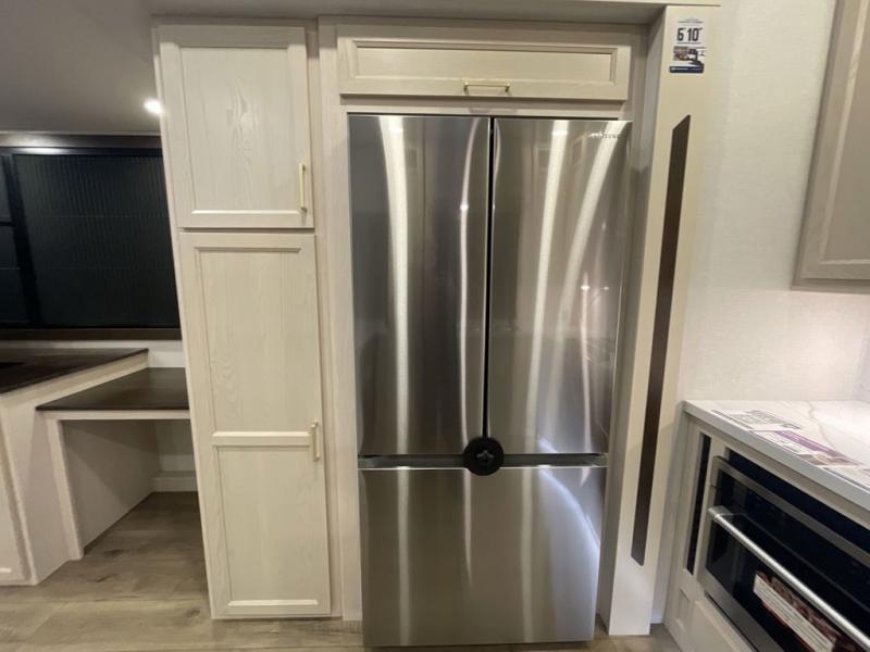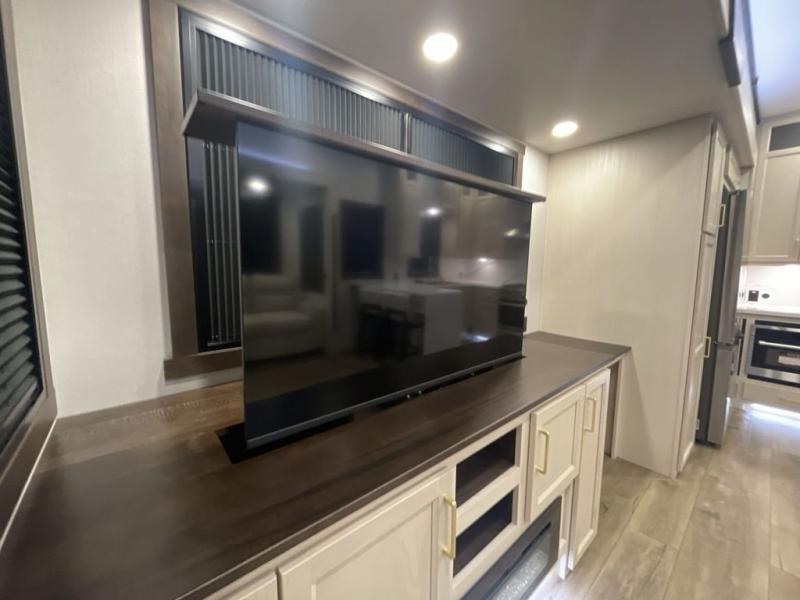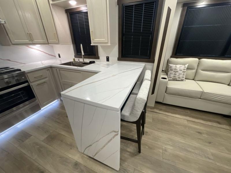 At the front of this 385RK fifth wheel, you’ll find a full bathroom featuring a spacious shower with a built-in seat and convenient LED motion night lighting under the vanity for added comfort. Adjacent to the bathroom is a walk-in closet complete with a dresser and hanging rods, offering ample storage for clothing and gear. Next to this area is the bedroom, which houses a 72" x 80" king bed set in a slide-out for a restful night’s sleep. Across from the bed sits another dresser with a TV, providing extra storage and entertainment. Moving toward the center, a half bath is conveniently located across from the entrance for easy access. The living area opens up with dual opposing slides, creating a roomy lounge space featuring a sectional sofa and an entertainment center with a TV and fireplace, perfect for cozy movie nights. At the rear, the U-shaped kitchen invites the chef of the trip to cook to their heart’s content, equipped with ample overhead cabinets, a 20-cu. ft. stainless steel refrigerator, a 30" stainless steel over-the-range microwave with an updated backsplash, and a 3-burner gas oven with a pull-out pan drawer. Meals can be enjoyed at the convenient bartop with stools to the side, making this fifth wheel both stylish and functional.