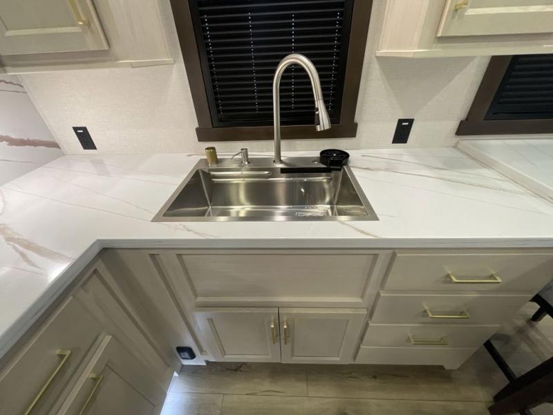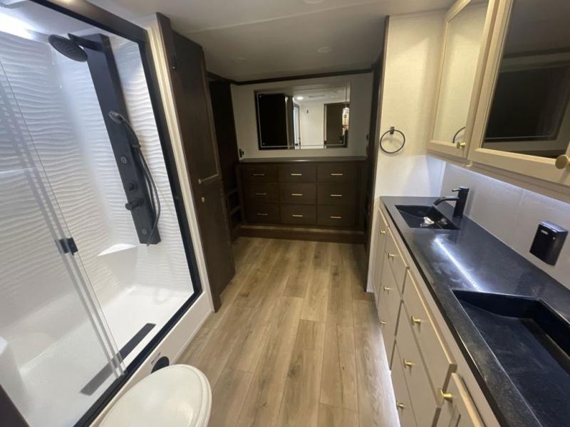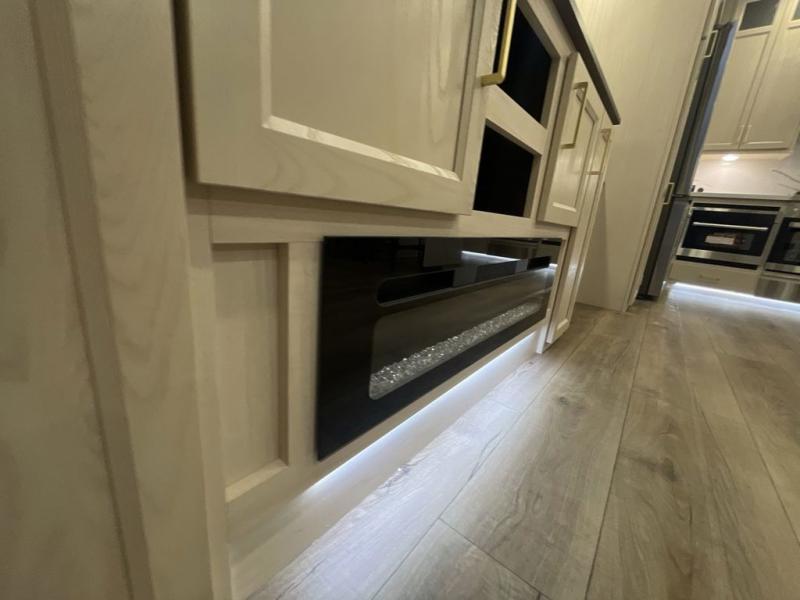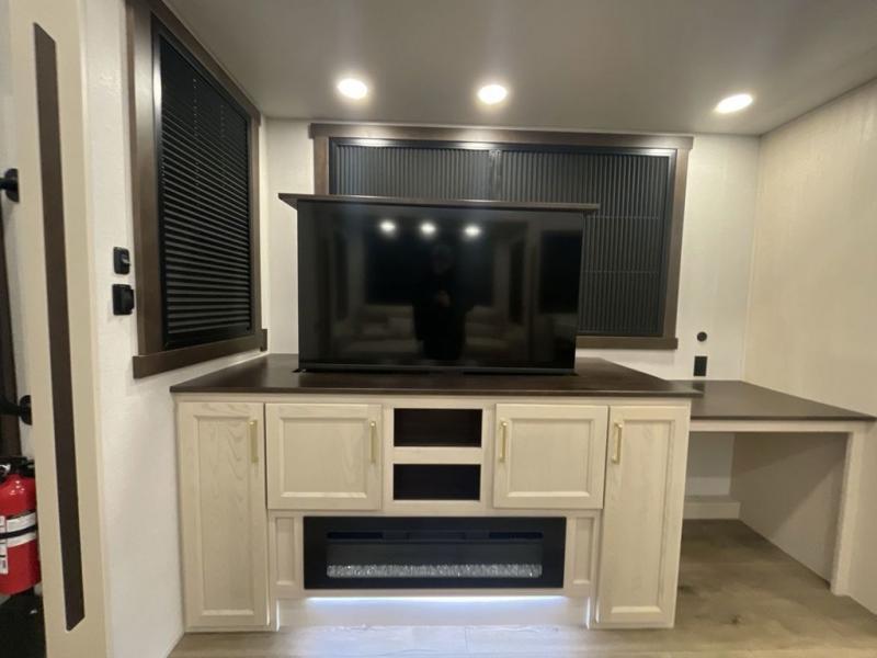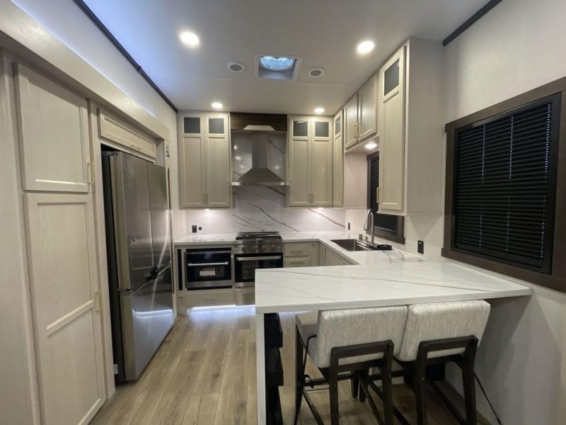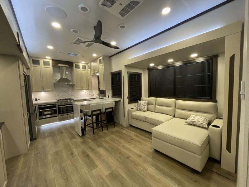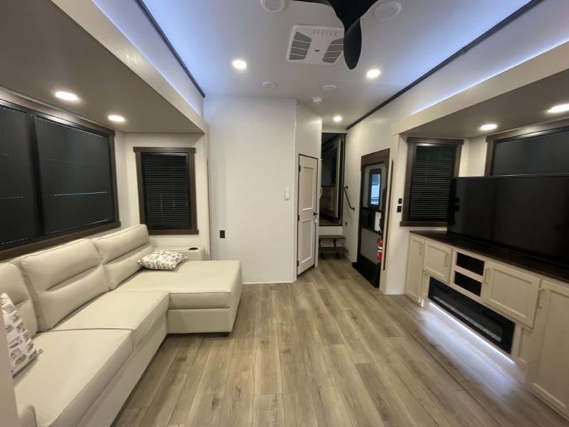 At the front of this 385RK fifth wheel, you’ll find a full bathroom featuring a spacious shower with a built-in seat and convenient LED motion night lighting under the vanity for added comfort. Adjacent to the bathroom is a walk-in closet complete with a dresser and hanging rods, offering ample storage for clothing and gear. Next to this area is the bedroom, which houses a 72" x 80" king bed set in a slide-out for a restful night’s sleep. Across from the bed sits another dresser with a TV, providing extra storage and entertainment. Moving toward the center, a half bath is conveniently located across from the entrance for easy access. The living area opens up with dual opposing slides, creating a roomy lounge space featuring a sectional sofa and an entertainment center with a TV and fireplace, perfect for cozy movie nights. At the rear, the U-shaped kitchen invites the chef of the trip to cook to their heart’s content, equipped with ample overhead cabinets, a 20-cu. ft. stainless steel refrigerator, a 30" stainless steel over-the-range microwave with an updated backsplash, and a 3-burner gas oven with a pull-out pan drawer. Meals can be enjoyed at the convenient bartop with stools to the side, making this fifth wheel both stylish and functional.