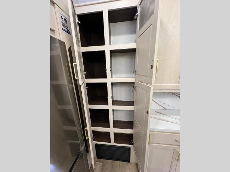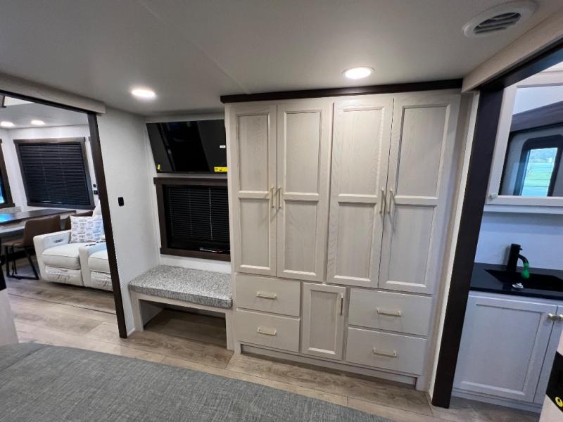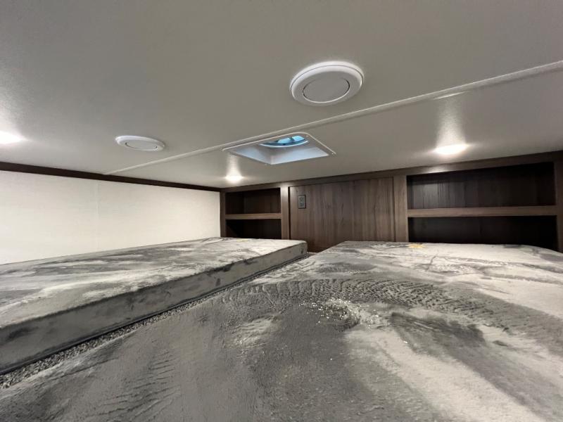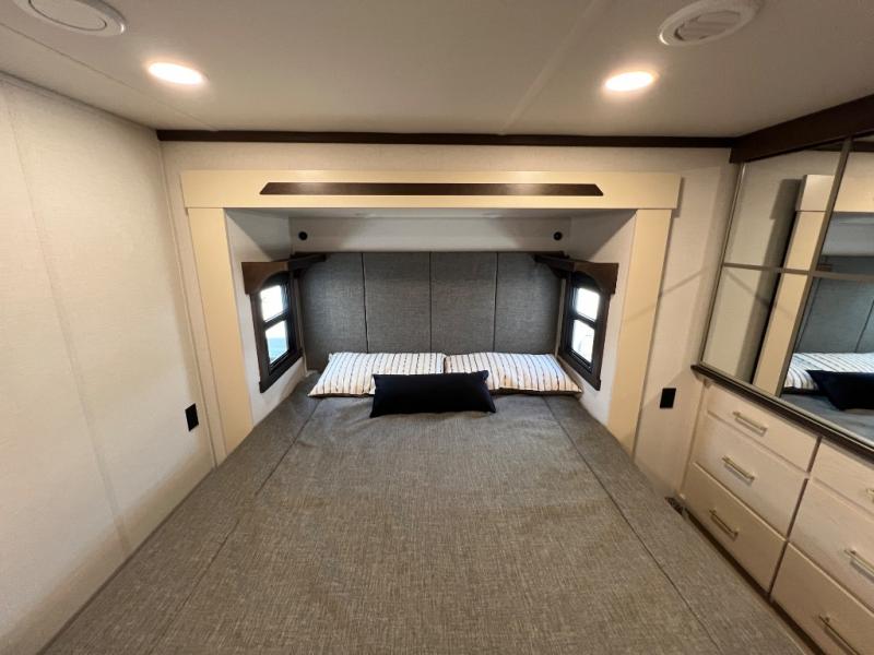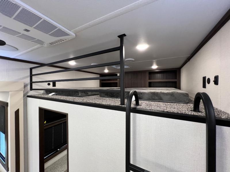 At the front of the fifth wheel, you’ll find one of the two spacious bedrooms, featuring a king bed in the slide-out for a restful night’s sleep. This bedroom is thoughtfully designed with a wardrobe, shelves, and a dresser topped with a TV, providing plenty of storage for clothing and essentials. Down the hall, a full bathroom awaits, complete with a shower featuring a built-in seat for added accessibility, linen shelves, and LED motion lighting under the vanity for convenient nighttime use. Moving toward the center, the main living area opens up with dual opposing slides, creating an inviting space to relax. One slide hosts the Murphy pantry, a 3-burner gas oven, a 30" over-the-range microwave, and a 20-cu. ft. stainless steel refrigerator, all complemented by a kitchen island with a sink for extra counter space. Opposite, the power theater seats and dining area with a table, chairs, and bench, offer a perfect spot to gather. At the rear, the second bedroom also features a king bed in a slide-out, a dresser, and its own full bathroom for added comfort and privacy. For even more sleeping space, a loft above includes two 40" x 67" bunk mats and additional cabinets, ideal for hosting family and guests.