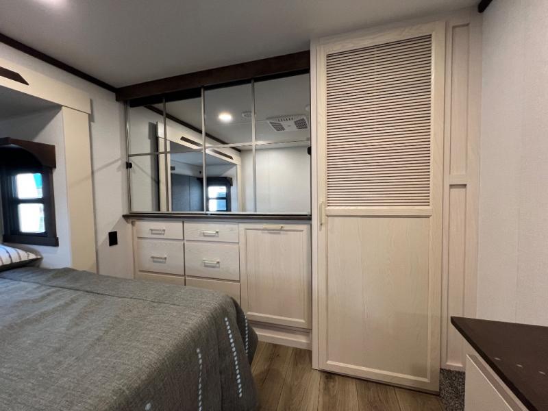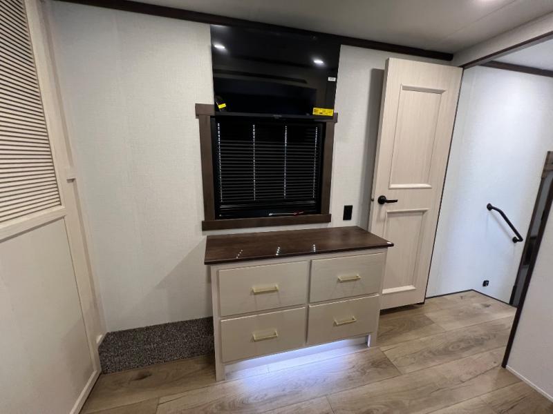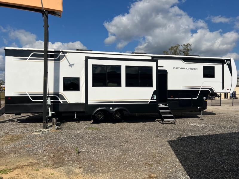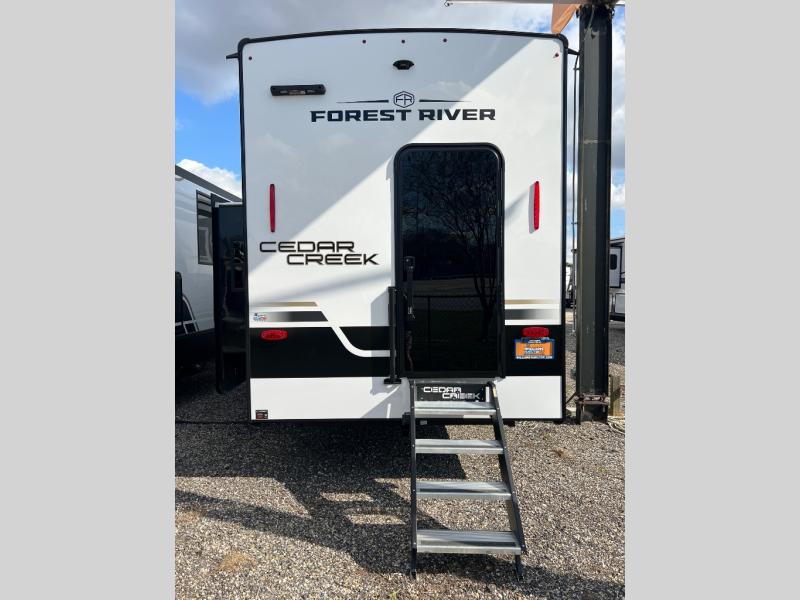 With any Cedar Creek fifth wheel by Forest River, you will find a quality-built RV with your comfort in mind! The all-aluminum super structure on 16" centers or less will provide a solid foundation to your fifth wheel, and the 3M bonded sidewalls will hold up and provide resistance to UV, heat, cold moisture, and even highway chemicals. Each model also includes a Road Warrior suspension for smooth towing, a 6-Point Hydraulic, GEN 3 Leveling System, and a new 101" wide body frame. Inside, you'll enjoy walnut/two tone wooden cabinetry with hidden hinges, cutting board drawer with cut-out trash funnel, motion lighting in the bath and bedroom closet, plus many more comforts. The New Travelfi™ Pay-as-you go internet provides the ability to bring your own internet rather than relying solely on campground WiFi, and the "Rich Solar" 200W solar panel will give you off-grid capabilities!