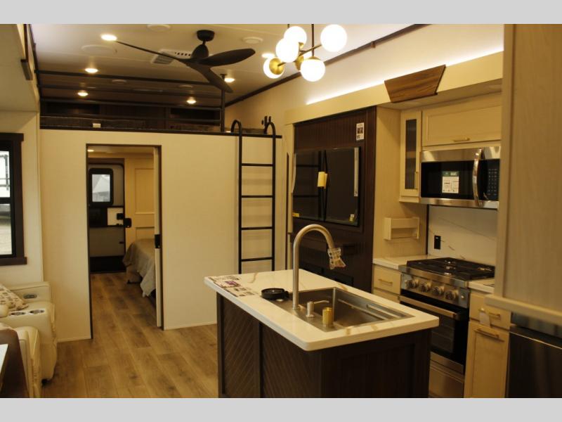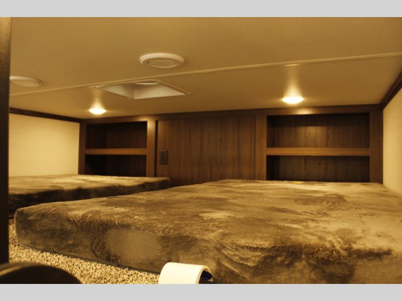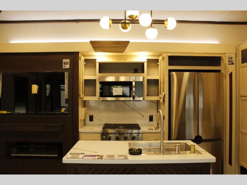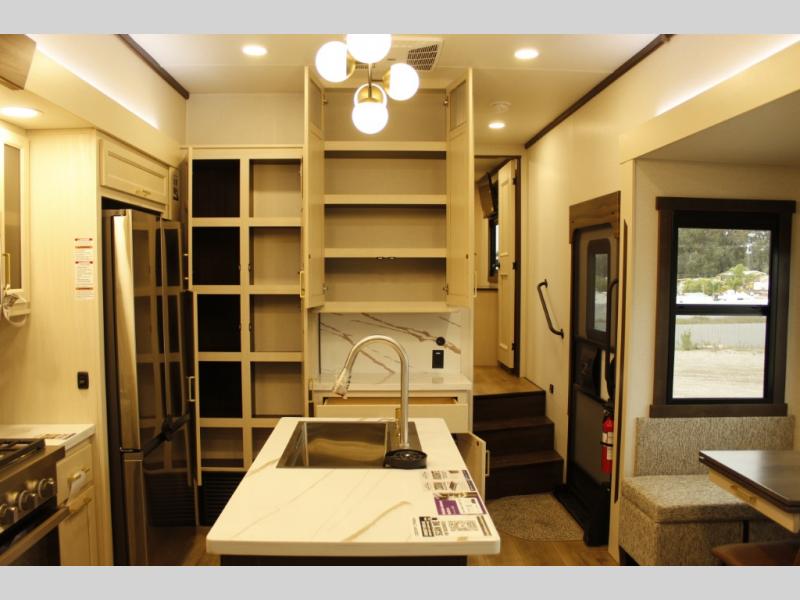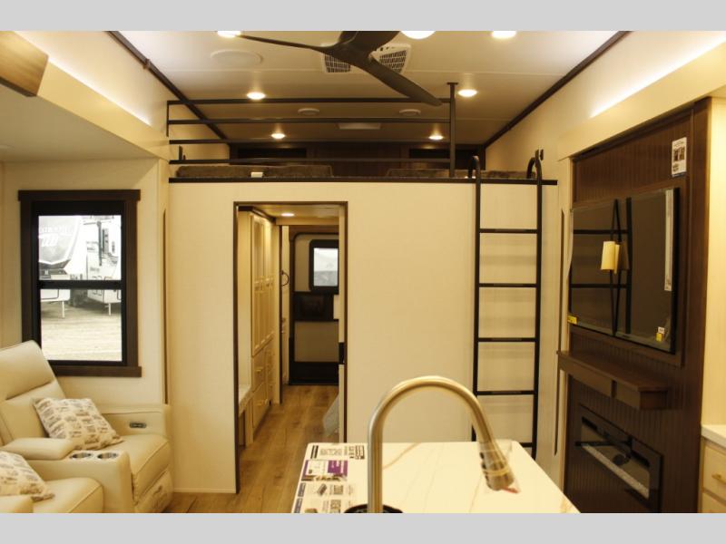 At the front of the fifth wheel, you’ll find one of the two spacious bedrooms, featuring a king bed in the slide-out for a restful night’s sleep. This bedroom is thoughtfully designed with a wardrobe, shelves, and a dresser topped with a TV, providing plenty of storage for clothing and essentials. Down the hall, a full bathroom awaits, complete with a shower featuring a built-in seat for added accessibility, linen shelves, and LED motion lighting under the vanity for convenient nighttime use. Moving toward the center, the main living area opens up with dual opposing slides, creating an inviting space to relax. One slide hosts the Murphy pantry, a 3-burner gas oven, a 30" over-the-range microwave, and a 20-cu. ft. stainless steel refrigerator, all complemented by a kitchen island with a sink for extra counter space. Opposite, the power theater seats and dining area with a table, chairs, and bench, offer a perfect spot to gather. At the rear, the second bedroom also features a king bed in a slide-out, a dresser, and its own full bathroom for added comfort and privacy. For even more sleeping space, a loft above includes two 40" x 67" bunk mats and additional cabinets, ideal for hosting family and guests.