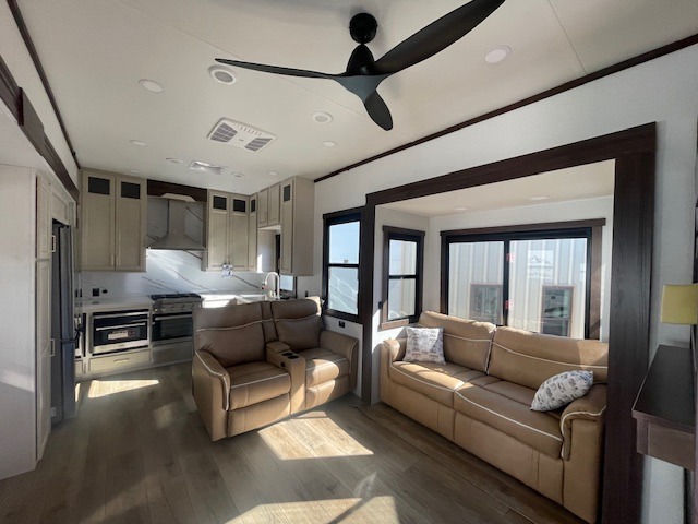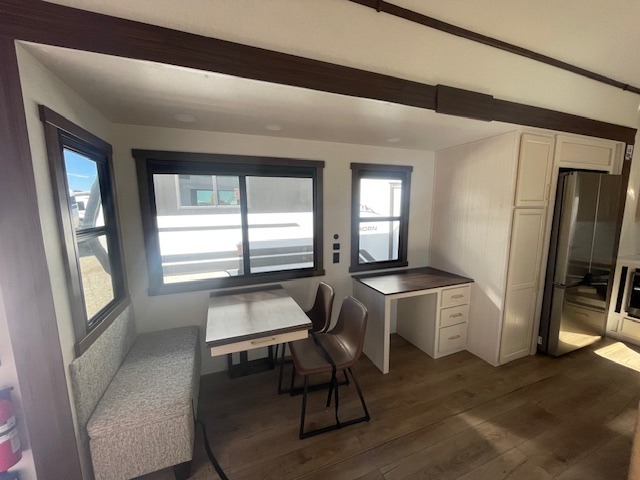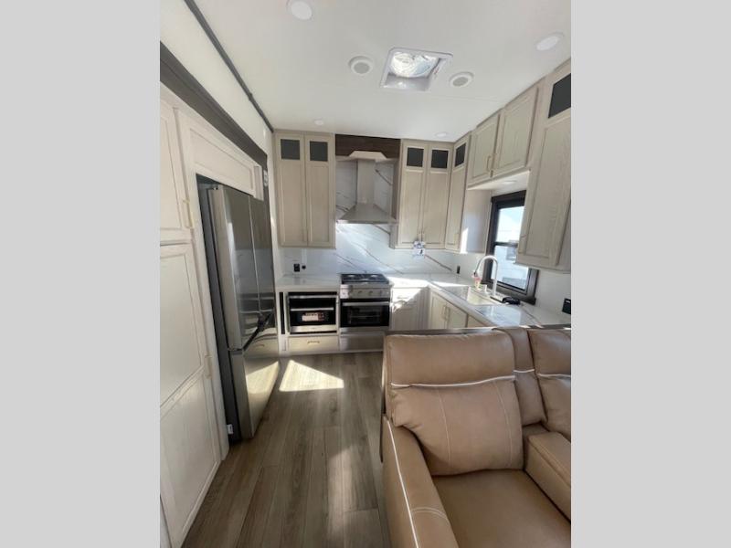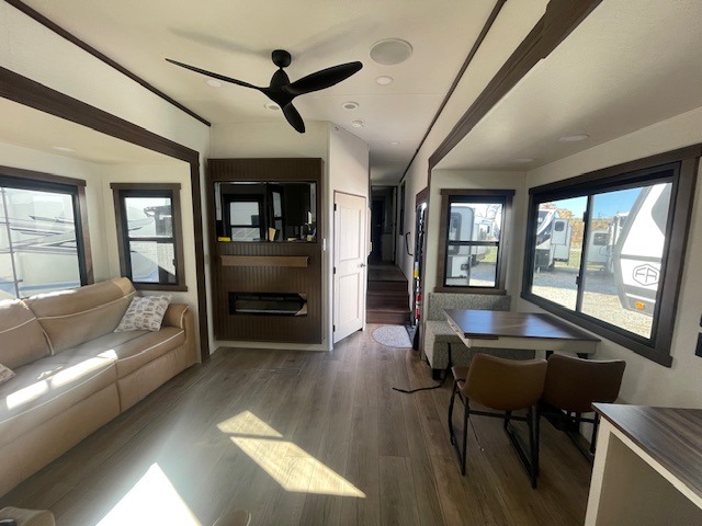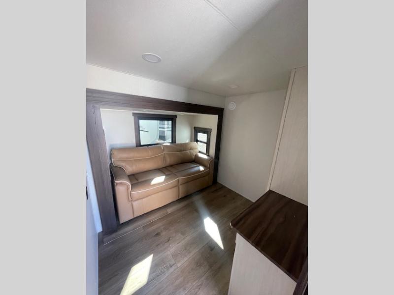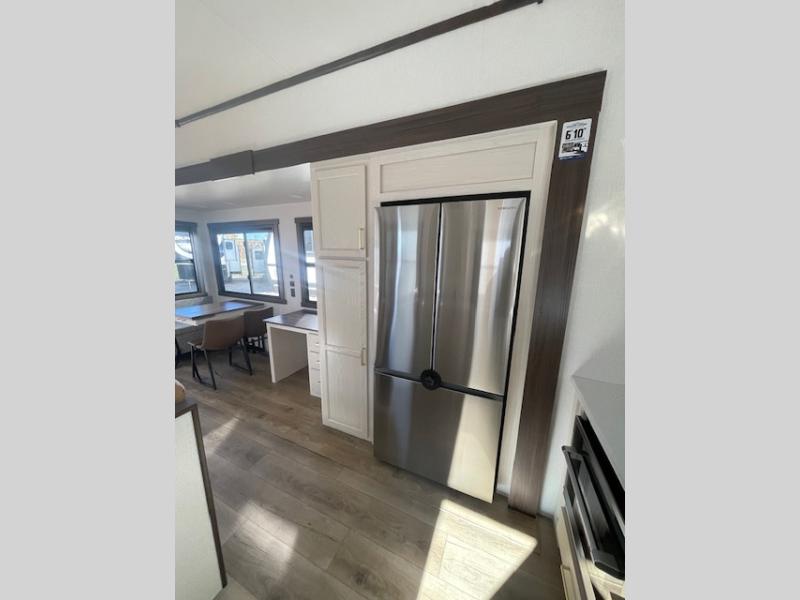At the front of the 39RKB fifth wheel, you’ll find the main bedroom featuring a king bed in a slide-out for a restful night’s sleep. This area also includes a large wardrobe with shelves and a dresser topped with a TV, offering plenty of storage for clothing and personal essentials. Moving down the hall, the full bathroom provides a touch of comfort and convenience with a shower featuring an upgraded shower head, an 18" high porcelain toilet with a top circular flush system, and linen shelves for added storage. In the center, a versatile middle room offers additional sleeping space with a 66" hide-a-bed sofa and a closet for extra storage, perfect for accommodating guests. Toward the rear, the living area and kitchen create a warm, inviting space for relaxation and entertainment. The living room includes another hide-a-bed sofa in one slide-out for both lounging and sleeping, complemented by a power theater seat for additional comfort. Across the room, the TV and fireplace make it an ideal spot for cozy movie nights. The opposite slide-out houses a dining table with chairs and a bench for shared meals or game nights, along with a 24" x 36" desk for a convenient work area. This same slide also features a 20-cu. ft. stainless steel refrigerator and a pantry to keep groceries and dry goods organized. At the very rear, the U-shaped kitchen boasts abundant overhead cabinets, a three-burner gas range, and a stainless-steel sink, providing an efficient and functional layout for all your cooking needs.