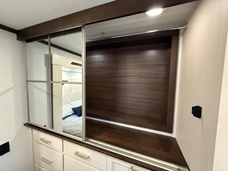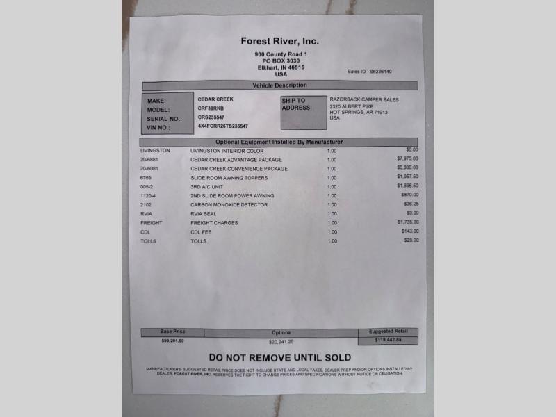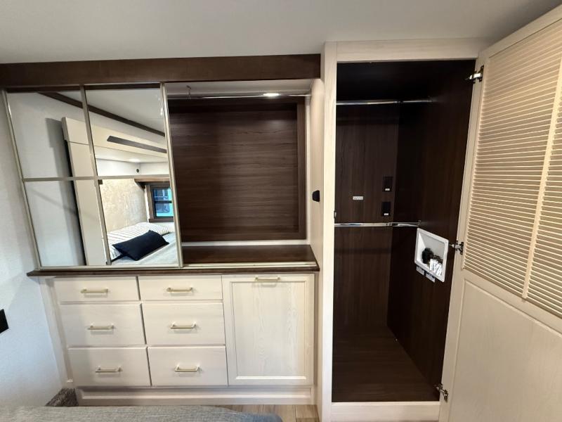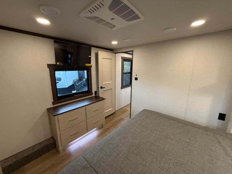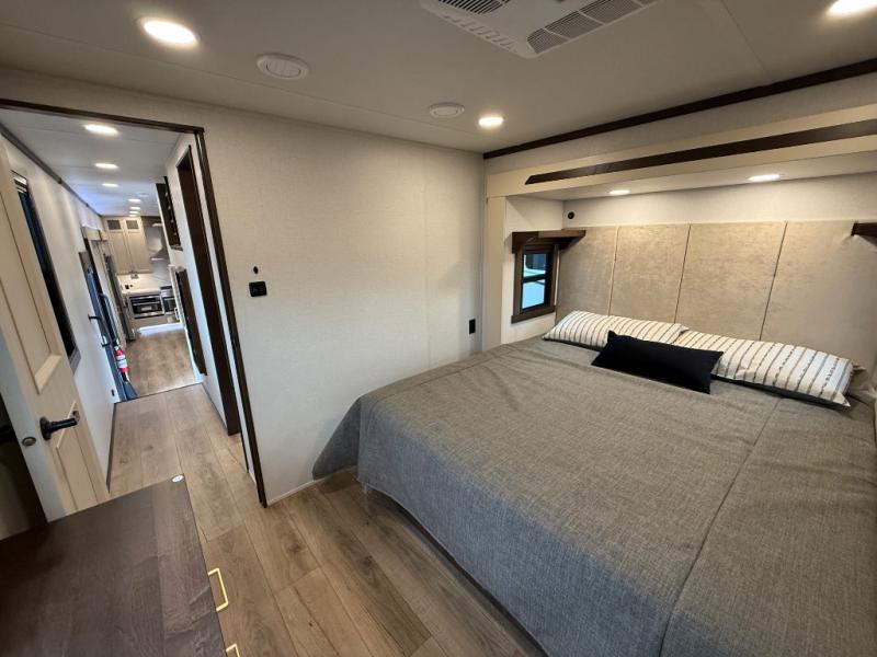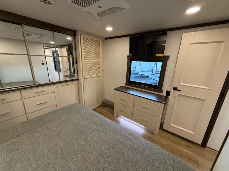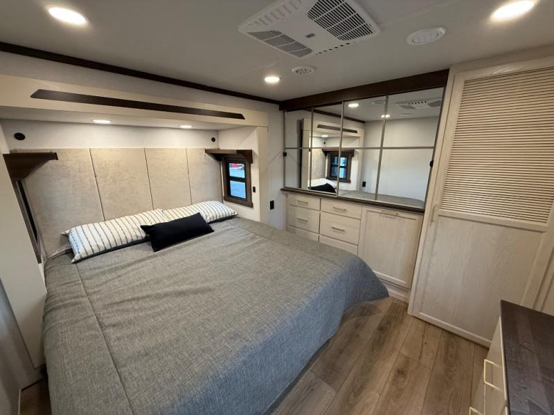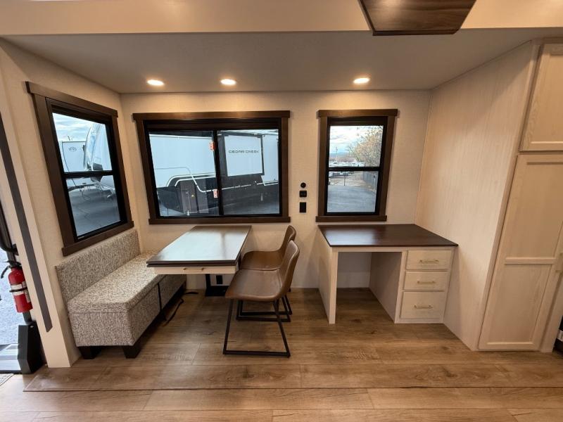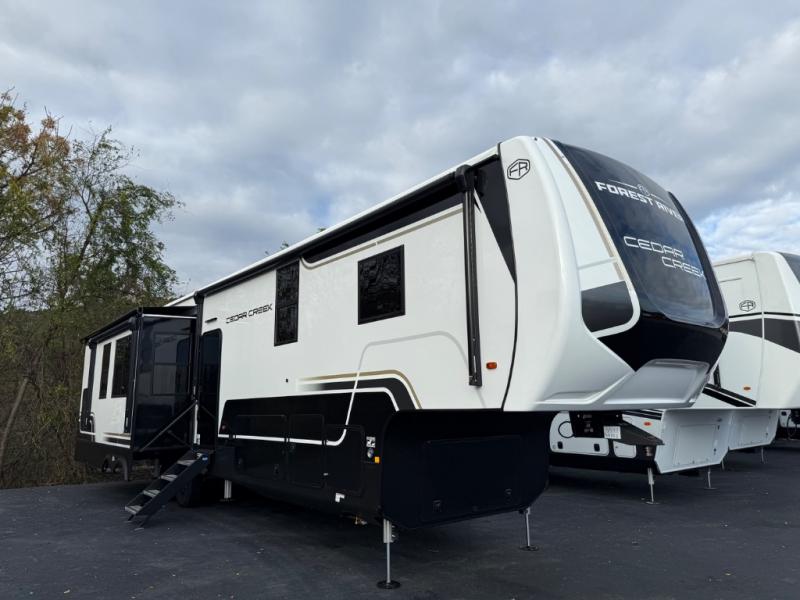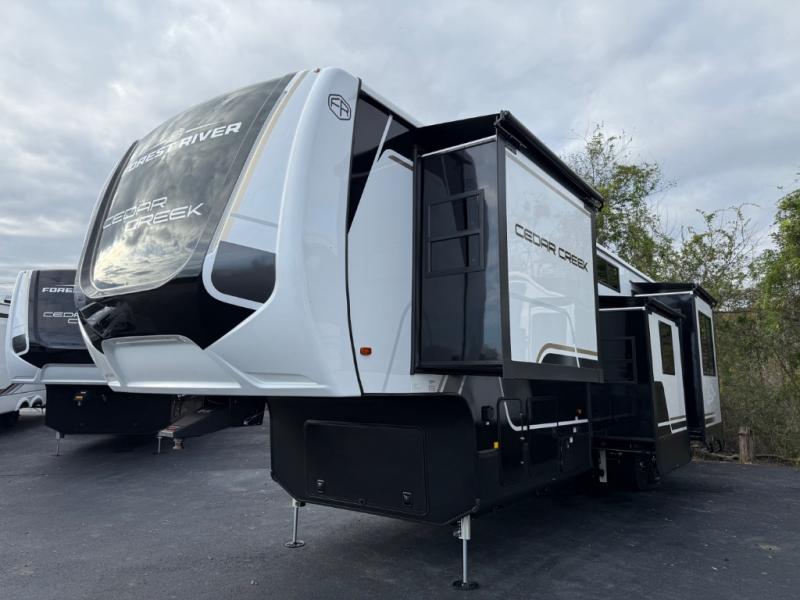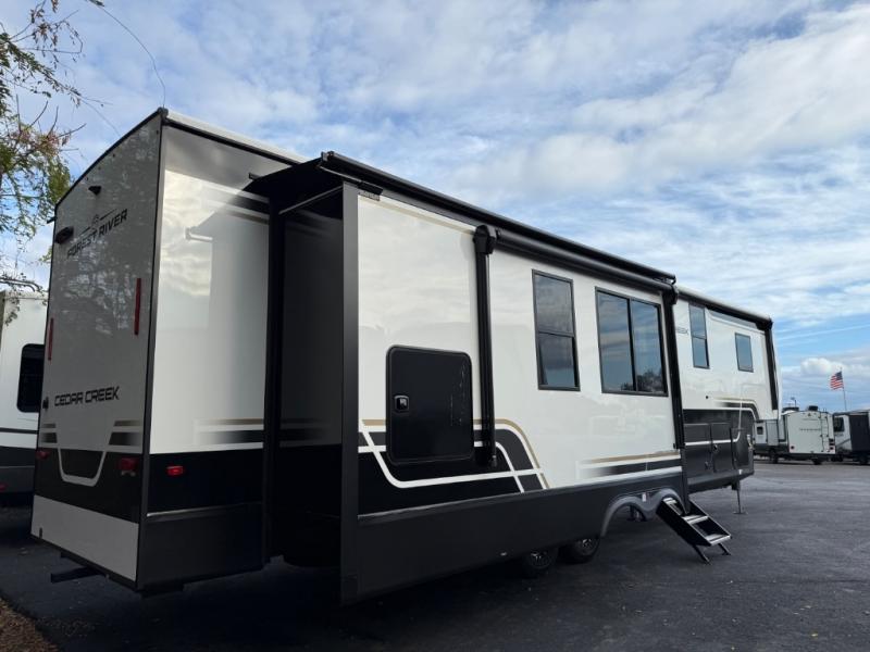 With any Cedar Creek fifth wheel by Forest River, you will find a quality-built RV with your comfort in mind! The all-aluminum super structure on 16" centers or less will provide a solid foundation to your fifth wheel, and the 3M bonded sidewalls will hold up and provide resistance to UV, heat, cold moisture, and even highway chemicals. Each model also includes a Road Warrior suspension for smooth towing, a 6-Point Hydraulic ,GEN 3 Leveling System, and a new 101" wide body frame. Inside, you'll enjoy walnut/two tone wooden cabinetry with hidden hinges, cutting board drawer with cut-out trash funnel, motion lighting in the bath and bedroom closet, plus many more comforts. The New Travelfi™ Pay-as-you go internet provides the ability to bring your own internet rather than relying solely on campground WiFi, and the "Rich Solar" 200W solar panel will give you off-grid capabilities!