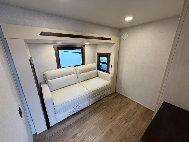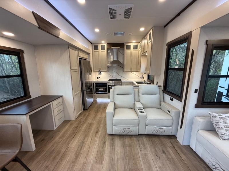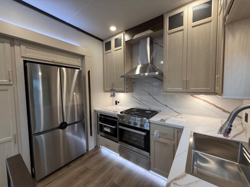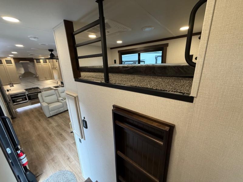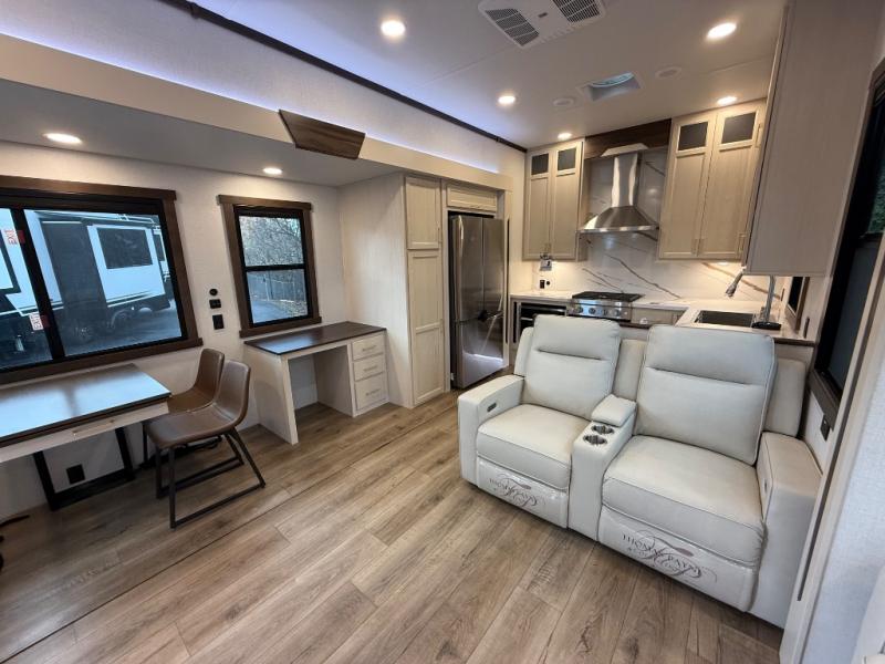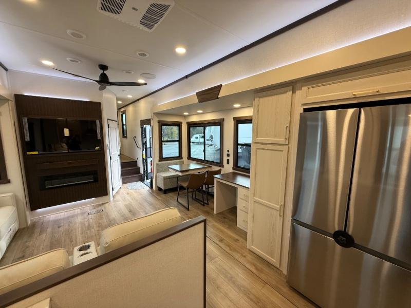 At the front of the 39RKB fifth wheel, you’ll find the main bedroom featuring a king bed in a slide-out for a restful night’s sleep. This area also includes a large wardrobe with shelves and a dresser topped with a TV, offering plenty of storage for clothing and personal essentials. Moving down the hall, the full bathroom provides a touch of comfort and convenience with a shower featuring an upgraded shower head, an 18" high porcelain toilet with a top circular flush system, and linen shelves for added storage. In the center, a versatile middle room offers additional sleeping space with a 66" hide-a-bed sofa and a closet for extra storage, perfect for accommodating guests. Toward the rear, the living area and kitchen create a warm, inviting space for relaxation and entertainment. The living room includes another hide-a-bed sofa in one slide-out for both lounging and sleeping, complemented by a power theater seat for additional comfort. Across the room, the TV and fireplace make it an ideal spot for cozy movie nights. The opposite slide-out houses a dining table with chairs and a bench for shared meals or game nights, along with a 24" x 36" desk for a convenient work area. This same slide also features a 20-cu. ft. stainless steel refrigerator and a pantry to keep groceries and dry goods organized. At the very rear, the U-shaped kitchen boasts abundant overhead cabinets, a three-burner gas range, and a stainless-steel sink, providing an efficient and functional layout for all your cooking needs.