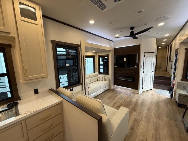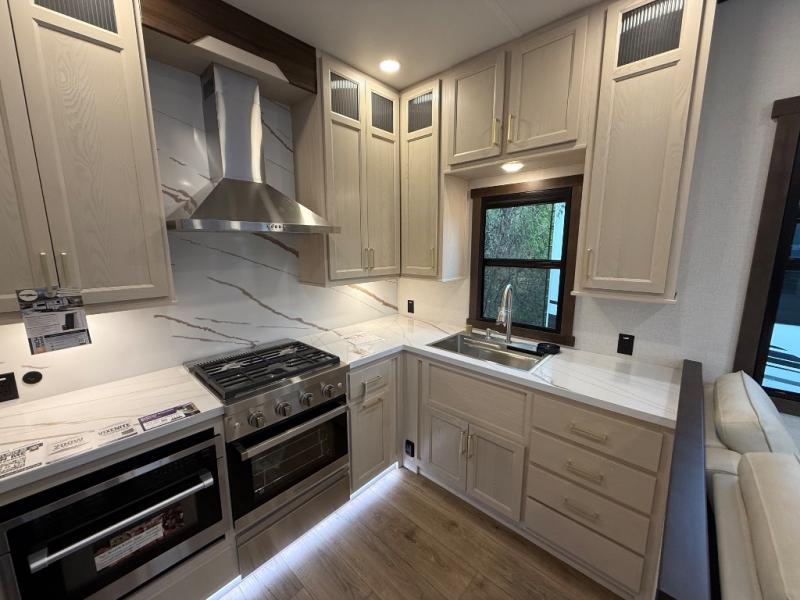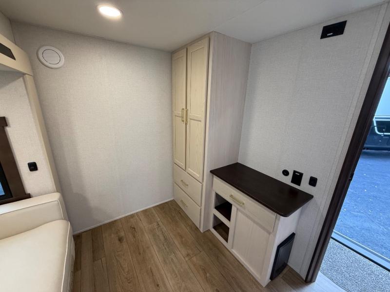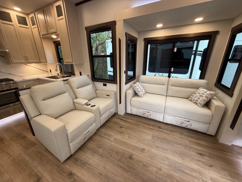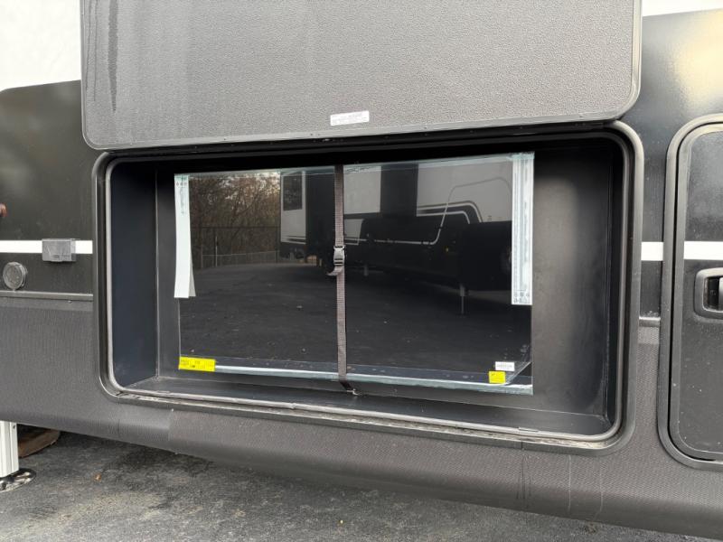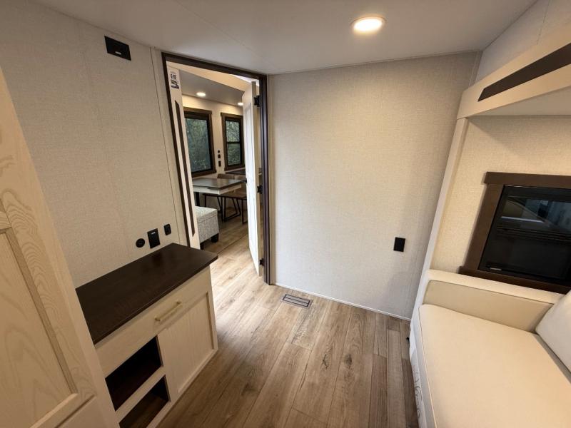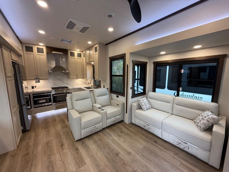 At the front of the 39RKB fifth wheel, you’ll find the main bedroom featuring a king bed in a slide-out for a restful night’s sleep. This area also includes a large wardrobe with shelves and a dresser topped with a TV, offering plenty of storage for clothing and personal essentials. Moving down the hall, the full bathroom provides a touch of comfort and convenience with a shower featuring an upgraded shower head, an 18" high porcelain toilet with a top circular flush system, and linen shelves for added storage. In the center, a versatile middle room offers additional sleeping space with a 66" hide-a-bed sofa and a closet for extra storage, perfect for accommodating guests. Toward the rear, the living area and kitchen create a warm, inviting space for relaxation and entertainment. The living room includes another hide-a-bed sofa in one slide-out for both lounging and sleeping, complemented by a power theater seat for additional comfort. Across the room, the TV and fireplace make it an ideal spot for cozy movie nights. The opposite slide-out houses a dining table with chairs and a bench for shared meals or game nights, along with a 24" x 36" desk for a convenient work area. This same slide also features a 20-cu. ft. stainless steel refrigerator and a pantry to keep groceries and dry goods organized. At the very rear, the U-shaped kitchen boasts abundant overhead cabinets, a three-burner gas range, and a stainless-steel sink, providing an efficient and functional layout for all your cooking needs.