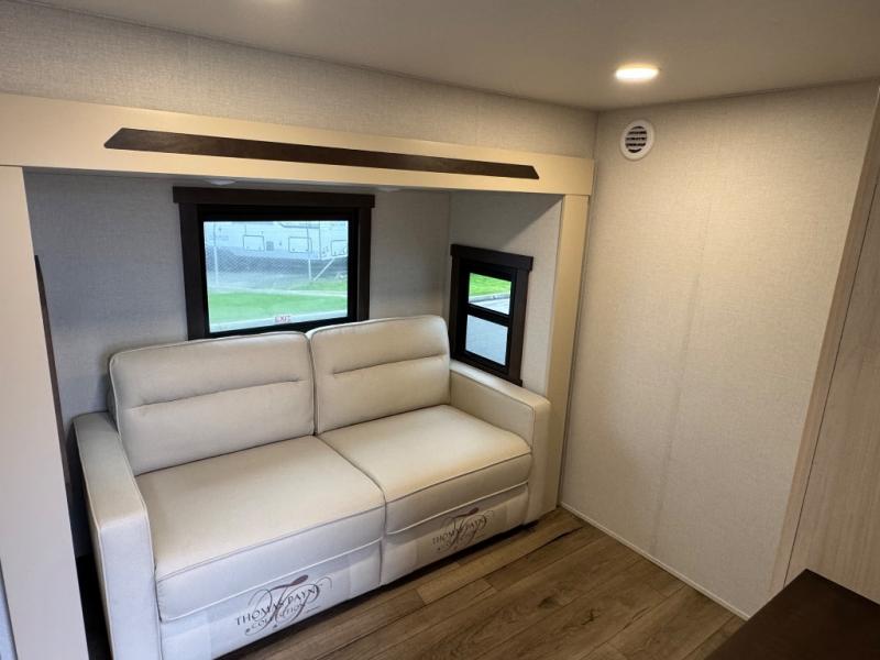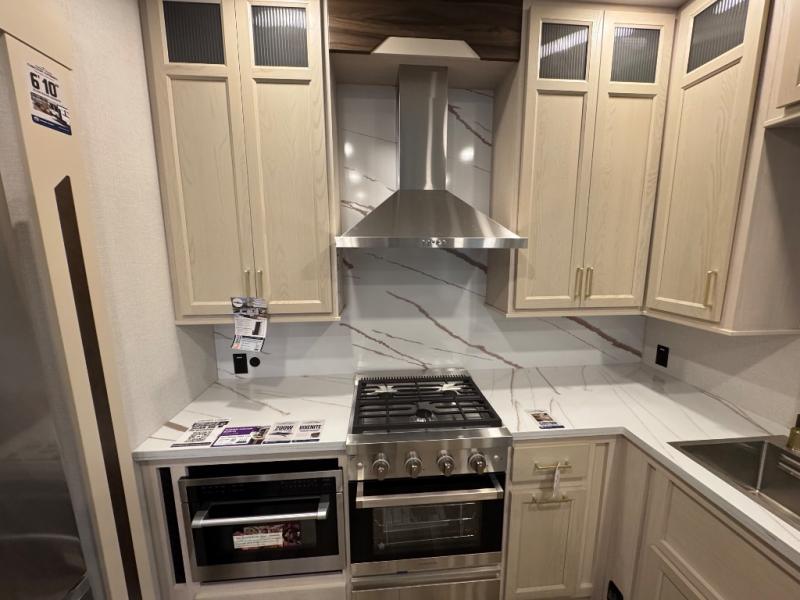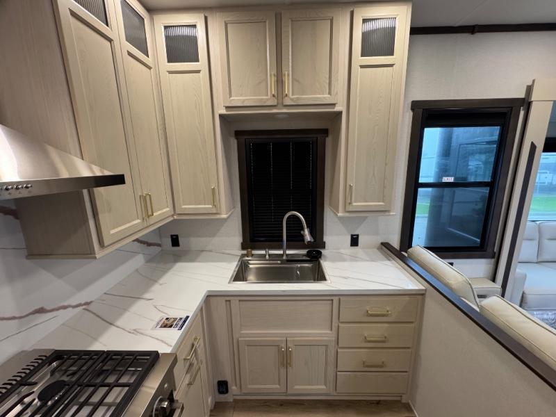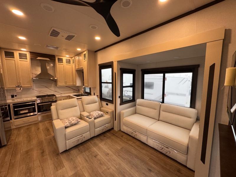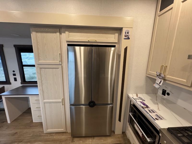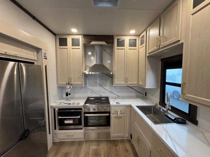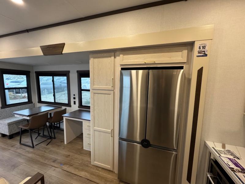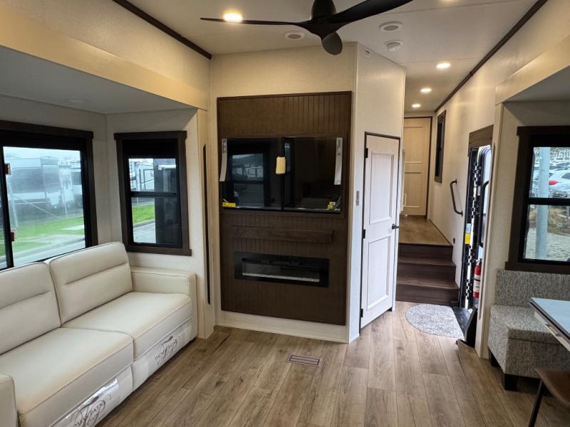 At the front of the 39RKB fifth wheel, you’ll find the main bedroom featuring a king bed in a slide-out for a restful night’s sleep. This area also includes a large wardrobe with shelves and a dresser topped with a TV, offering plenty of storage for clothing and personal essentials. Moving down the hall, the full bathroom provides a touch of comfort and convenience with a shower featuring an upgraded shower head, an 18" high porcelain toilet with a top circular flush system, and linen shelves for added storage. In the center, a versatile middle room offers additional sleeping space with a 66" hide-a-bed sofa and a closet for extra storage, perfect for accommodating guests. Toward the rear, the living area and kitchen create a warm, inviting space for relaxation and entertainment. The living room includes another hide-a-bed sofa in one slide-out for both lounging and sleeping, complemented by a power theater seat for additional comfort. Across the room, the TV and fireplace make it an ideal spot for cozy movie nights. The opposite slide-out houses a dining table with chairs and a bench for shared meals or game nights, along with a 24" x 36" desk for a convenient work area. This same slide also features a 20-cu. ft. stainless steel refrigerator and a pantry to keep groceries and dry goods organized. At the very rear, the U-shaped kitchen boasts abundant overhead cabinets, a three-burner gas range, and a stainless-steel sink, providing an efficient and functional layout for all your cooking needs.
